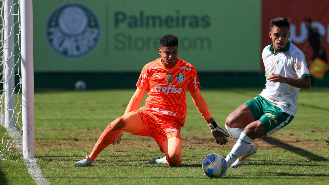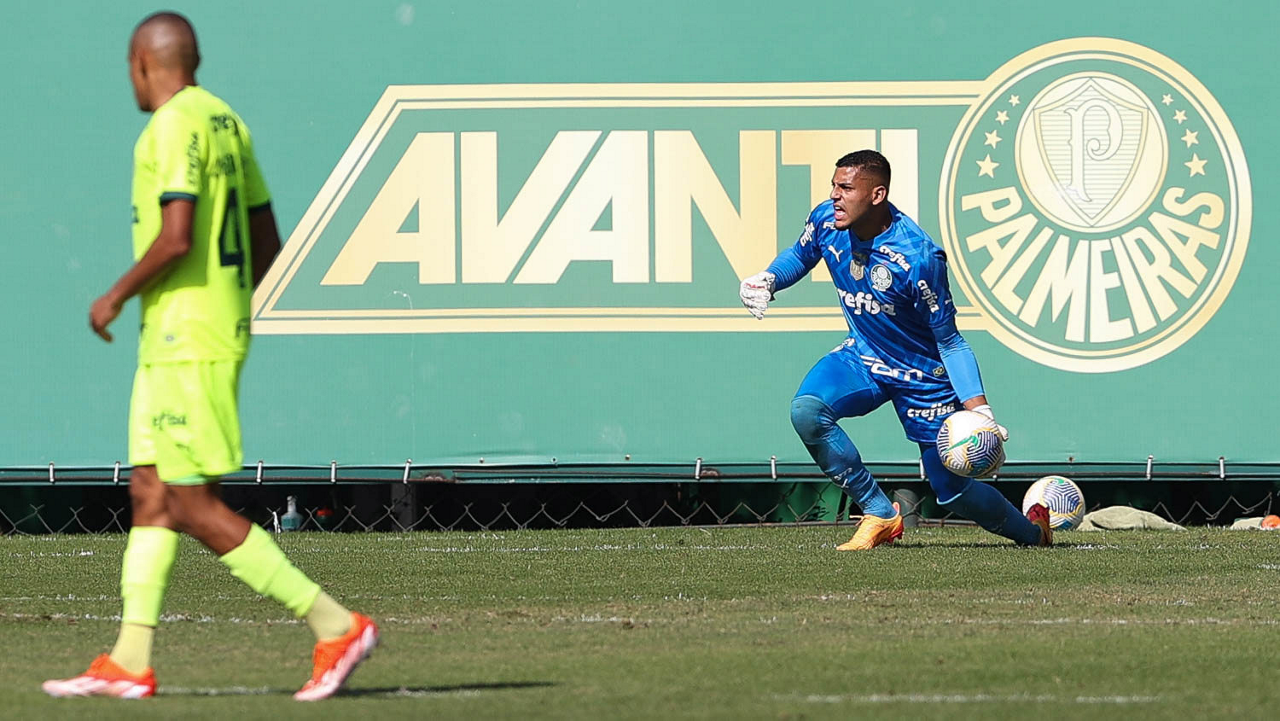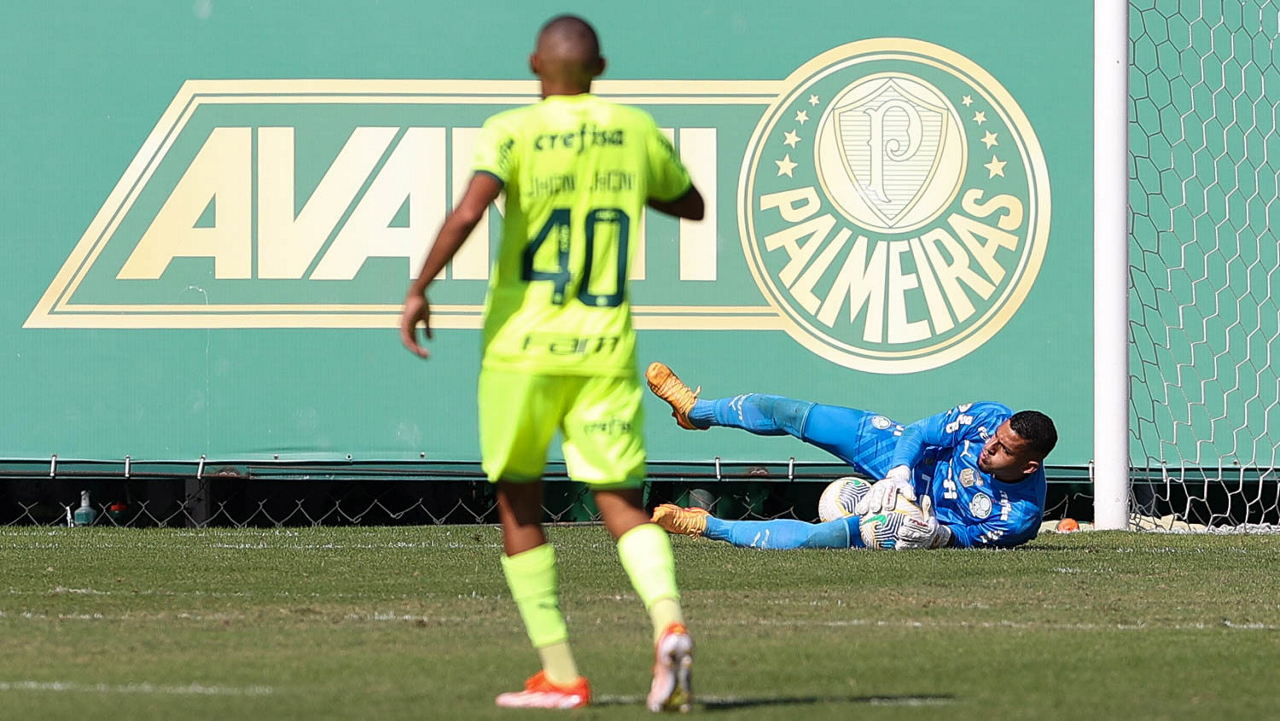 O goleiro Kaique, da SE Palmeiras, durante jogo-treino, na Academia de Futebol. (Foto: Cesar Greco/Palmeiras/by Canon)