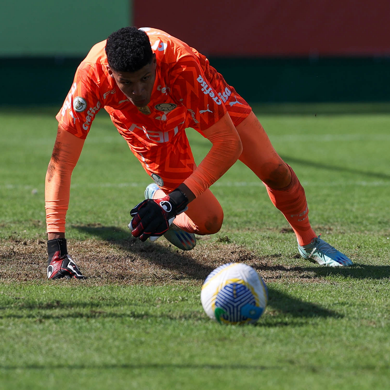 O goleiro Mateus, da SE Palmeiras, durante jogo-treino, na Academia de Futebol. (Foto: Cesar Greco/Palmeiras/by Canon)