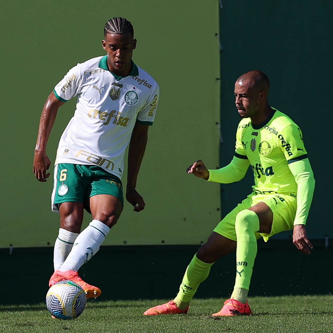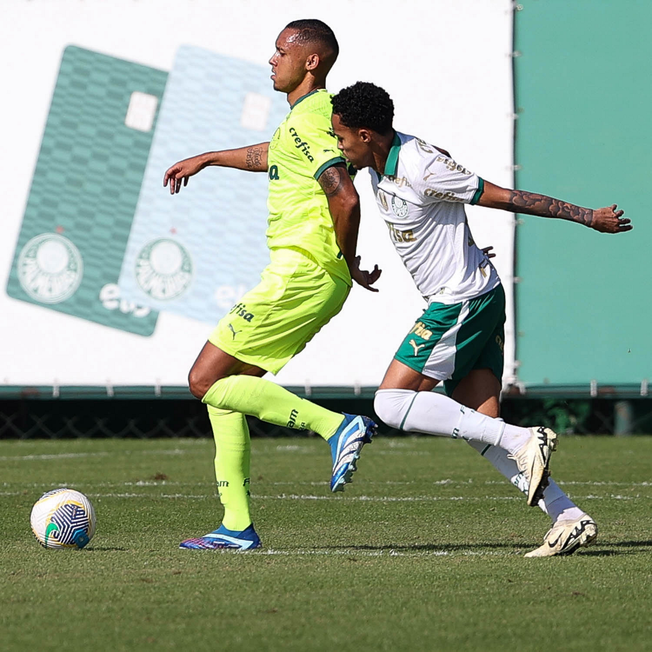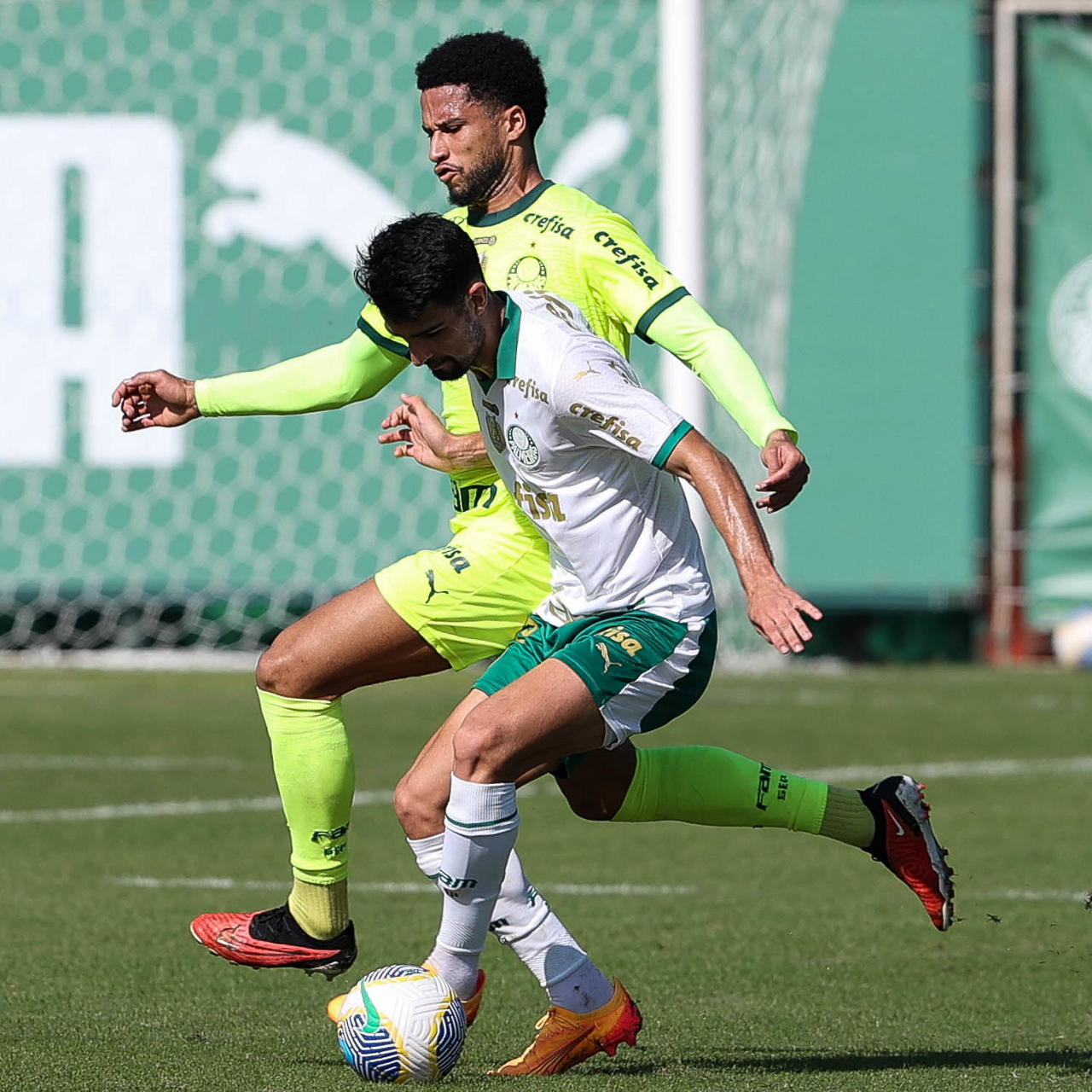 Os jogadores Mayke e Gabriel Menino (D), da SE Palmeiras, durante jogo-treino, na Academia de Futebol. (Foto: Cesar Greco/Palmeiras/by Canon)