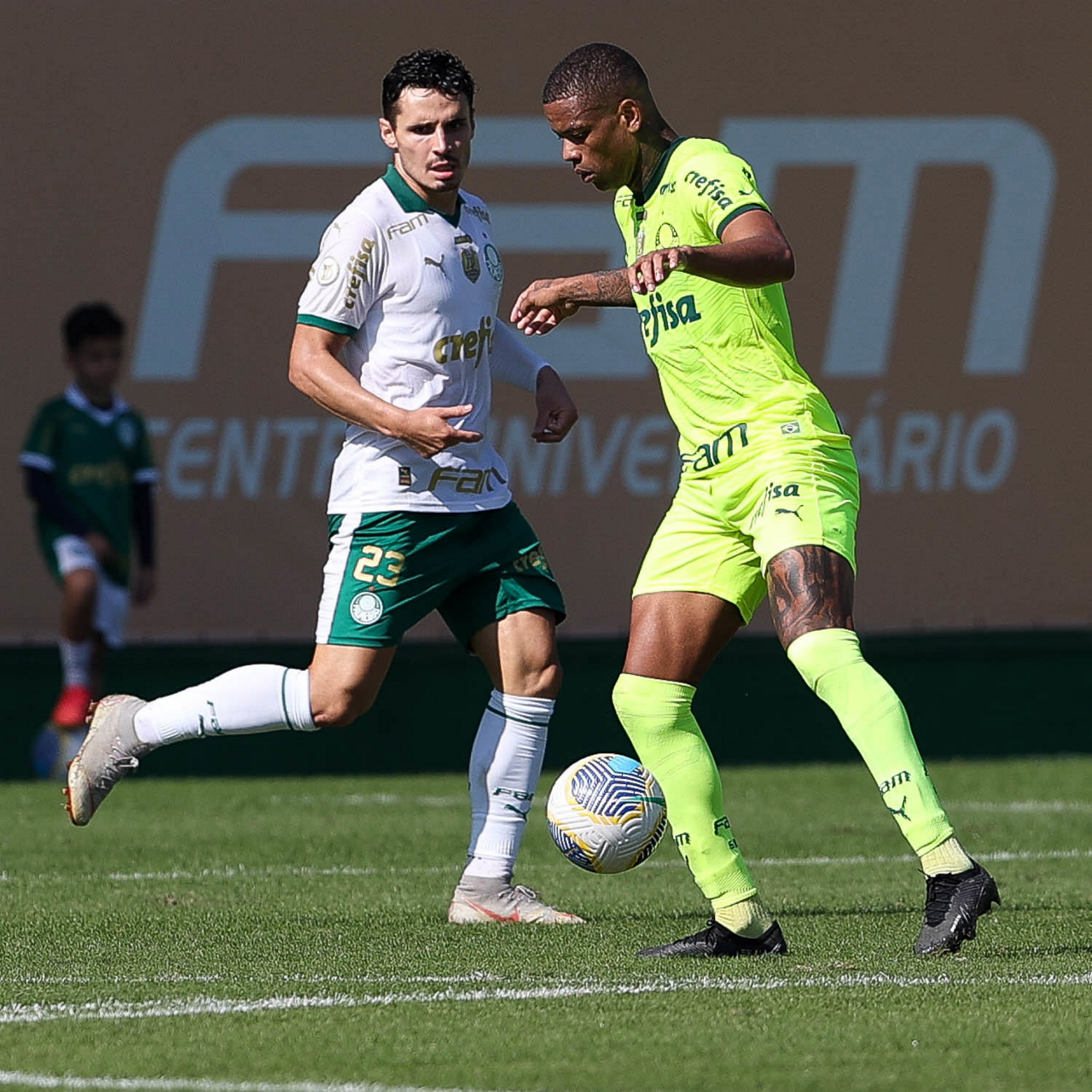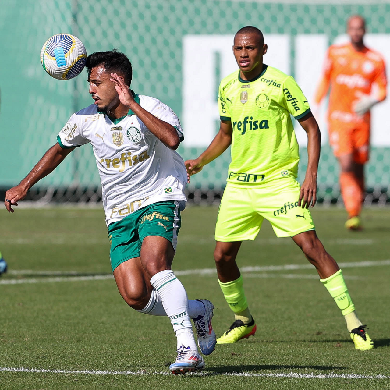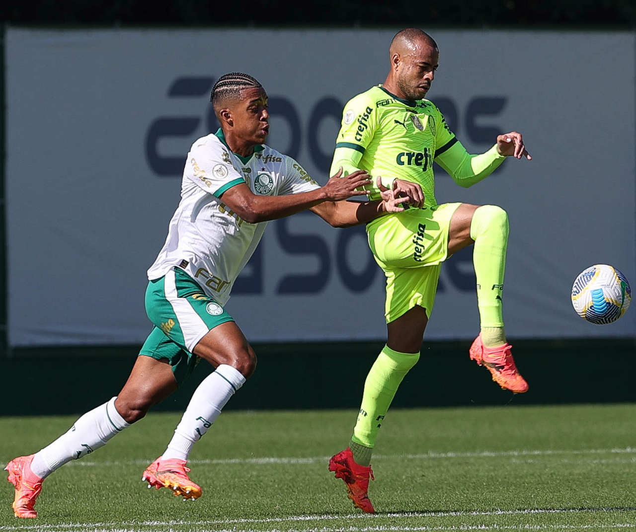 Os jogadores Mayke e Gabriel Menino (D), da SE Palmeiras, durante jogo-treino, na Academia de Futebol. (Foto: Cesar Greco/Palmeiras/by Canon)