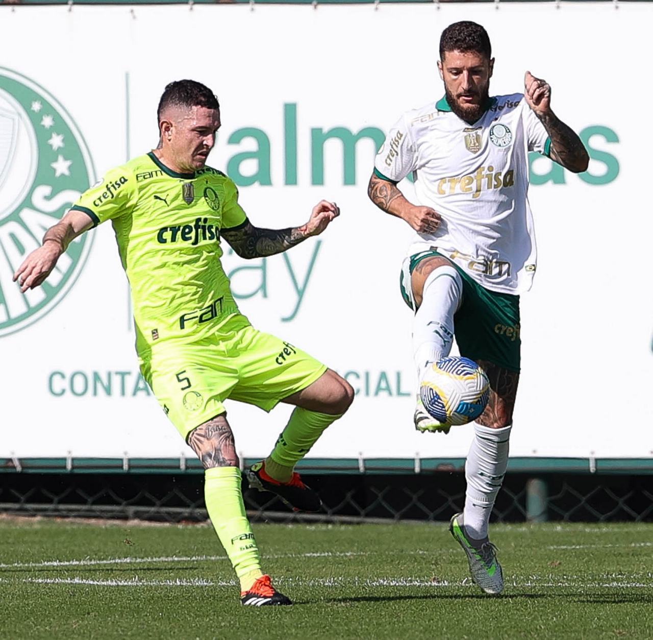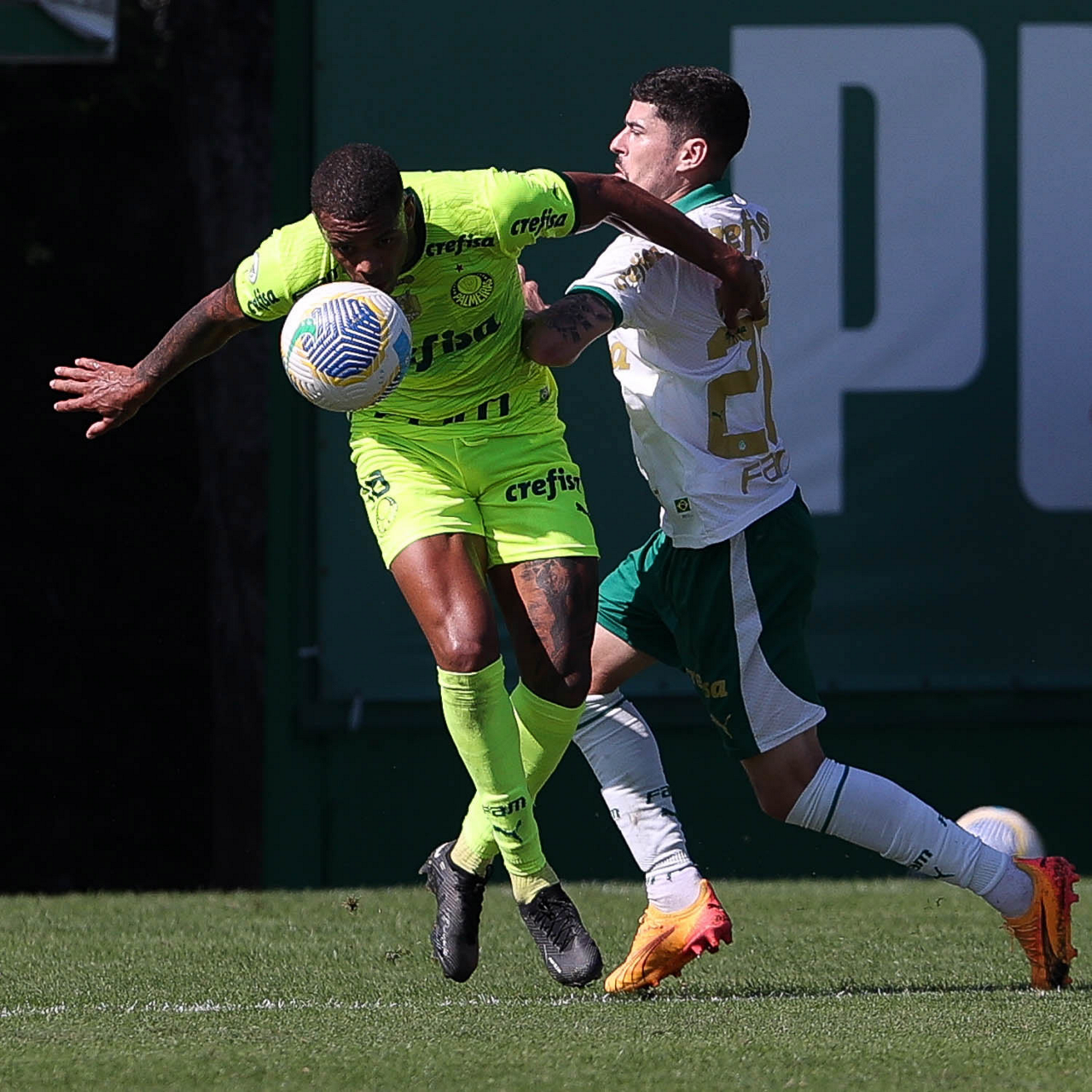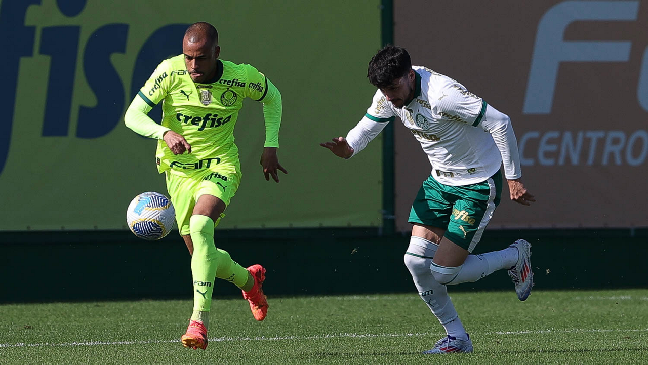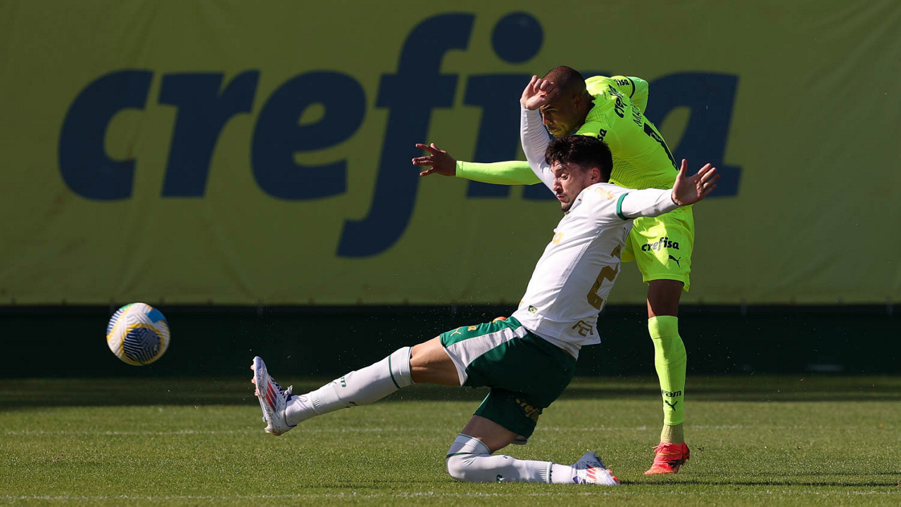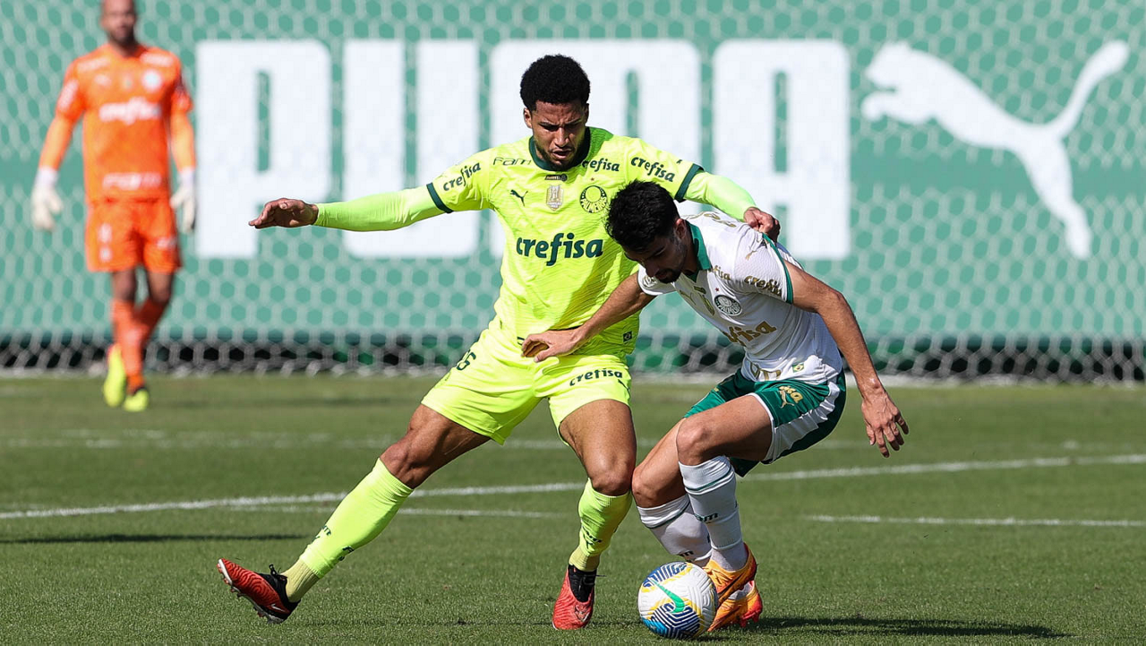 Os jogadores Mayke e Joaquín Piquerez (E), da SE Palmeiras, durante jogo-treino, na Academia de Futebol. (Foto: Cesar Greco/Palmeiras/by Canon)