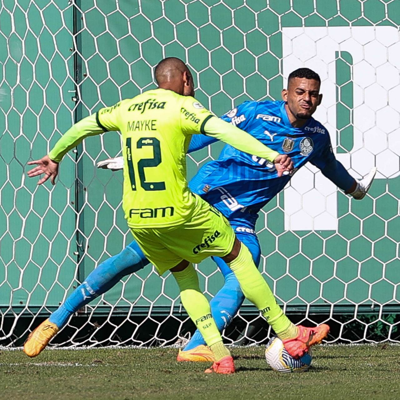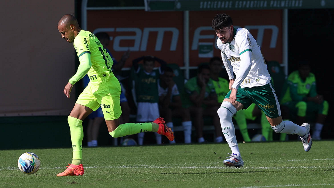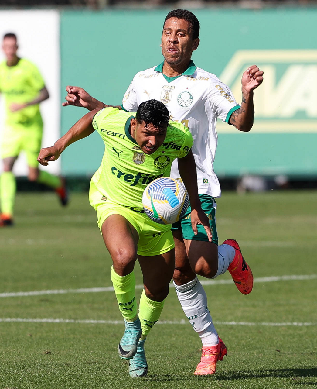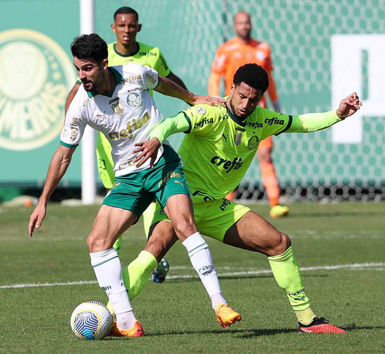 Os jogadores Mayke e Joaquín Piquerez (E), da SE Palmeiras, durante jogo-treino, na Academia de Futebol. (Foto: Cesar Greco/Palmeiras/by Canon)