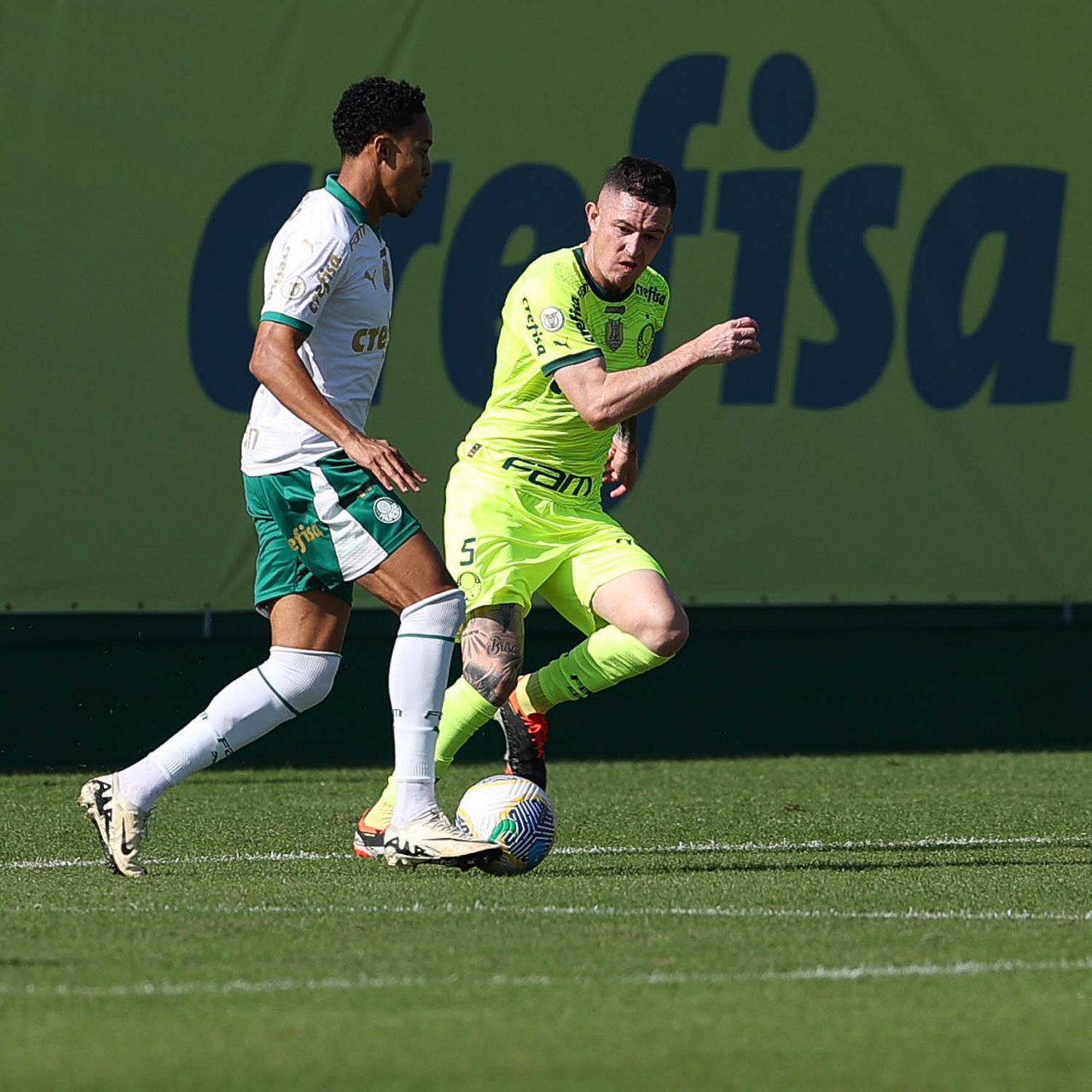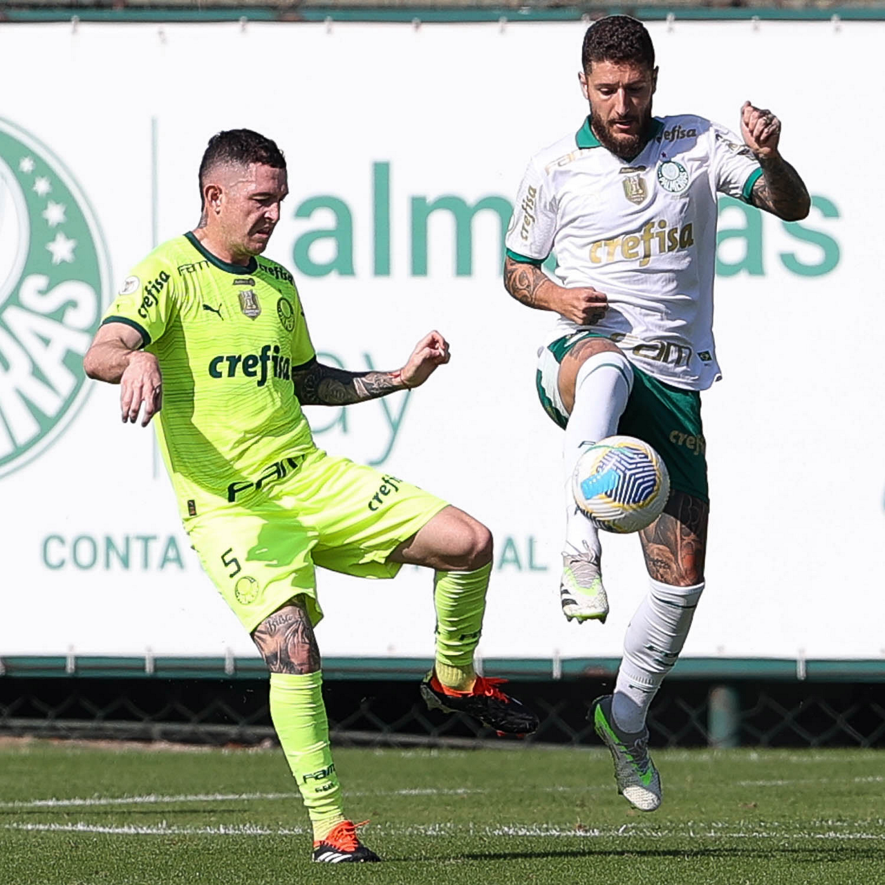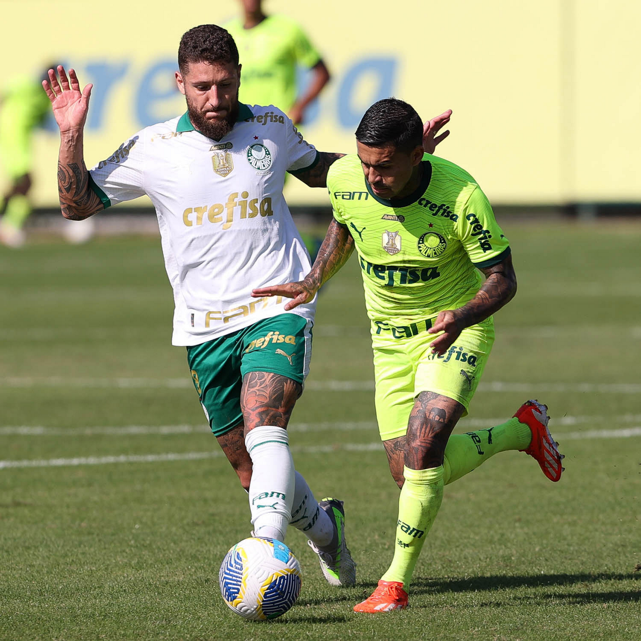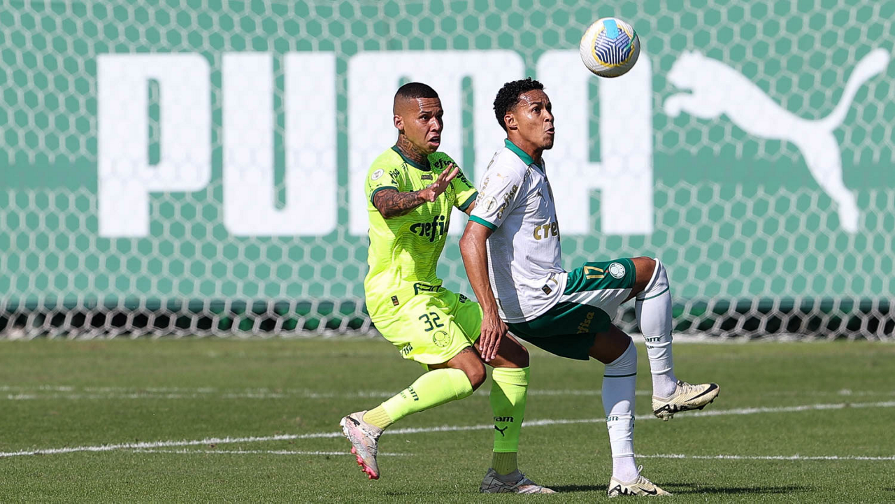 Os jogadores Mayke e Joaquín Piquerez (E), da SE Palmeiras, durante jogo-treino, na Academia de Futebol. (Foto: Cesar Greco/Palmeiras/by Canon)