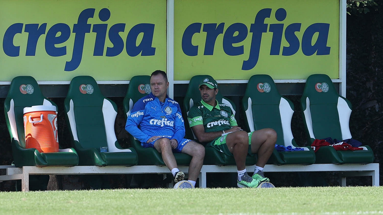 O técnico Abel Ferreira e o auxiliar técnico Andrey Lopes (E), da SE Palmeiras, durante jogo-treino, na Academia de Futebol. (Foto: Cesar Greco/Palmeiras/by Canon)