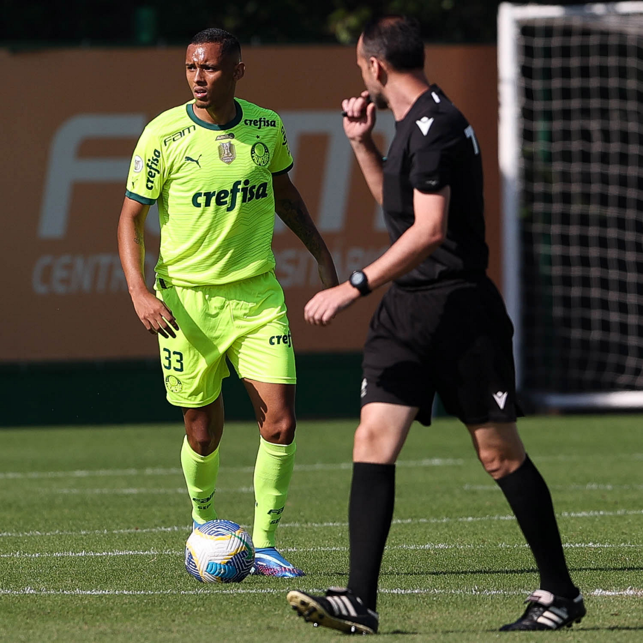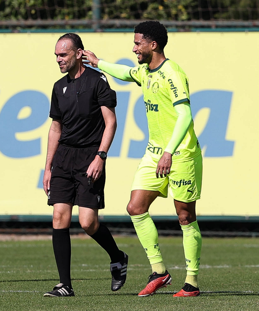 O treino de arbitragem e os jogadores Mayke e Lázaro (D), da SE Palmeiras, durante jogo-treino, na Academia de Futebol. (Foto: Cesar Greco/Palmeiras/by Canon)