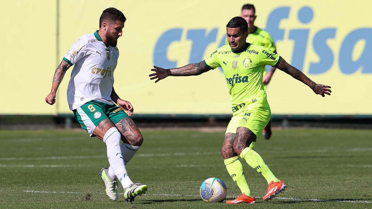 Os jogadores Zé Rafael e Dudu (E), da SE Palmeiras, durante jogo-treino, na Academia de Futebol. (Foto: Cesar Greco/Palmeiras/by Canon)