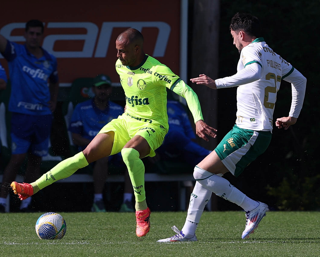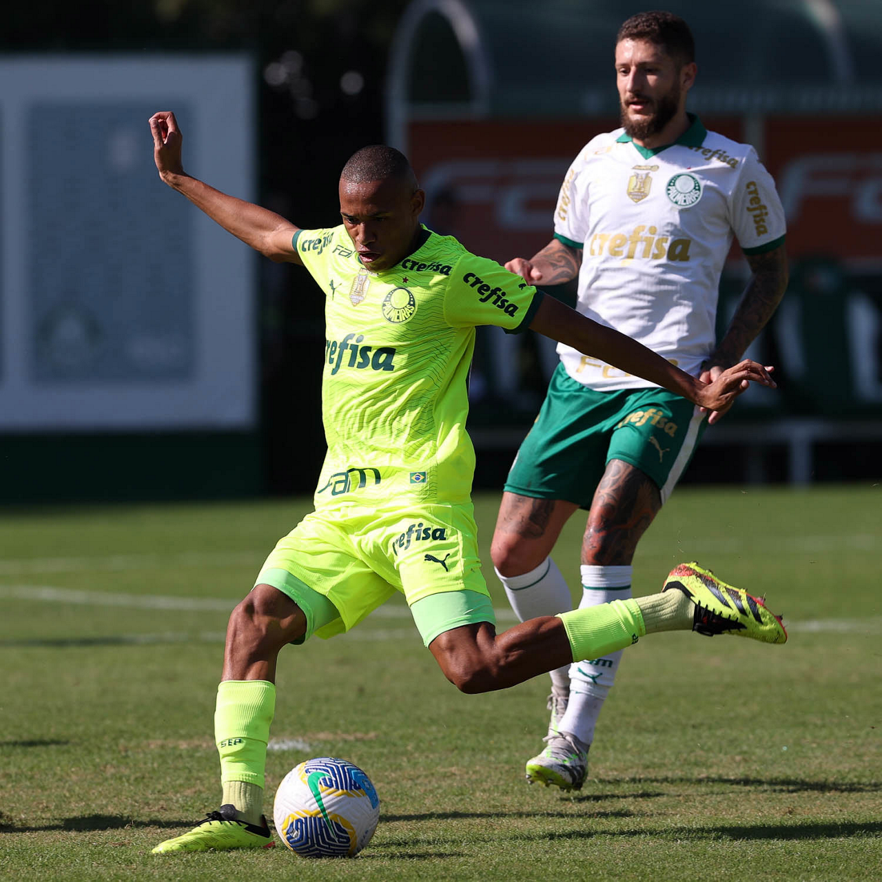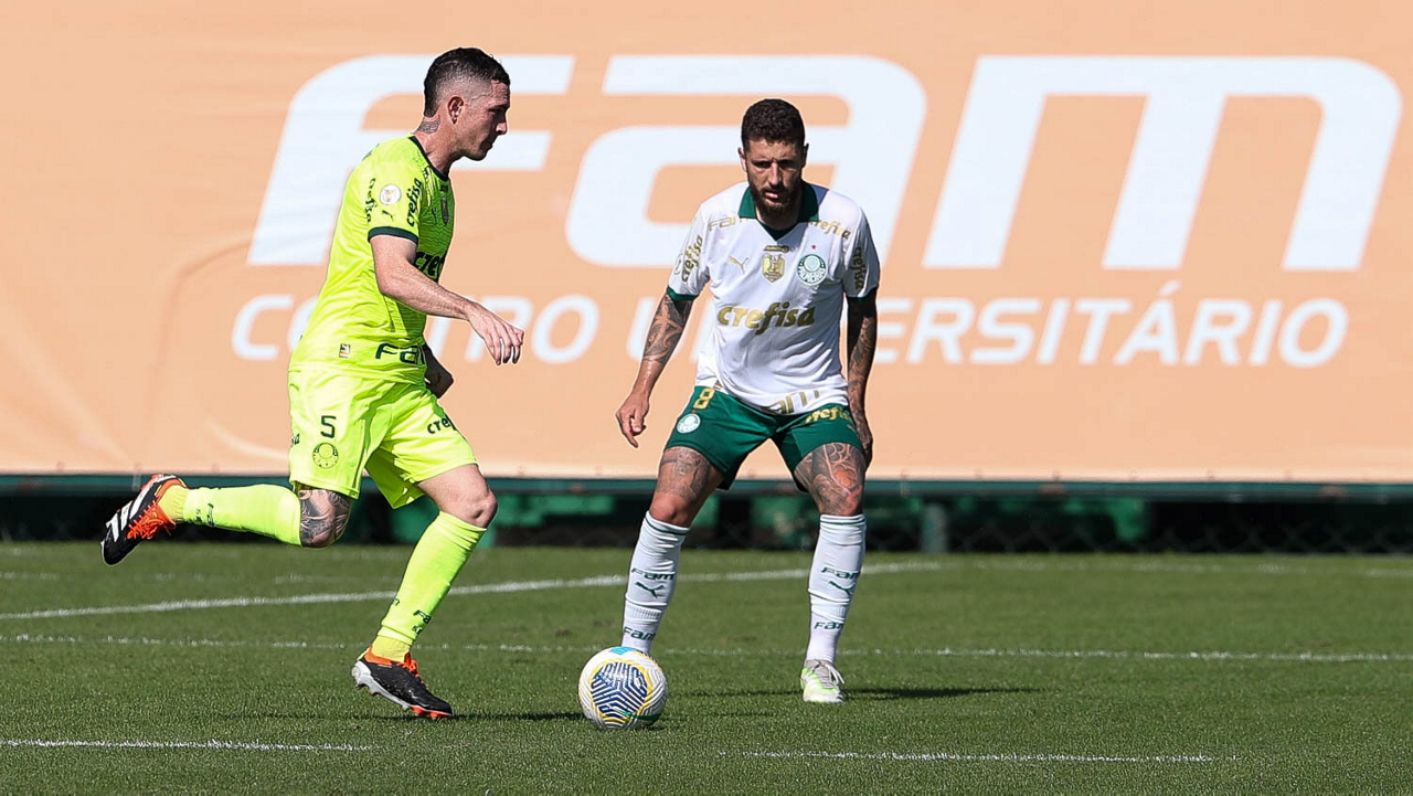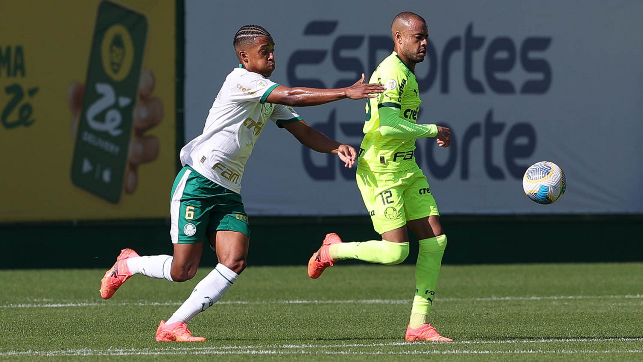 Os jogadores Mayke e Joaquín Piquerez (D), da SE Palmeiras, durante jogo-treino, na Academia de Futebol. (Foto: Cesar Greco/Palmeiras/by Canon)