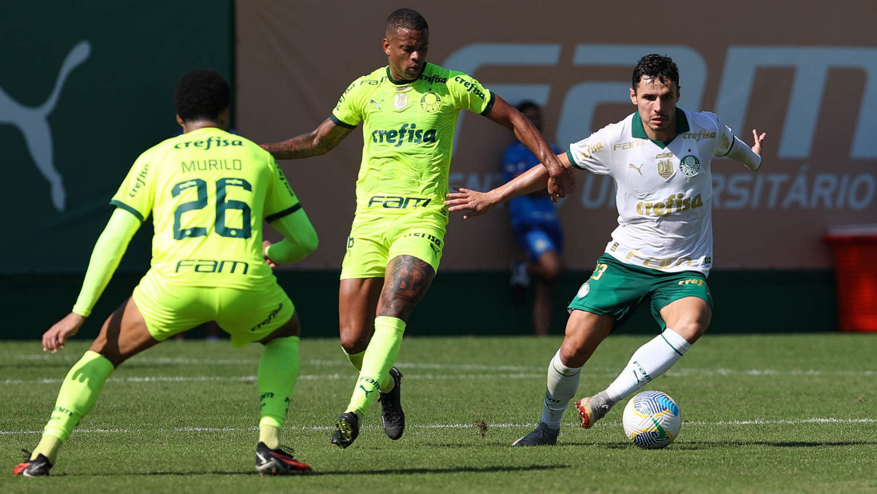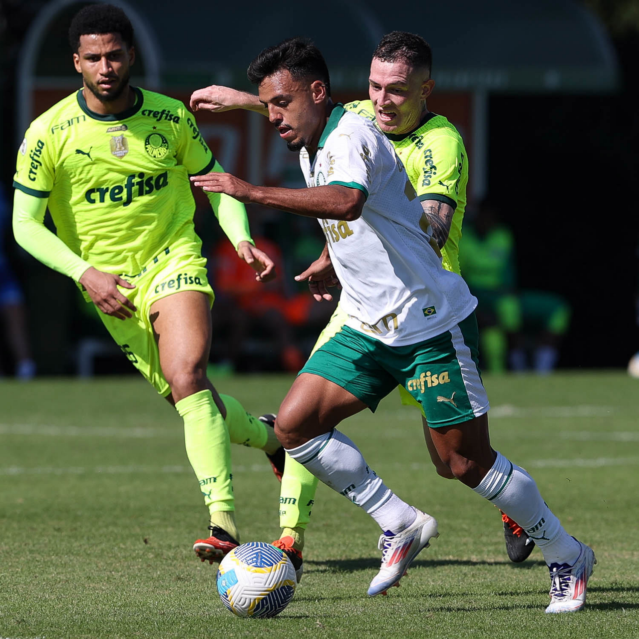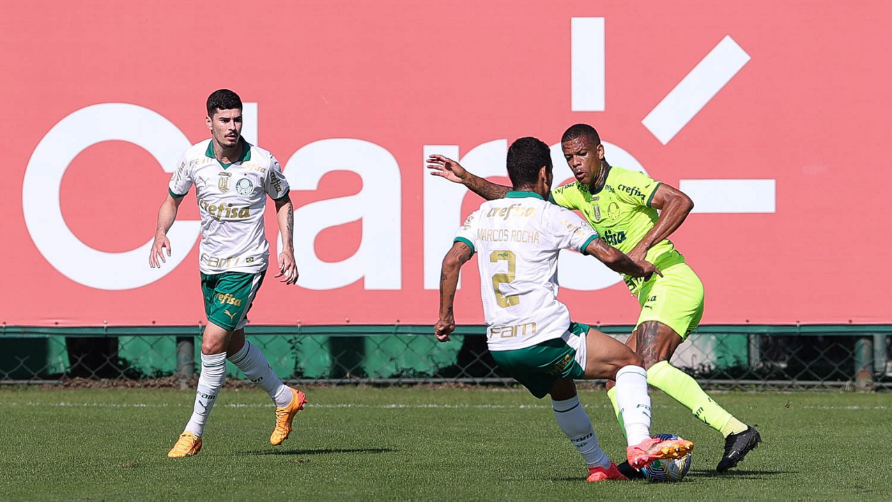 Os jogadores Garcia, Gabriel Menino e Vanderlan (E/D), da SE Palmeiras, durante jogo-treino, na Academia de Futebol. (Foto: Cesar Greco/Palmeiras/by Canon)