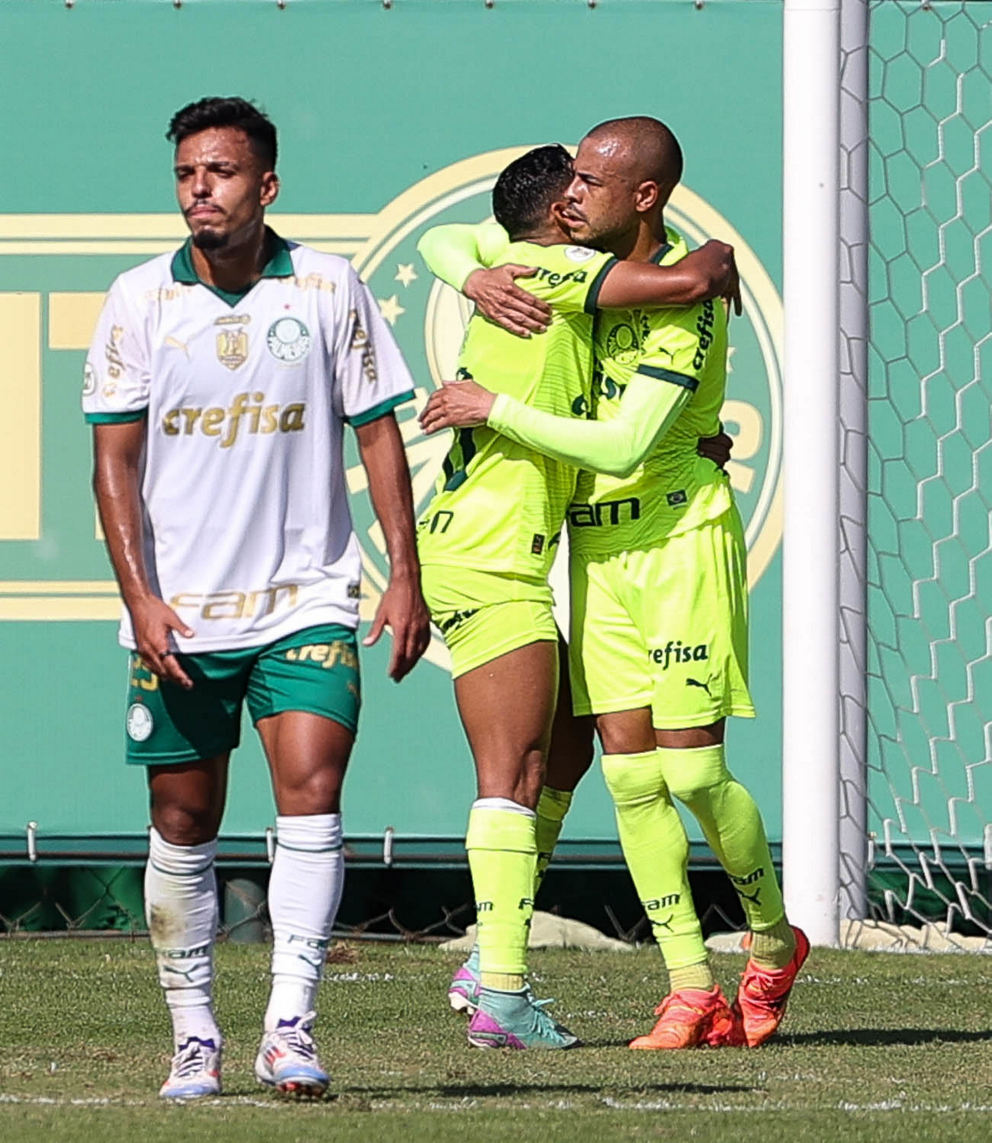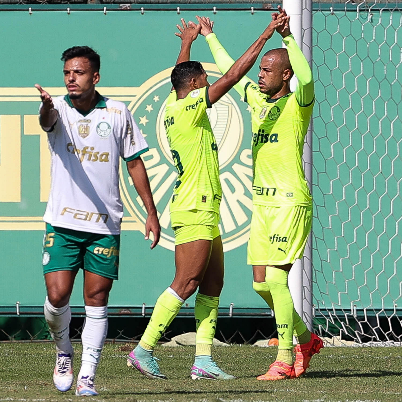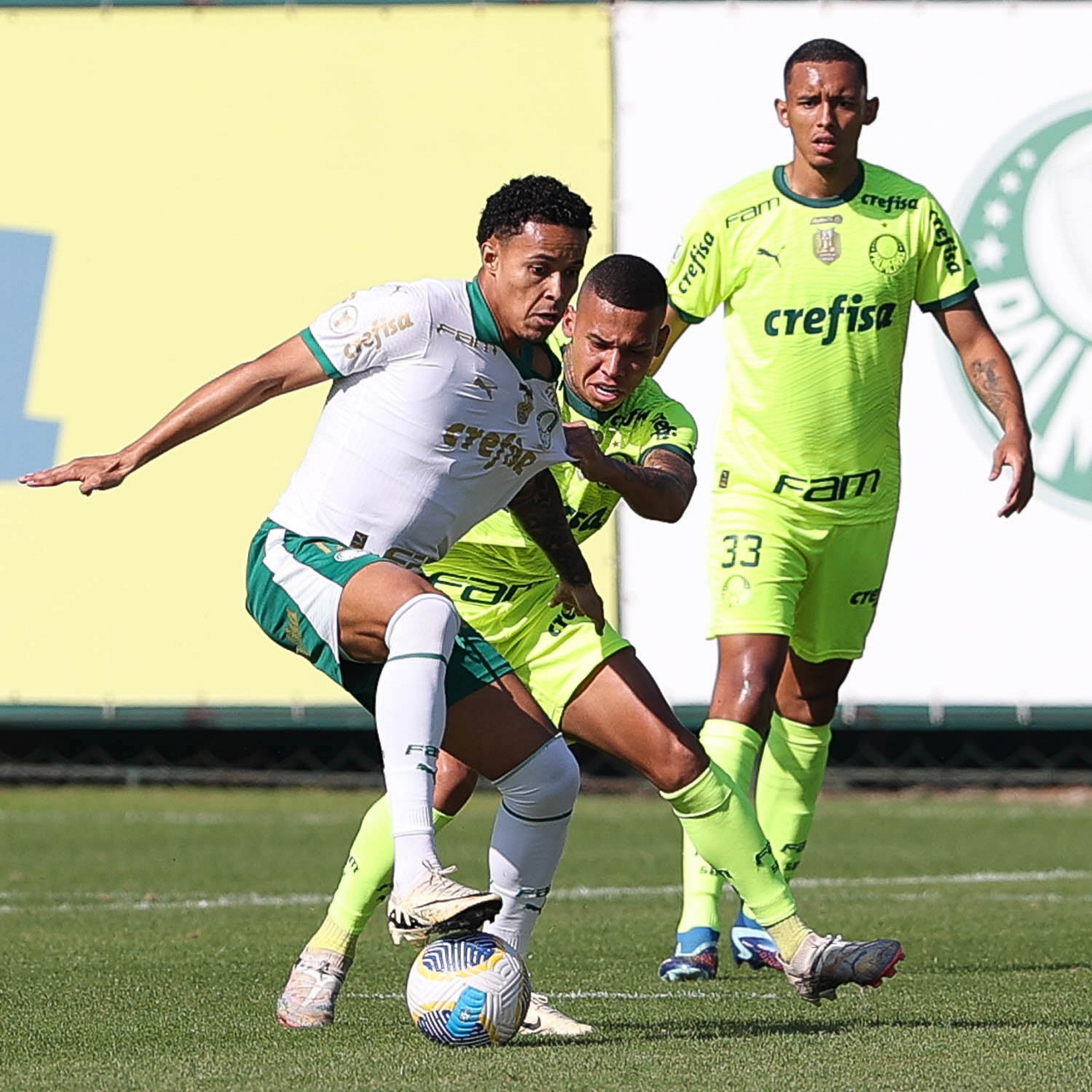 Os jogadores Garcia, Gabriel Menino e Vanderlan (E/D), da SE Palmeiras, durante jogo-treino, na Academia de Futebol. (Foto: Cesar Greco/Palmeiras/by Canon)