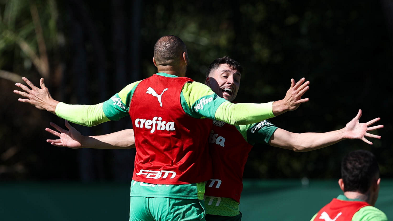 O goleiro Weverton e o jogador Joaquín Piquerez (D), da SE Palmeiras, durante treinamento, na Academia de Futebol. (Foto: Cesar Greco/Palmeiras/by Canon)
