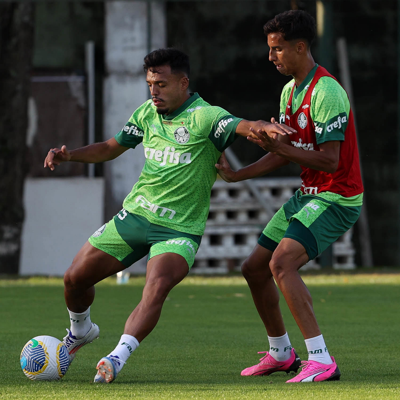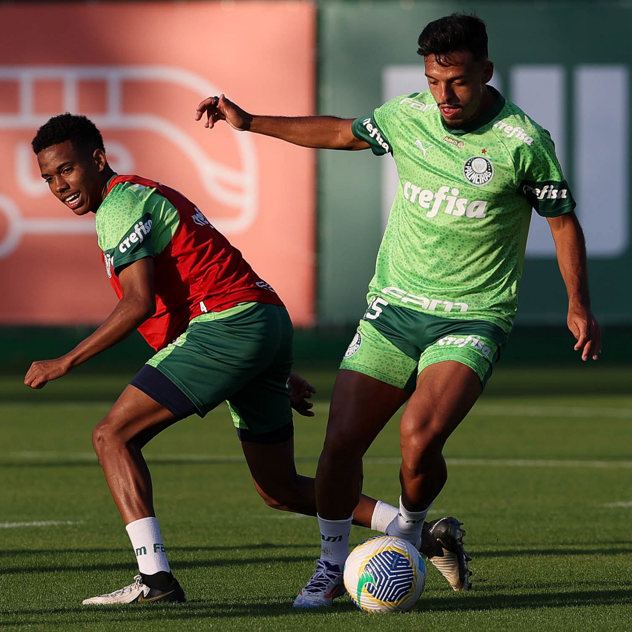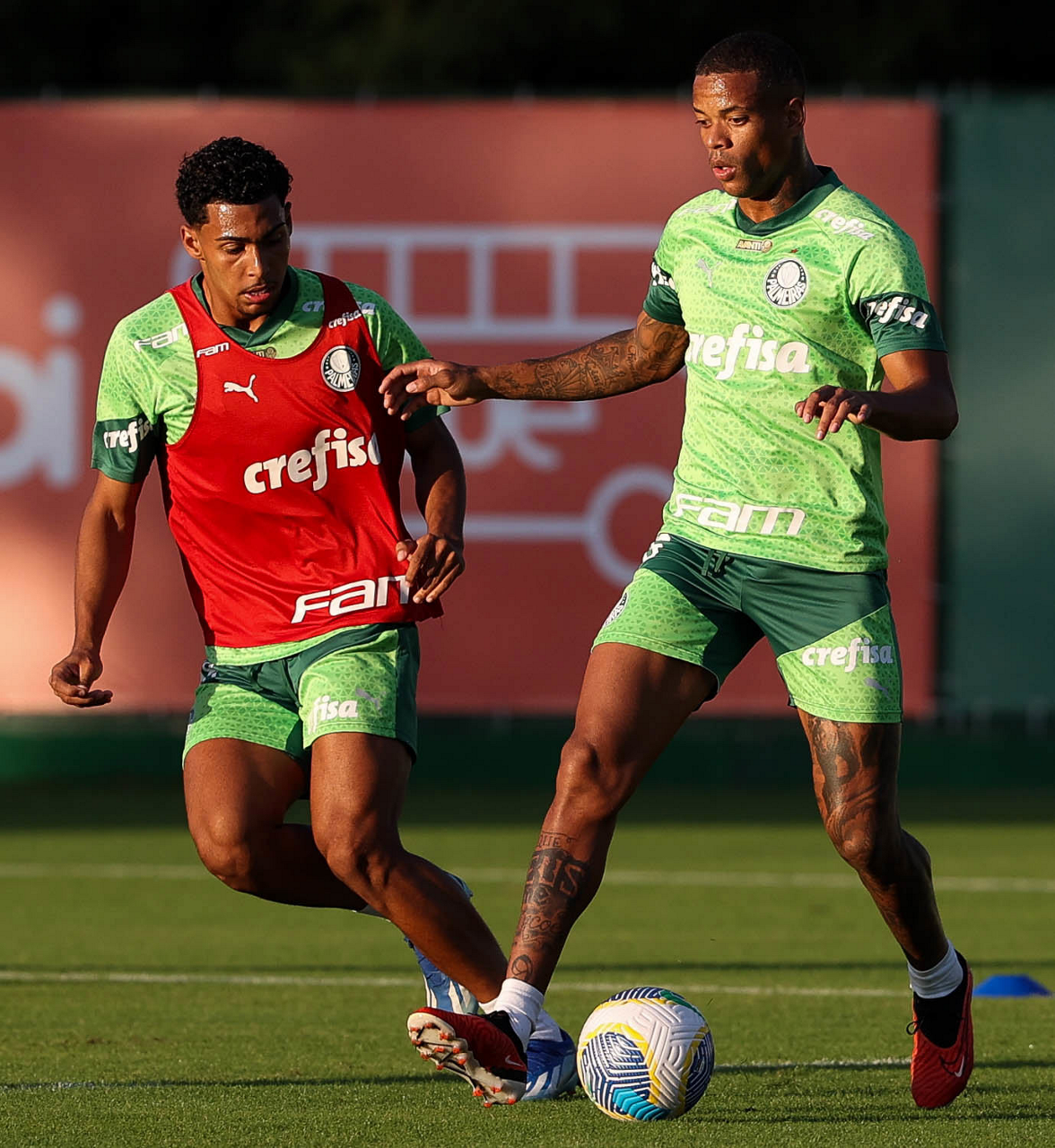 Os jogadores Estêvão e Gabriel Menino (D), da SE Palmeiras, durante treinamento, na Academia de Futebol. (Foto: Cesar Greco/Palmeiras/by Canon)