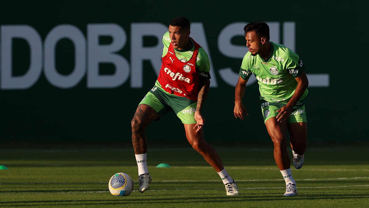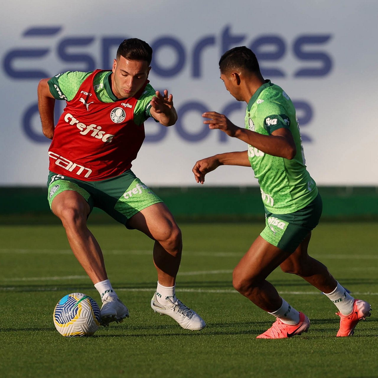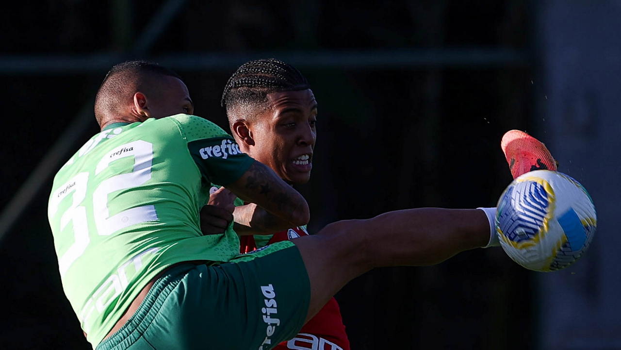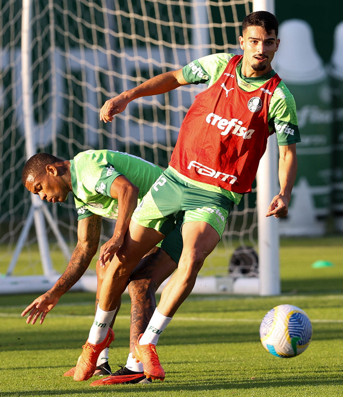 Os jogadores Gabriel Menino e Vitor Reis (D), da SE Palmeiras, durante treinamento, na Academia de Futebol. (Foto: Cesar Greco/Palmeiras/by Canon)