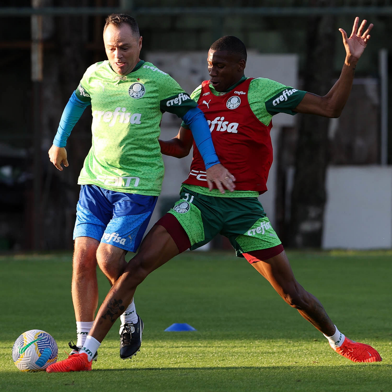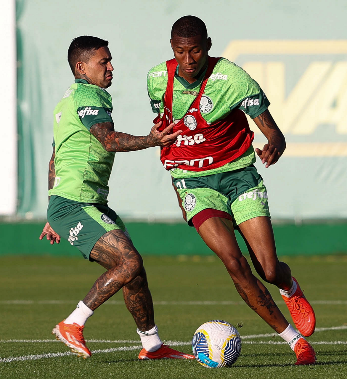 Os jogadores Fabinho e Rony (D), da SE Palmeiras, durante treinamento, na Academia de Futebol. (Foto: Cesar Greco/Palmeiras/by Canon)