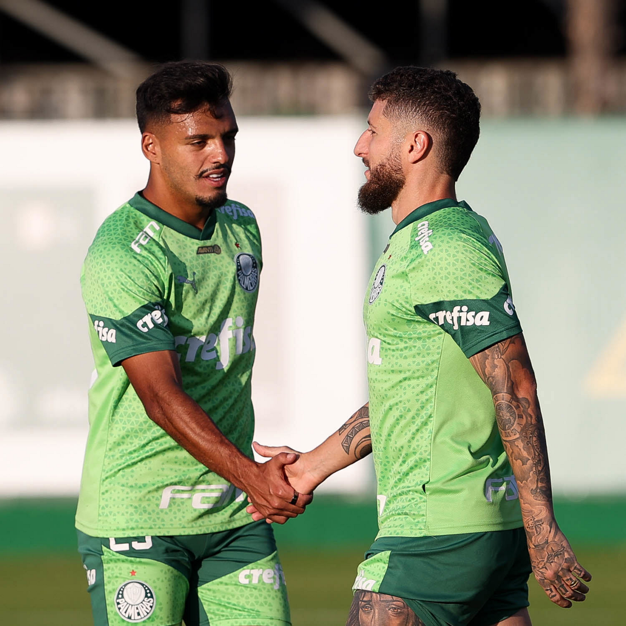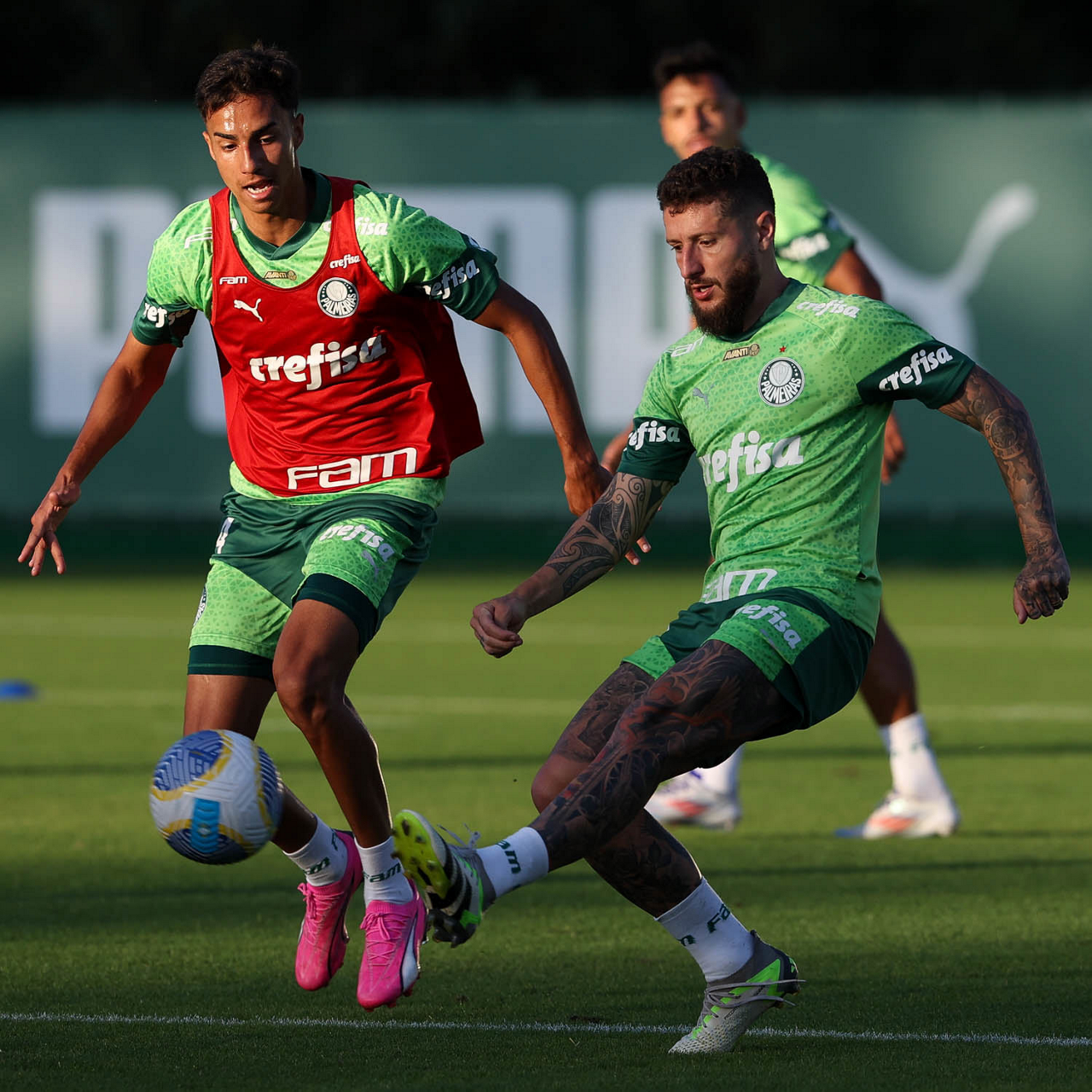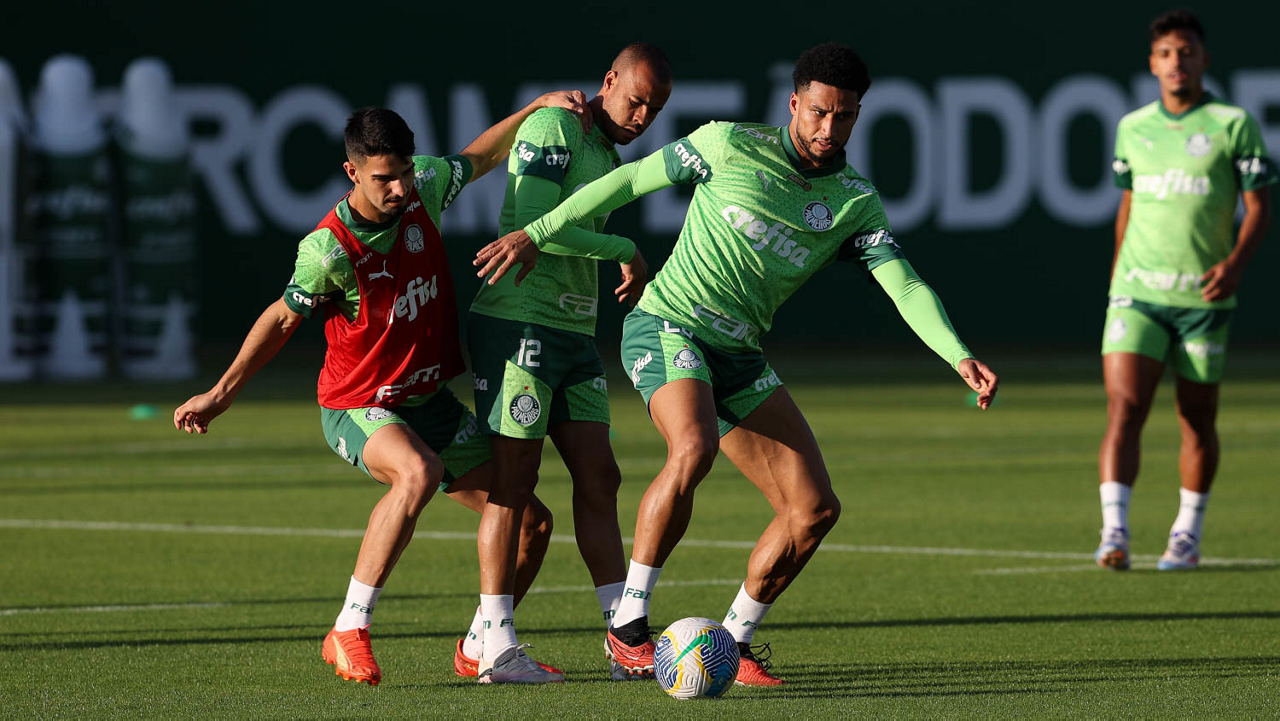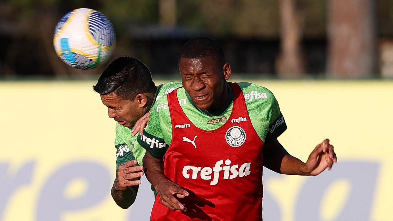 Os jogadores Gabriel Menino e Zé Rafael (D), da SE Palmeiras, durante treinamento, na Academia de Futebol. (Foto: Cesar Greco/Palmeiras/by Canon)