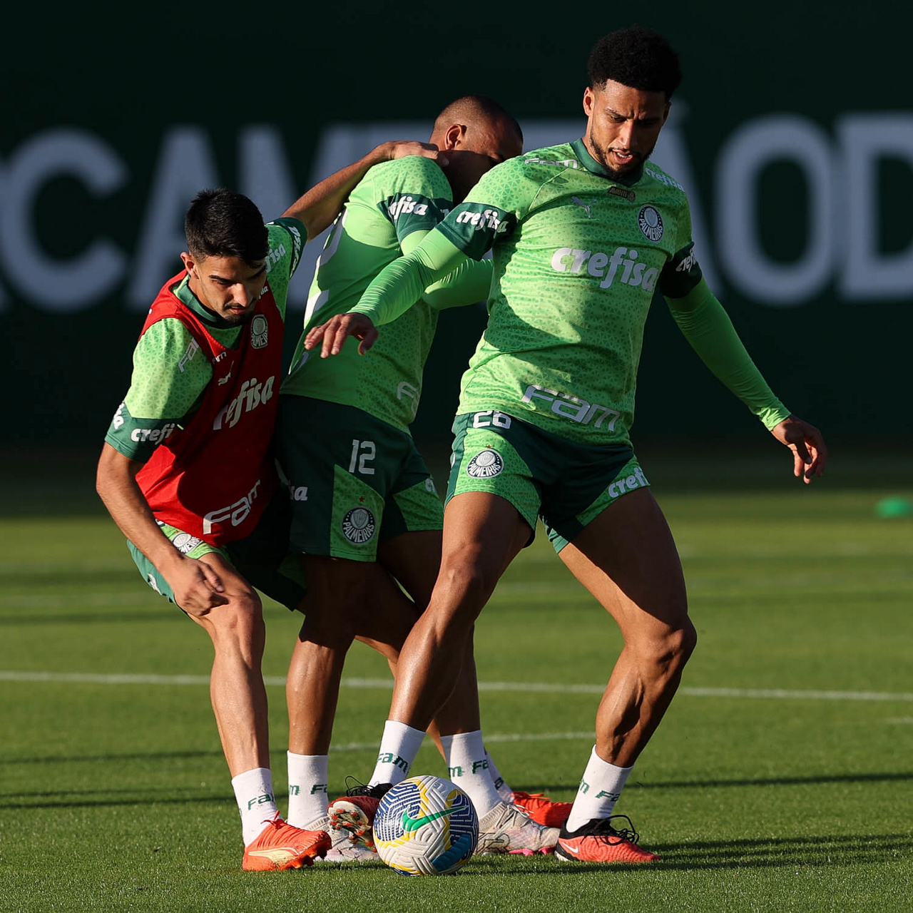 Os jogadores Flaco López, Mayke e Murilo (E/D), da SE Palmeiras, durante treinamento, na Academia de Futebol. (Foto: Cesar Greco/Palmeiras/by Canon)