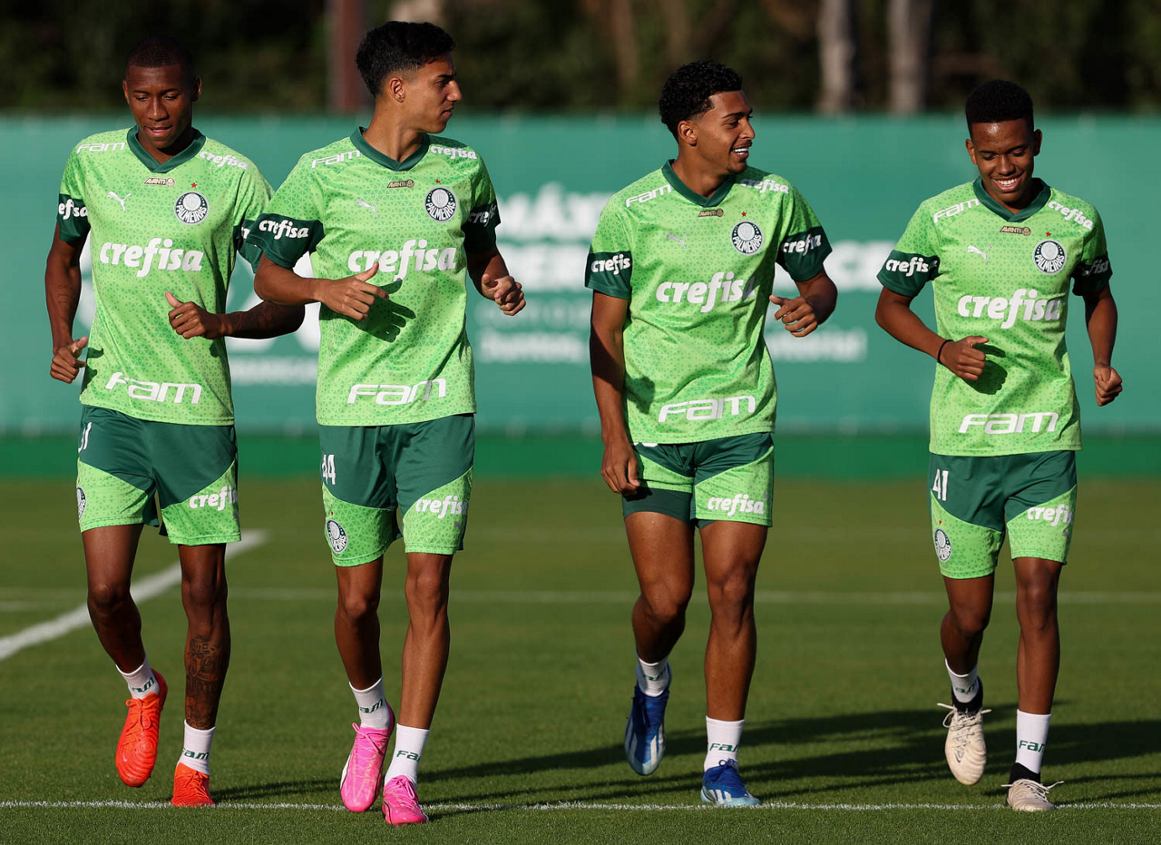 Os jogadores Patrick, Vitor Reis, David e Estêvão (E/D), da SE Palmeiras, durante treinamento, na Academia de Futebol. (Foto: Cesar Greco/Palmeiras/by Canon)