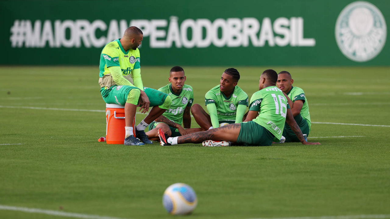 O goleiro Weverton e os jogadores Garcia, Vanderlan, Caio Paulista e Jhonatan (E/D), da SE Palmeiras, durante treinamento, na Academia de Futebol. (Foto: Cesar Greco/Palmeiras/by Canon)