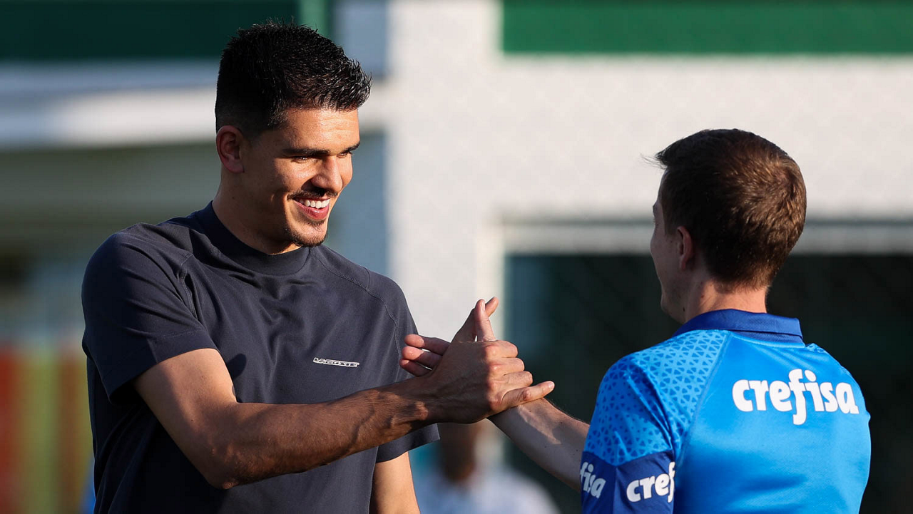 O técnico Abel Ferreira, da SE Palmeiras, recebe o ex-goleiro do clube Vinicius (E), durante treinamento, na Academia de Futebol. (Foto: Cesar Greco/Palmeiras/by Canon)