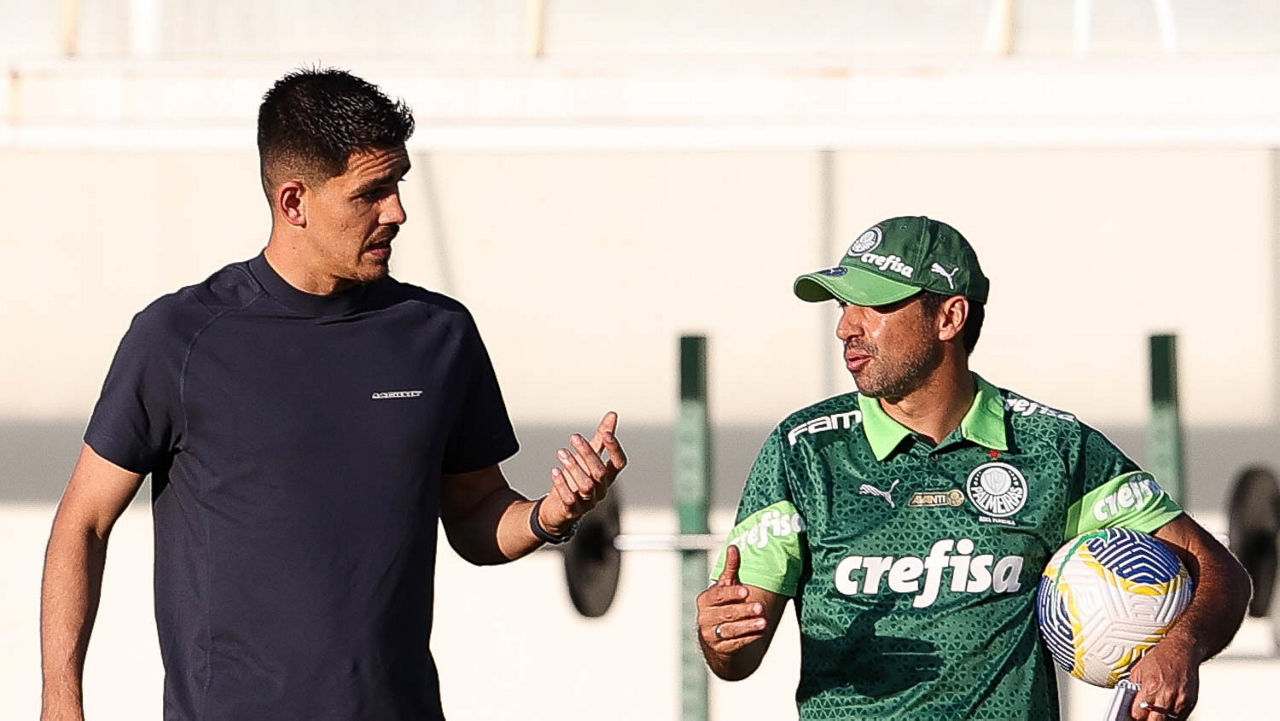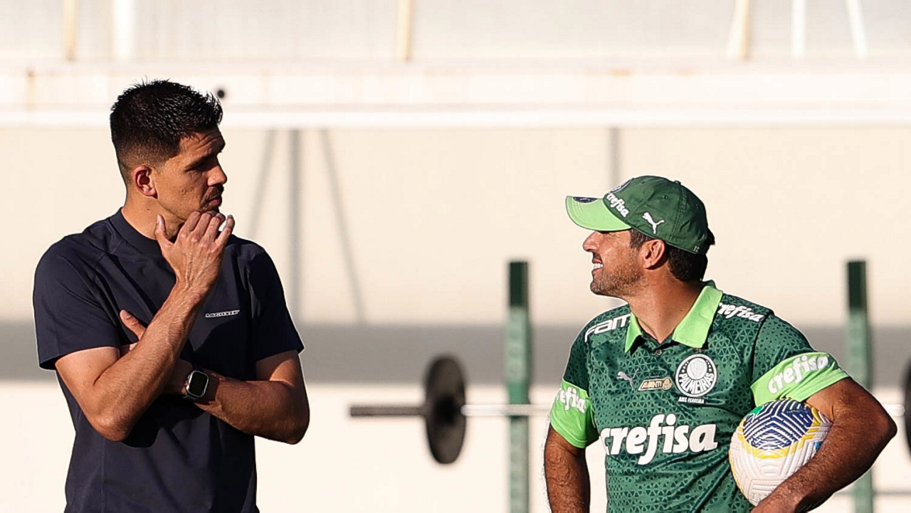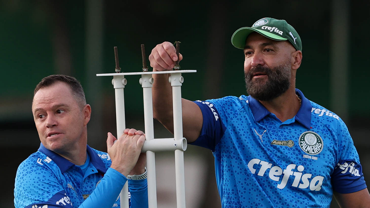 O auxiliar técnico Andrey Lopes e o preparador de goleiro Rogerio Godoy (D), da SE Palmeiras, durante treinamento, na Academia de Futebol. (Foto: Cesar Greco/Palmeiras/by Canon)