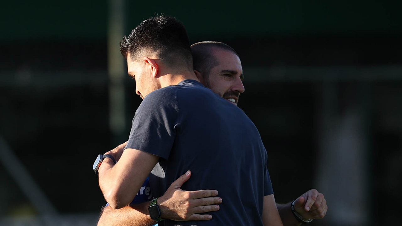 O preparador físico João Martins, da SE Palmeiras, recebe o ex-goleiro do clube Vinicius (E), durante treinamento, na Academia de Futebol. (Foto: Cesar Greco/Palmeiras/by Canon)