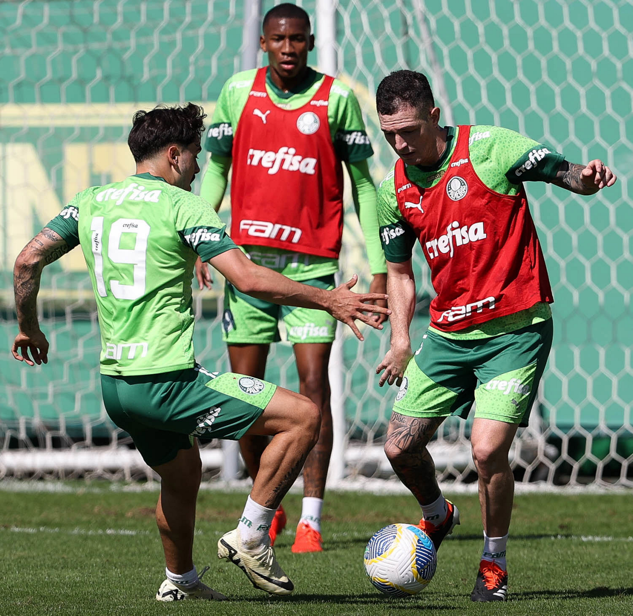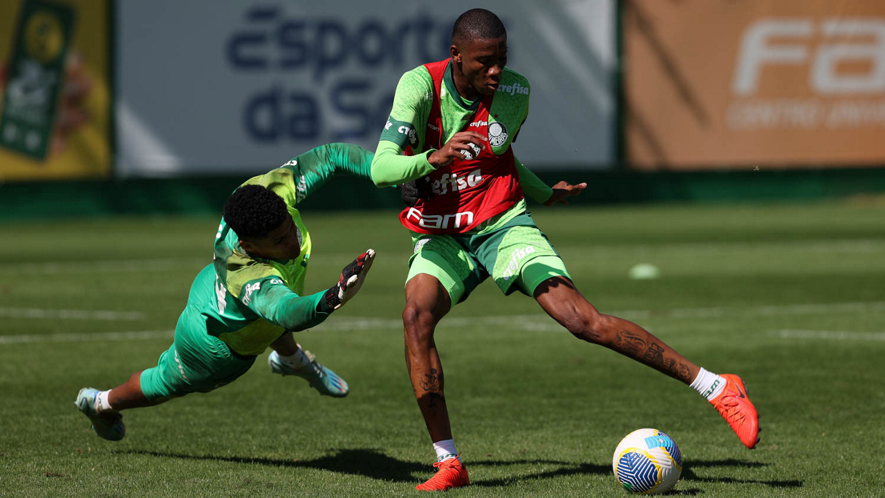 Os jogadores Luighi e Caio Paulista (D), da SE Palmeiras, durante treinamento, na Academia de Futebol. (Foto: Cesar Greco/Palmeiras/by Canon)
