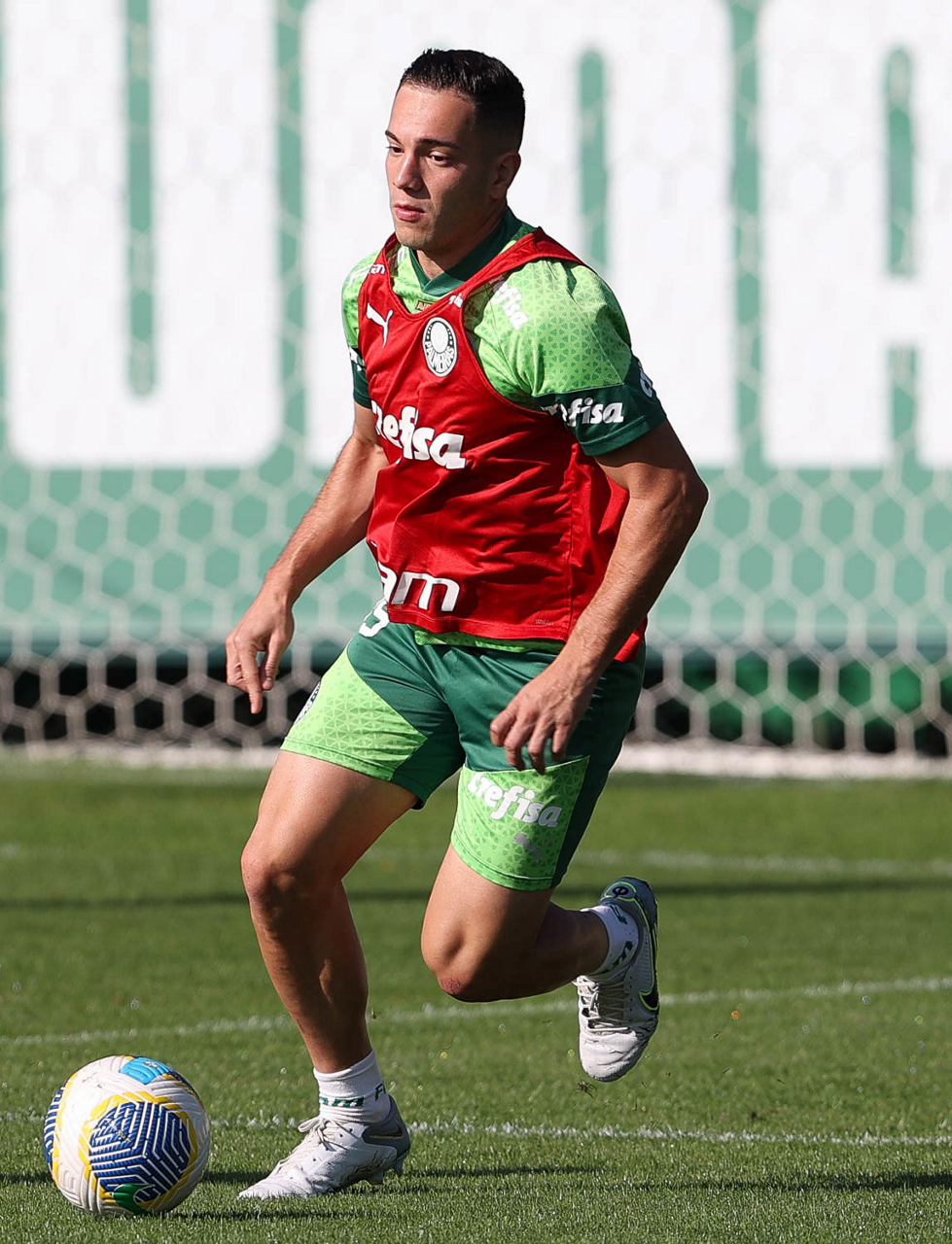 Os jogadores Naves, Mauricio, Fabinho, Jhonatan, Mateus, Vitor Reis, Joaquín Piquerez, Anibal Moreno e Michel (E/D em pé) e Weverton, Vanderlan, Flaco López, Agustín Giay e Estêvão (E/D agachados), da SE Palmeiras, durante treinamento, na Academia de Futebol. (Foto: Cesar Greco/Palmeiras/by Canon)