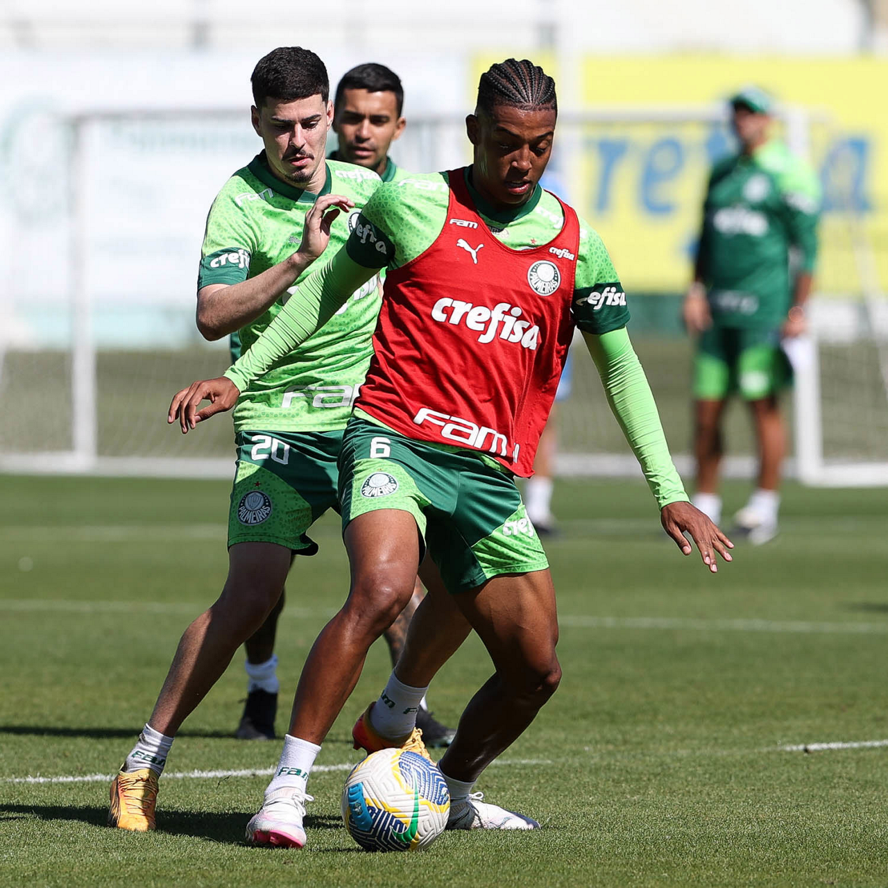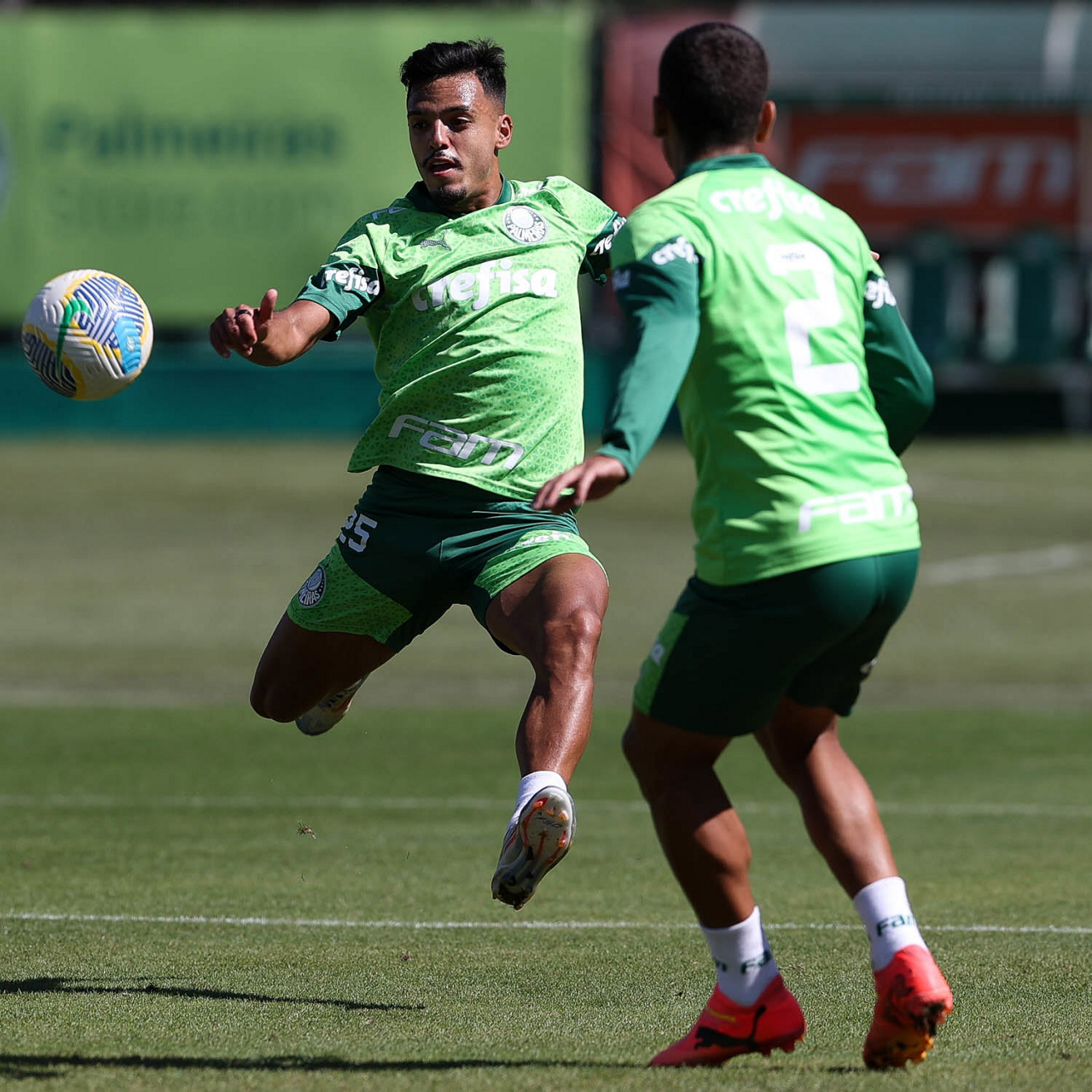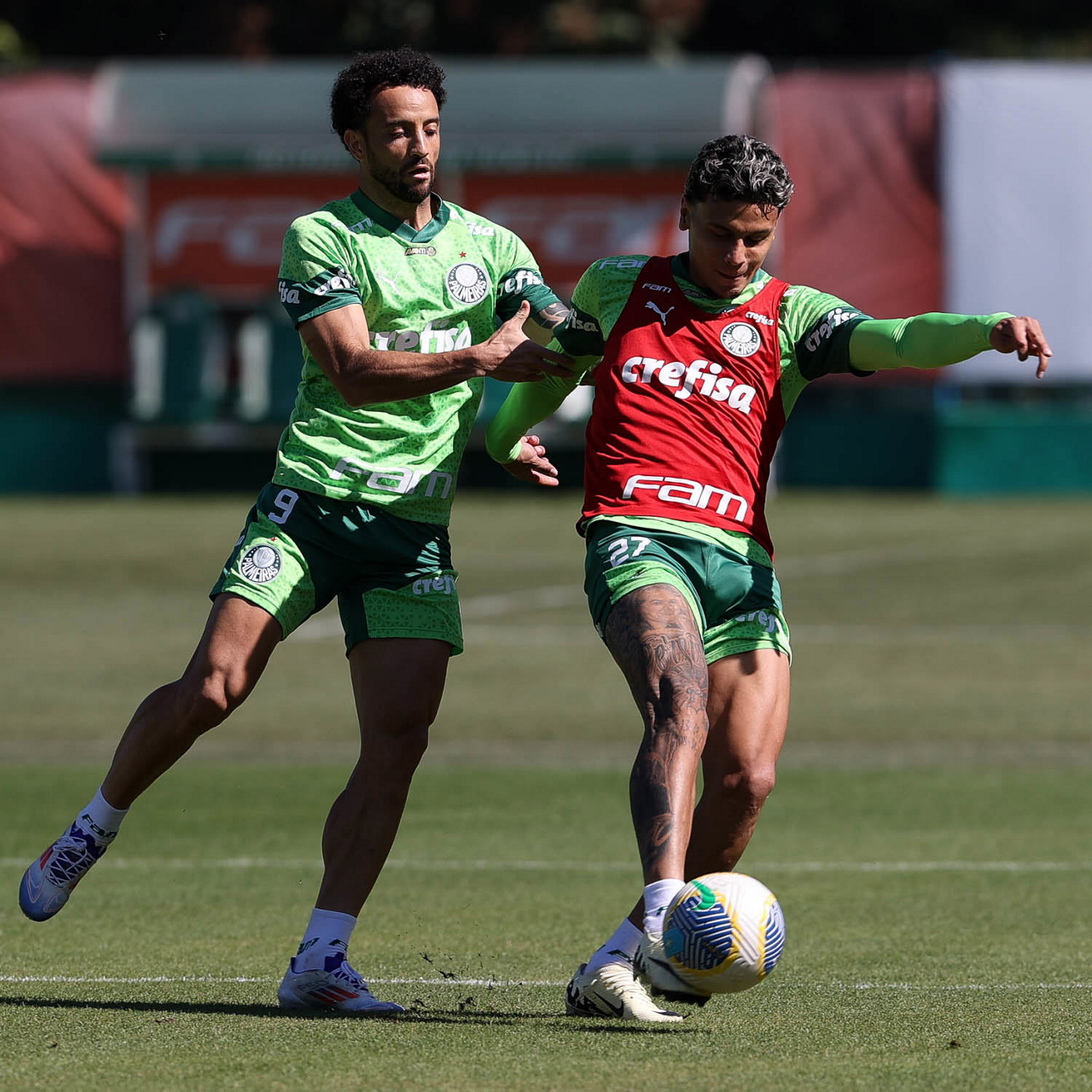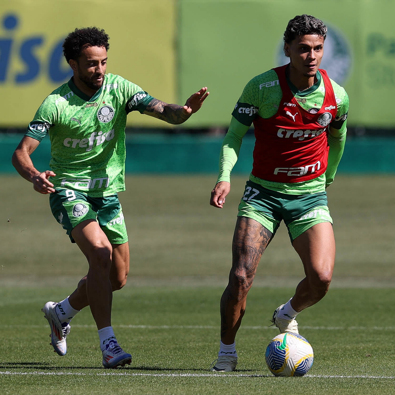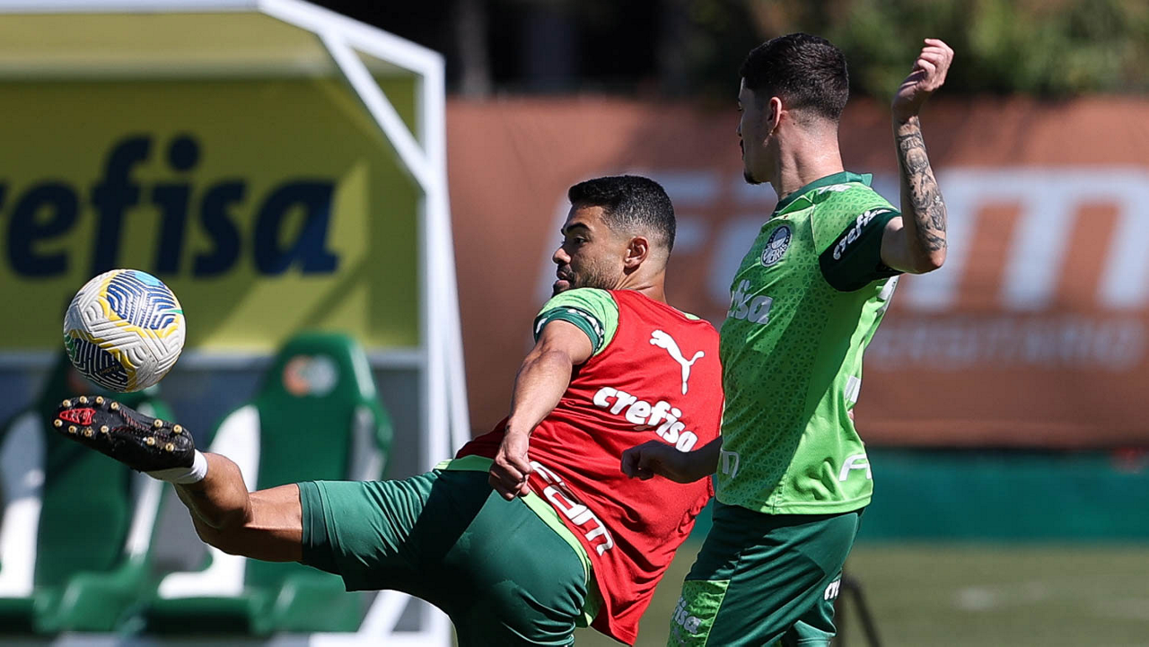 Os jogadores Felipe Anderson e Richard Ríos (D), da SE Palmeiras, durante treinamento, na Academia de Futebol. (Foto: Cesar Greco/Palmeiras/by Canon)