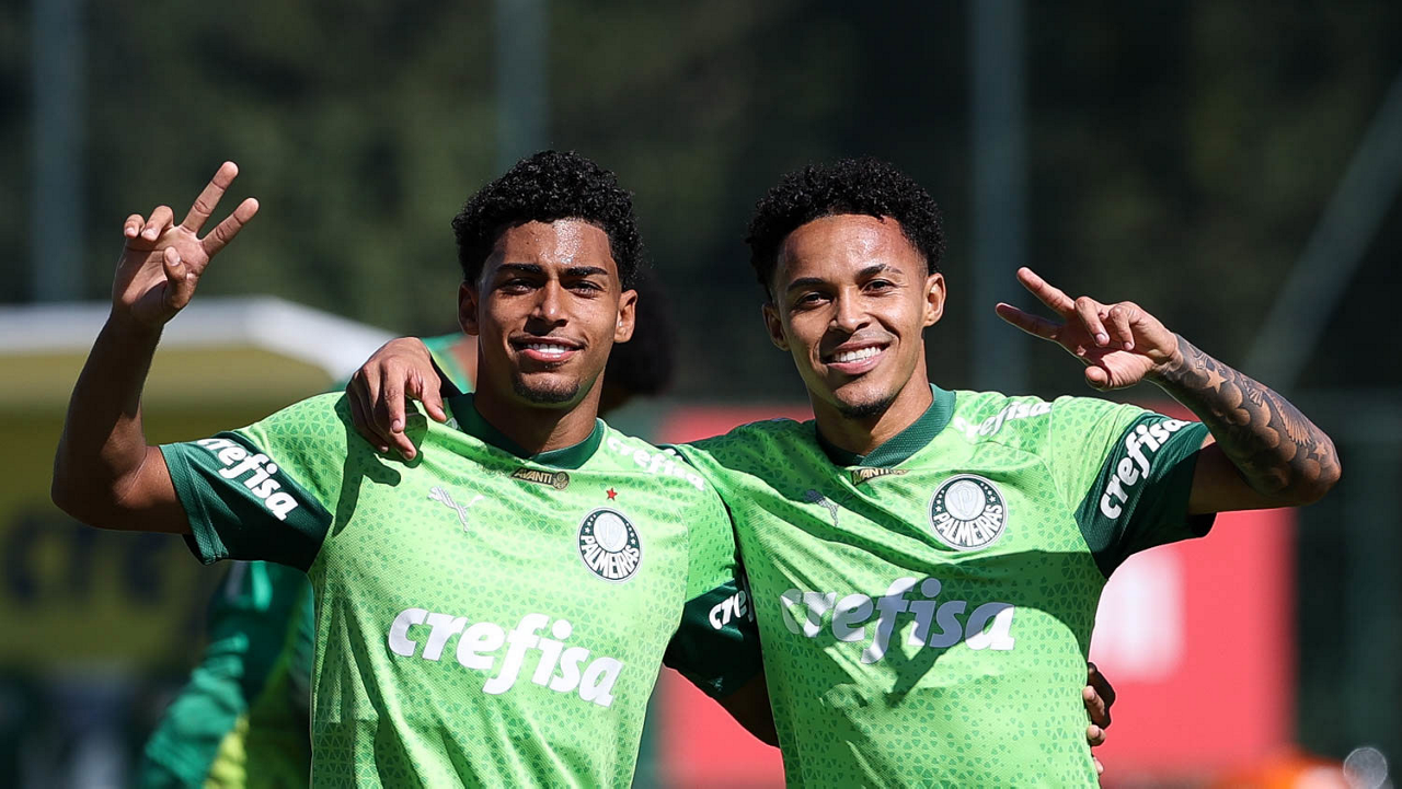 Os jogadores Vitor Reis e Murilo (D), da SE Palmeiras, durante treinamento, na Academia de Futebol. (Foto: Cesar Greco/Palmeiras/by Canon)