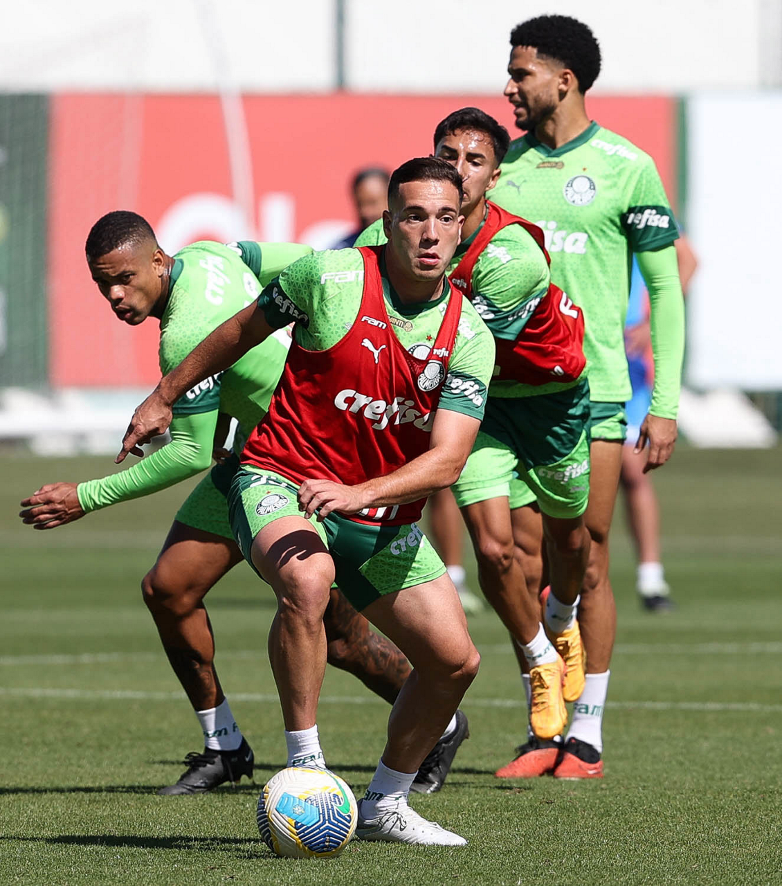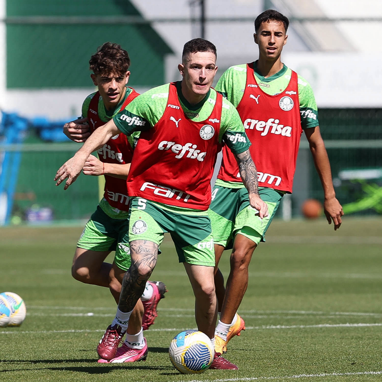 Os jogadores Caio Paulista, Anibal Moreno e Mateus (E/D), da SE Palmeiras, durante treinamento, na Academia de Futebol. (Foto: Cesar Greco/Palmeiras/by Canon)