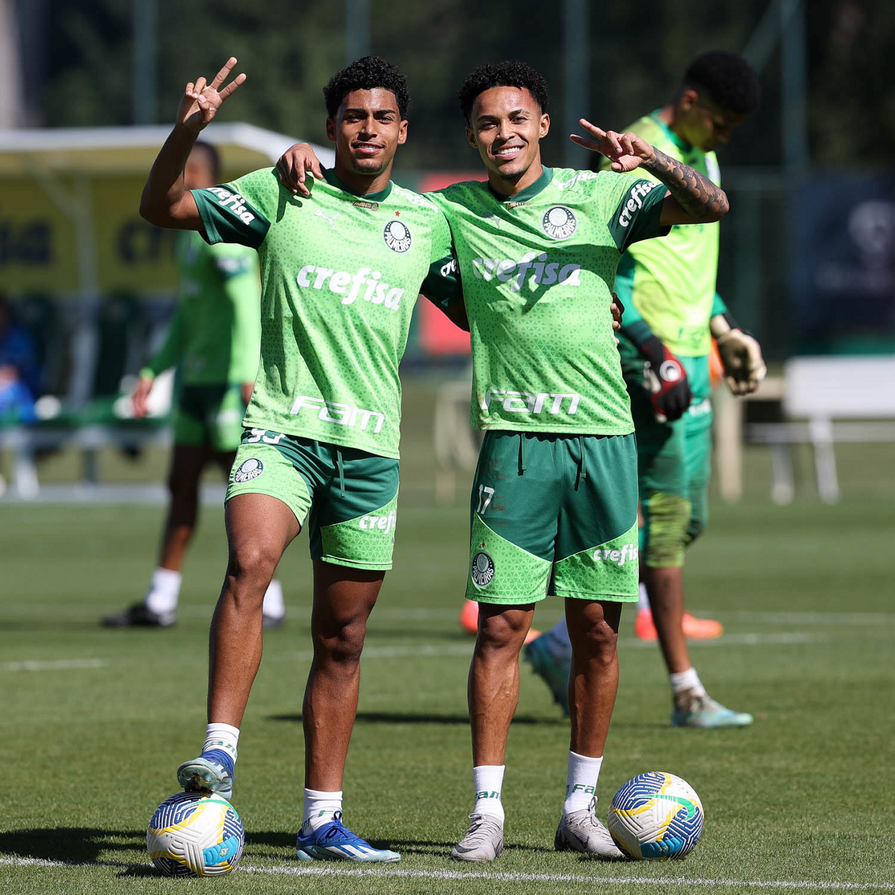 O jogador Luighi e o goleiro Weverton (D), da SE Palmeiras, durante treinamento, na Academia de Futebol. (Foto: Cesar Greco/Palmeiras/by Canon)