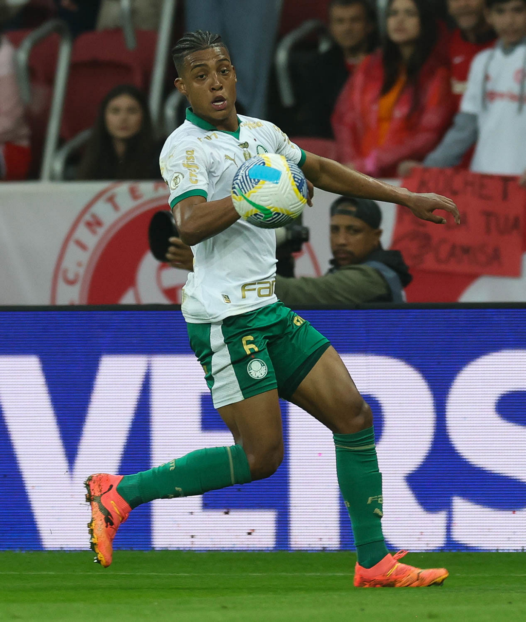 O jogador Gabriel Menino, da SE Palmeiras, em jogo contra a equipe do SC Internacional, durante partida válida pela vigésima primeira rodada, do Campeonato Brasileiro, Série A, no Estádio Beira-Rio. (Foto: Cesar Greco/Palmeiras/by Canon)