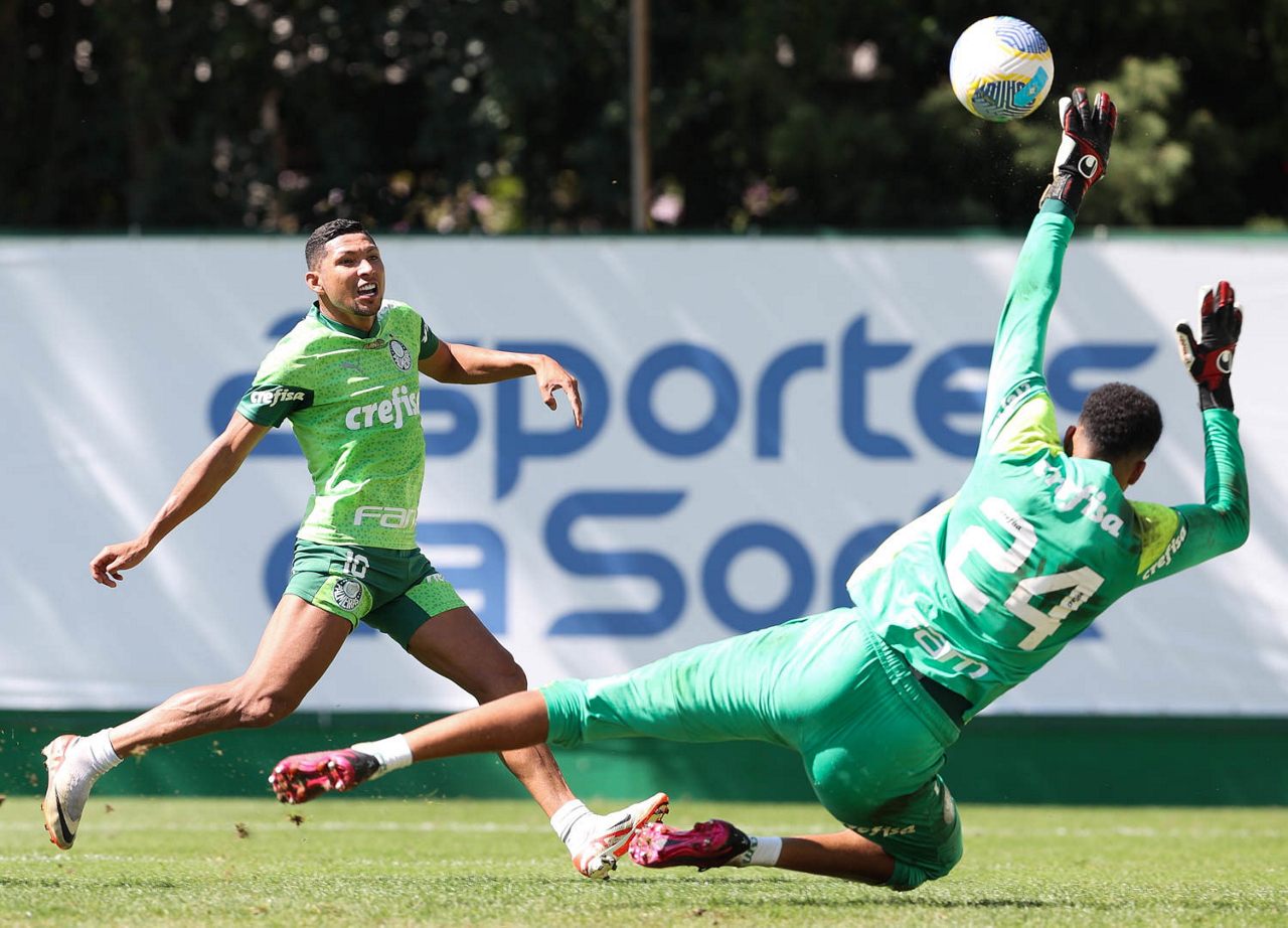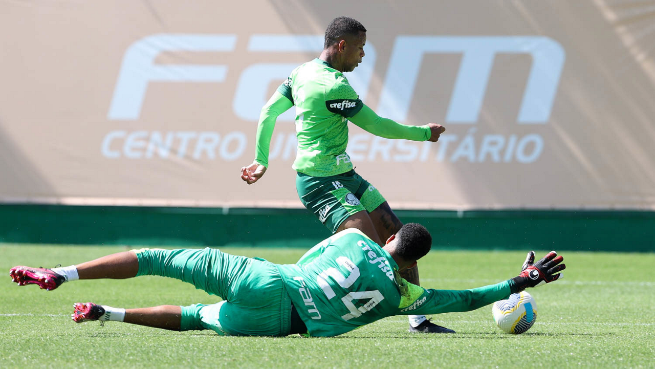 O jogador Rony e o goleiro Mateus (D), da SE Palmeiras, durante treinamento, na Academia de Futebol. (Foto: Cesar Greco/Palmeiras/by Canon)