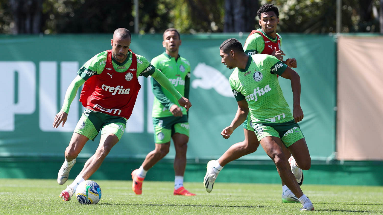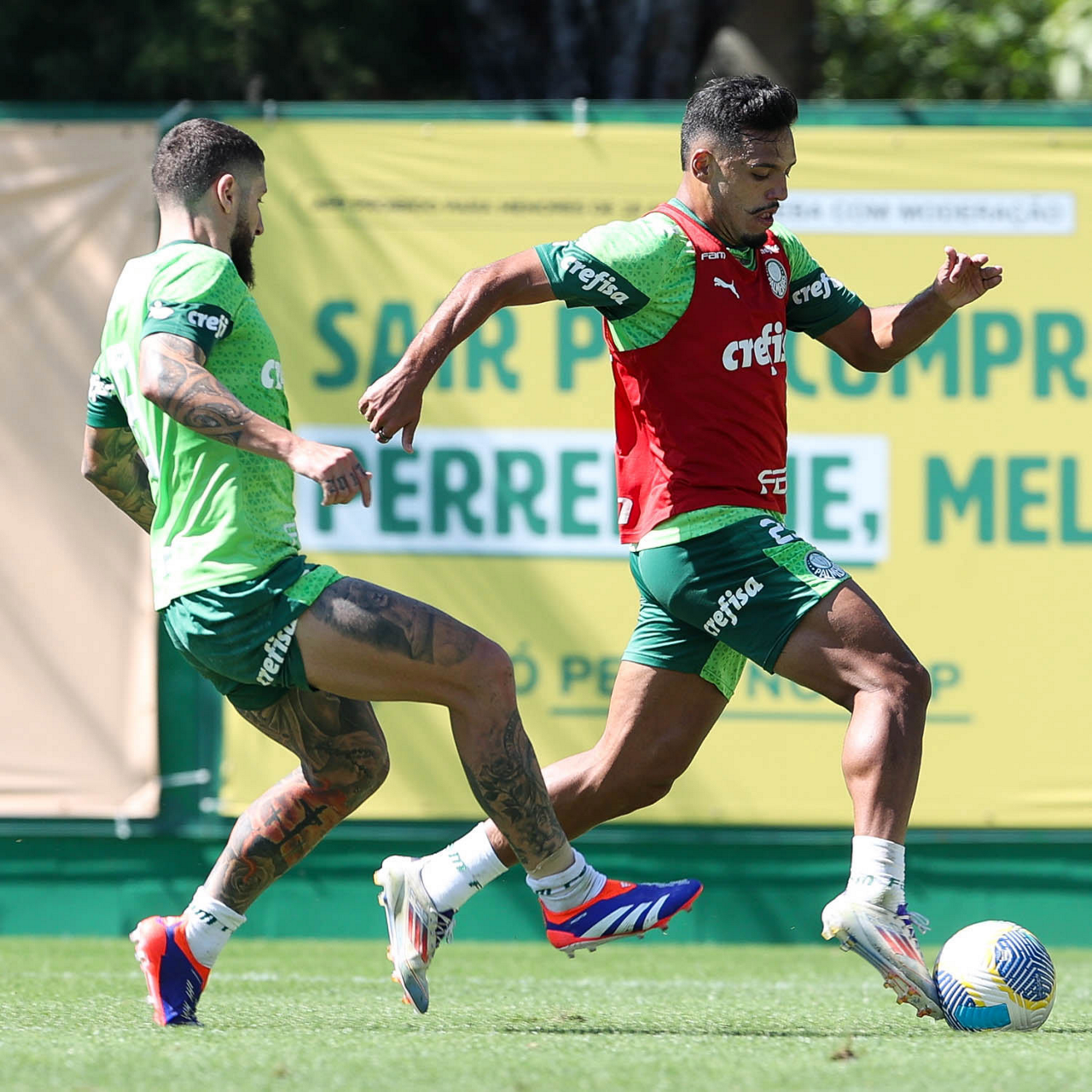 Os jogadores Rômulo e Richard Ríos (D), da SE Palmeiras, durante treinamento, na Academia de Futebol. (Foto: Cesar Greco/Palmeiras/by Canon)
