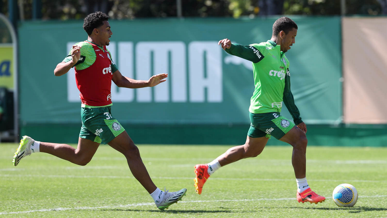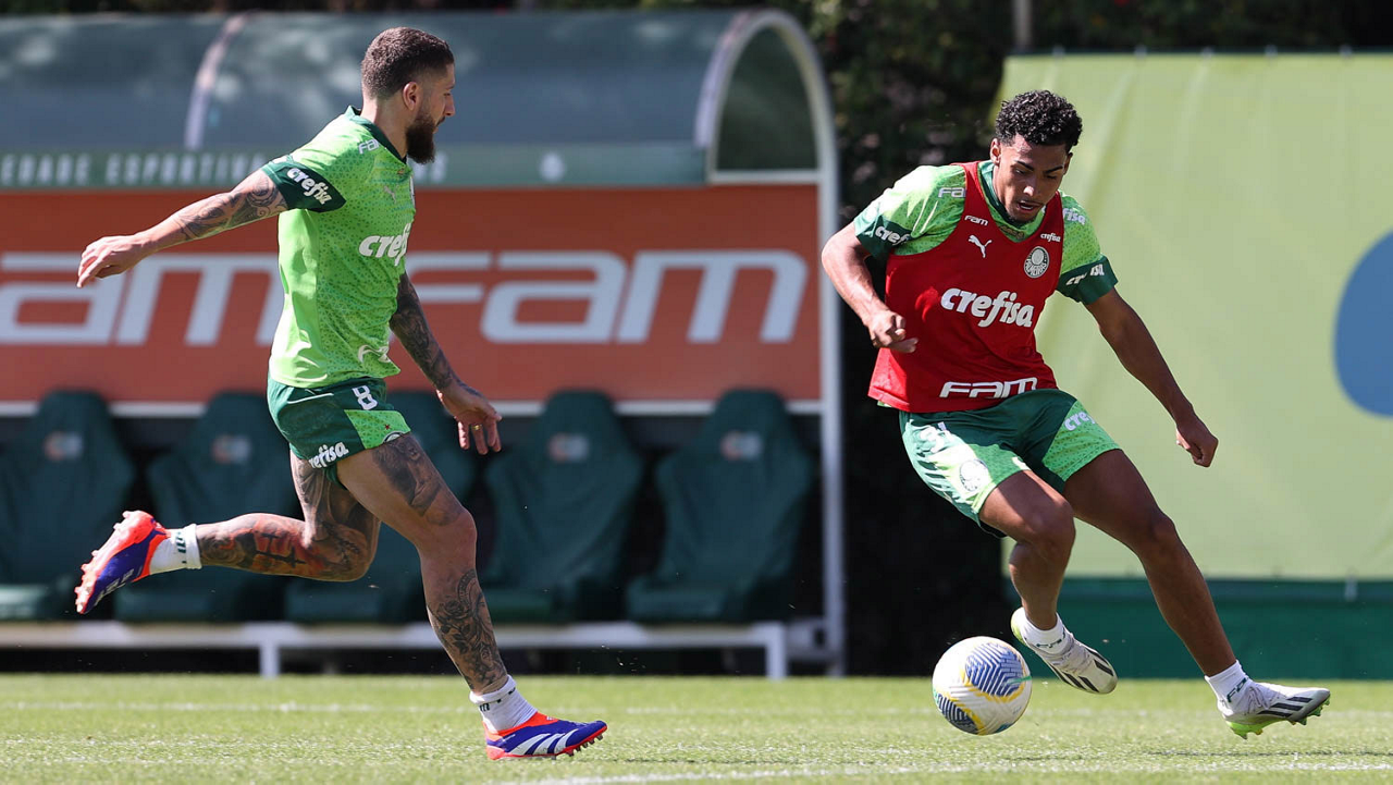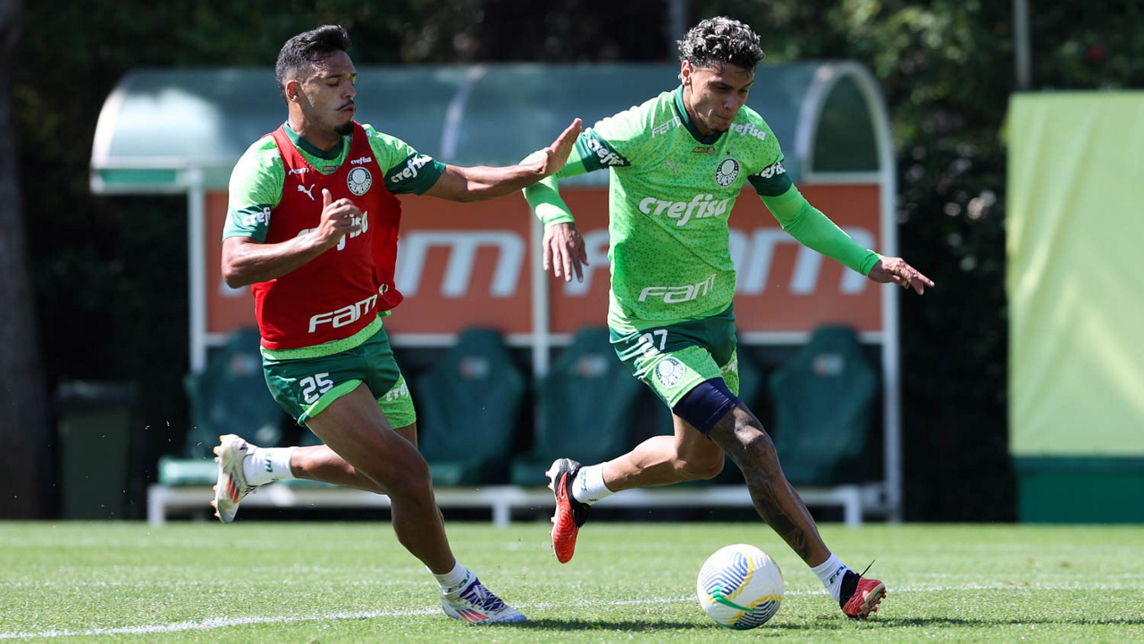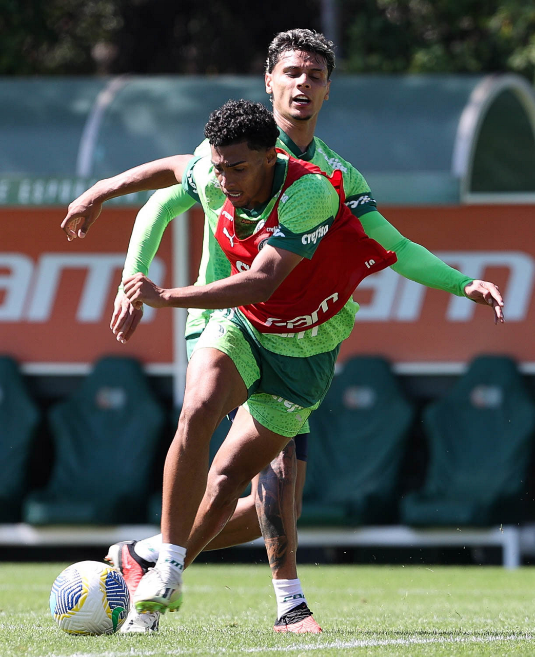Os jogadores Gabriel Menino e Richard Ríos (D), da SE Palmeiras, durante treinamento, na Academia de Futebol. (Foto: Cesar Greco/Palmeiras/by Canon)