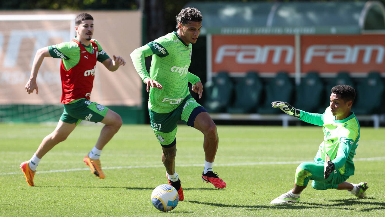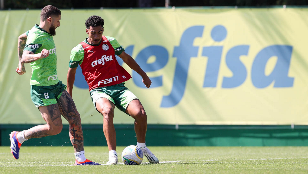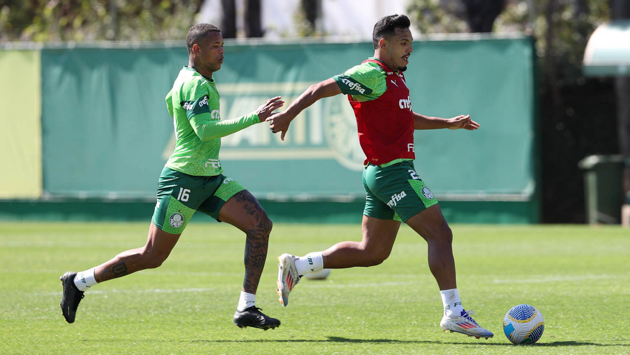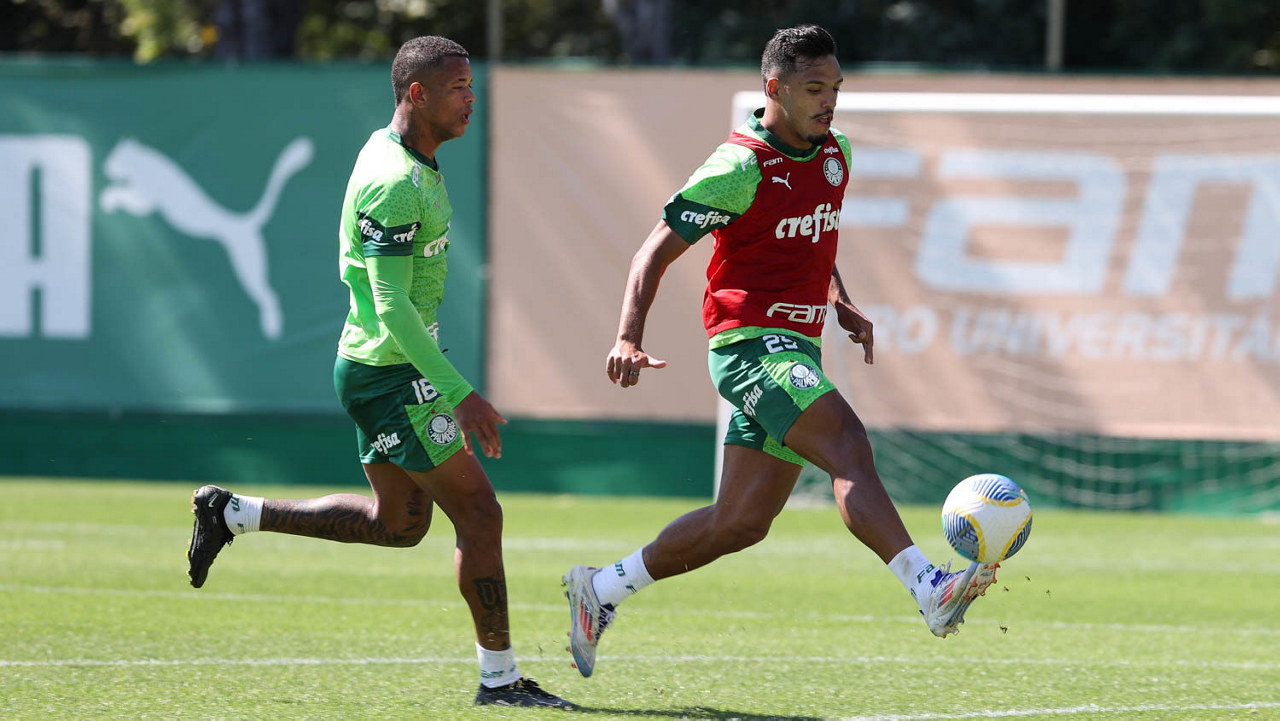 Os jogadores Gabriel Menino e Richard Ríos (D), da SE Palmeiras, durante treinamento, na Academia de Futebol. (Foto: Cesar Greco/Palmeiras/by Canon)
