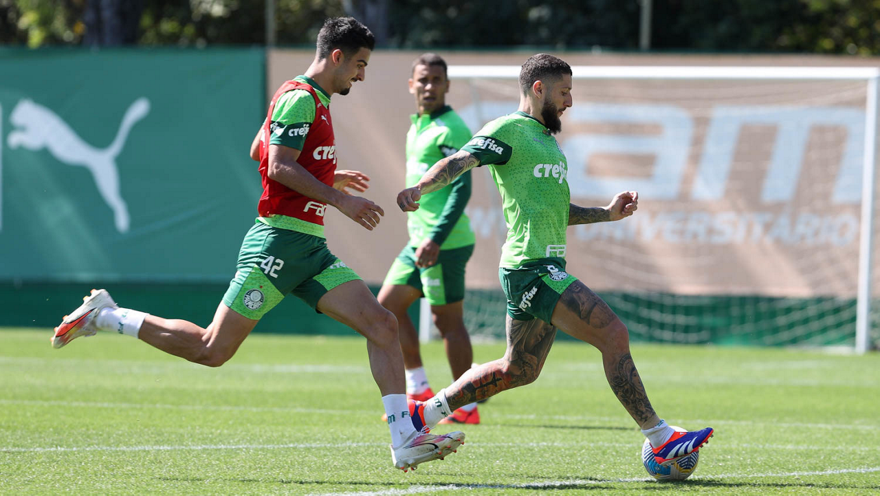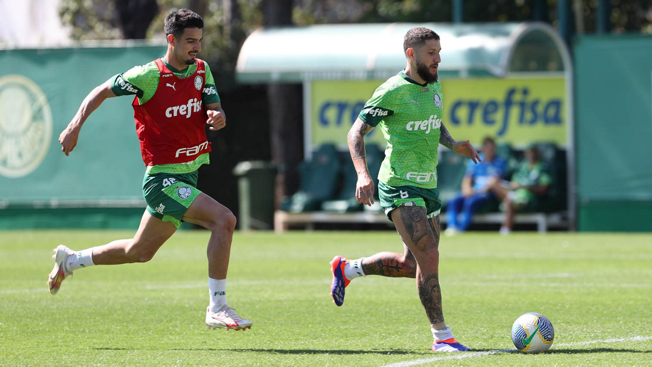 Os jogadores Zé Rafael e Gabriel Menino (D), da SE Palmeiras, durante treinamento, na Academia de Futebol. (Foto: Cesar Greco/Palmeiras/by Canon)