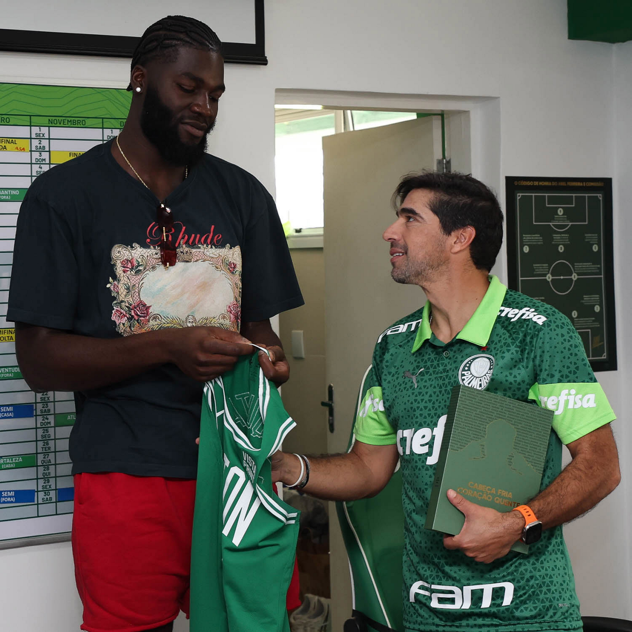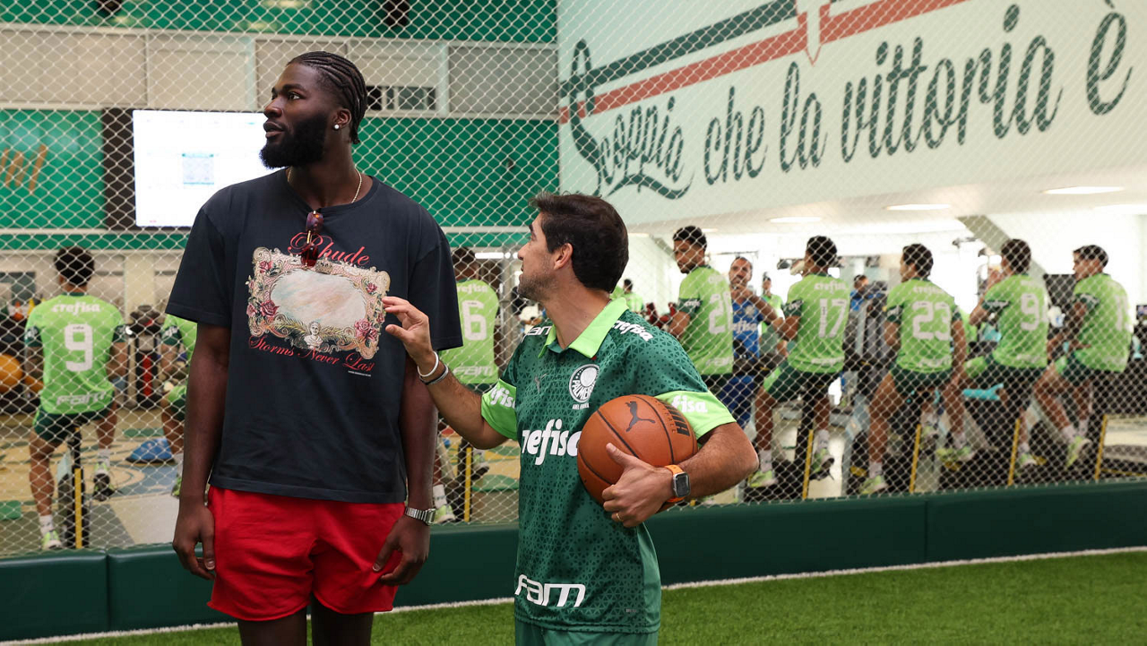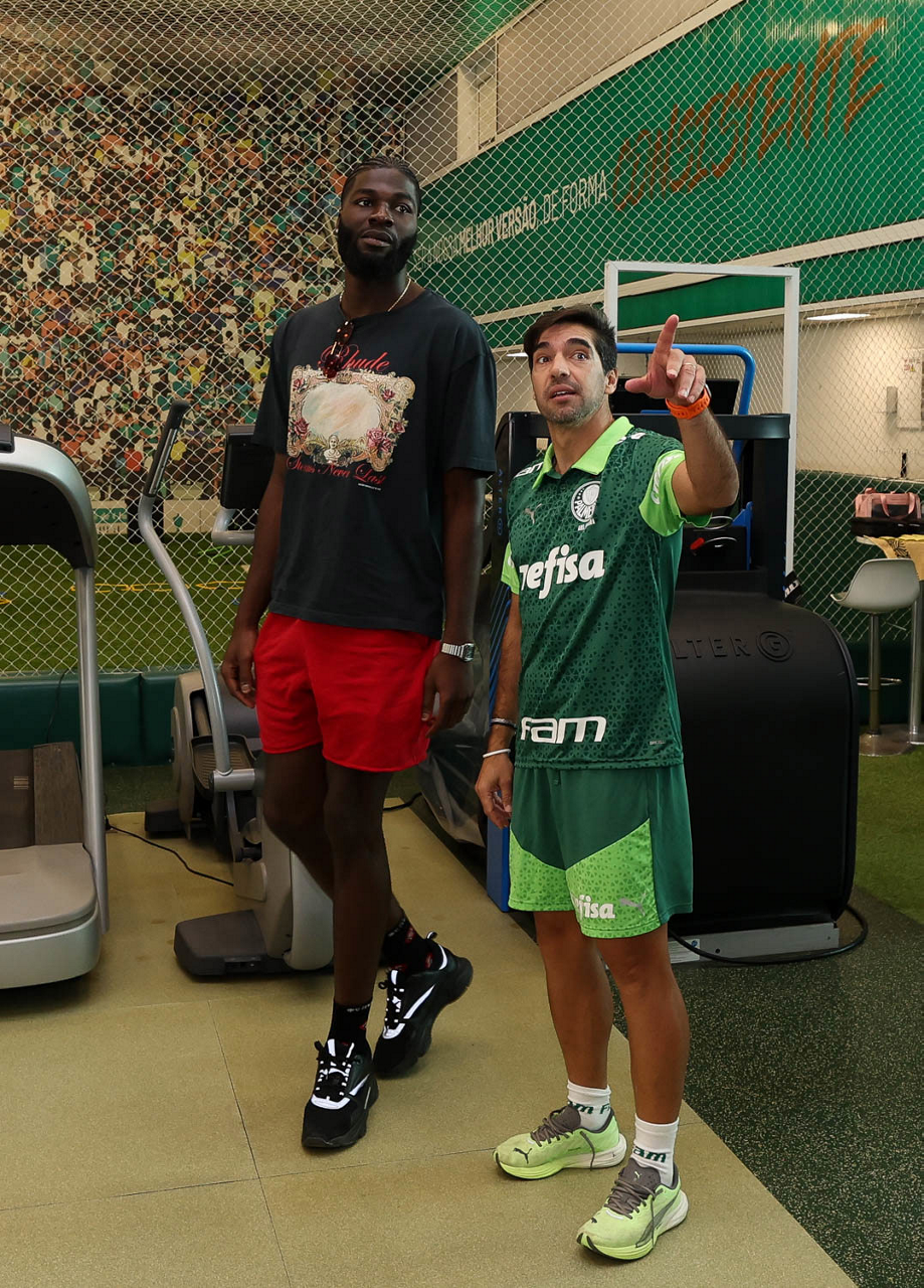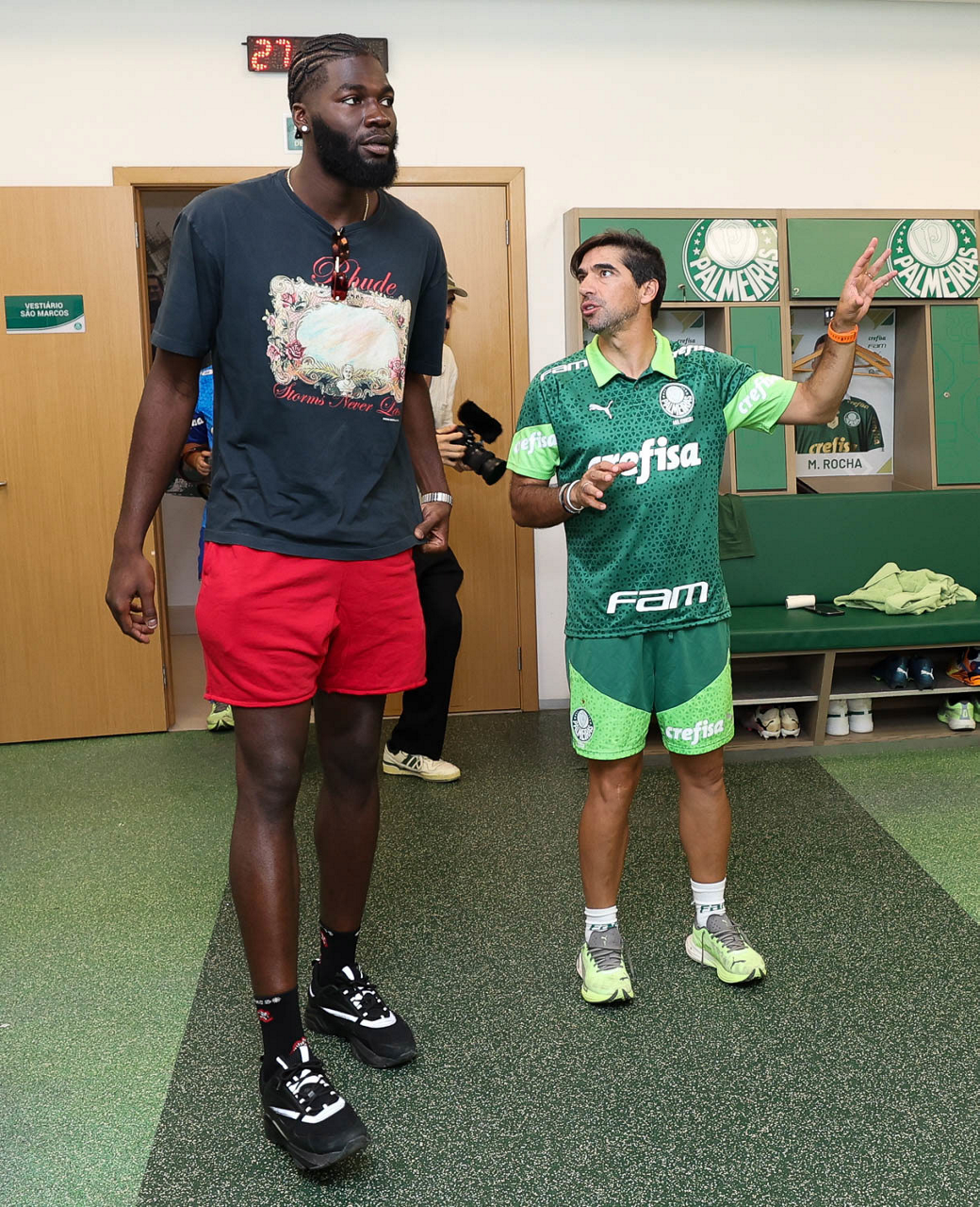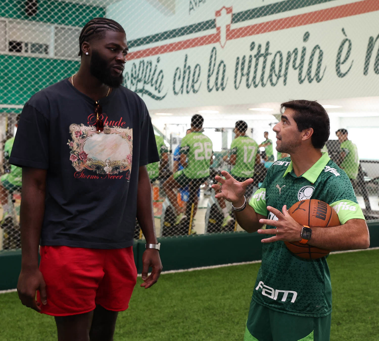 O técnico Abel Ferreira, da SE Palmeiras, recebe o jogador de basquete portugues campeão da NBA pelo Boston Celtics Neemias Queta, na Academia de Futebol. (Foto: Cesar Greco/Palmeiras/by Canon)