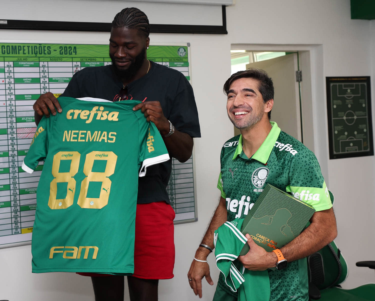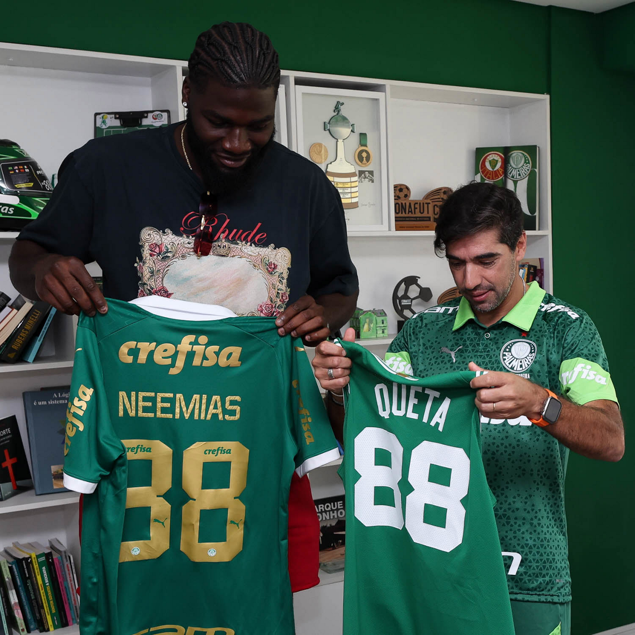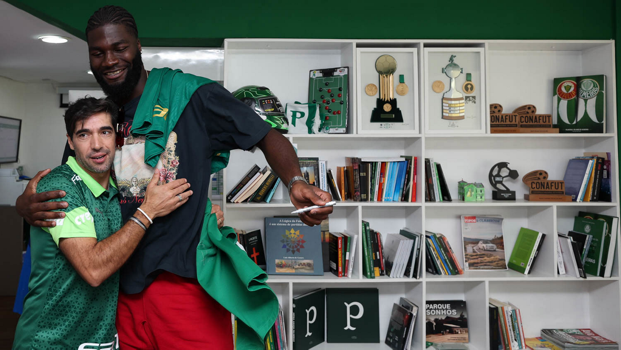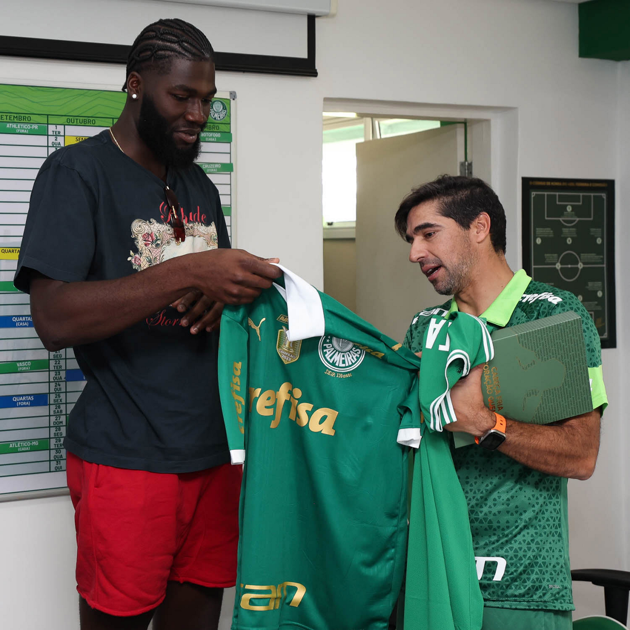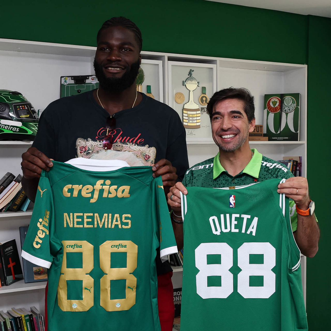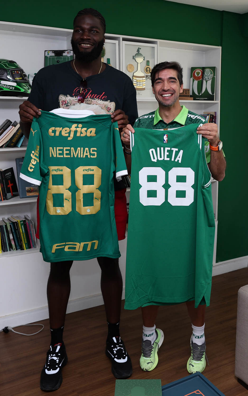 O técnico Abel Ferreira, da SE Palmeiras, recebe o jogador de basquete portugues campeão da NBA pelo Boston Celtics Neemias Queta, na Academia de Futebol. (Foto: Cesar Greco/Palmeiras/by Canon)