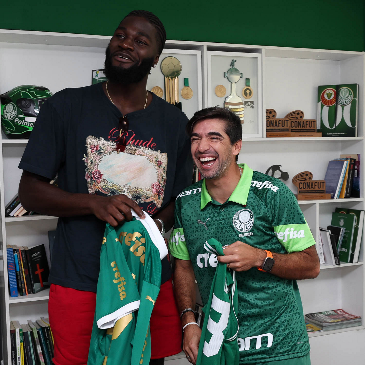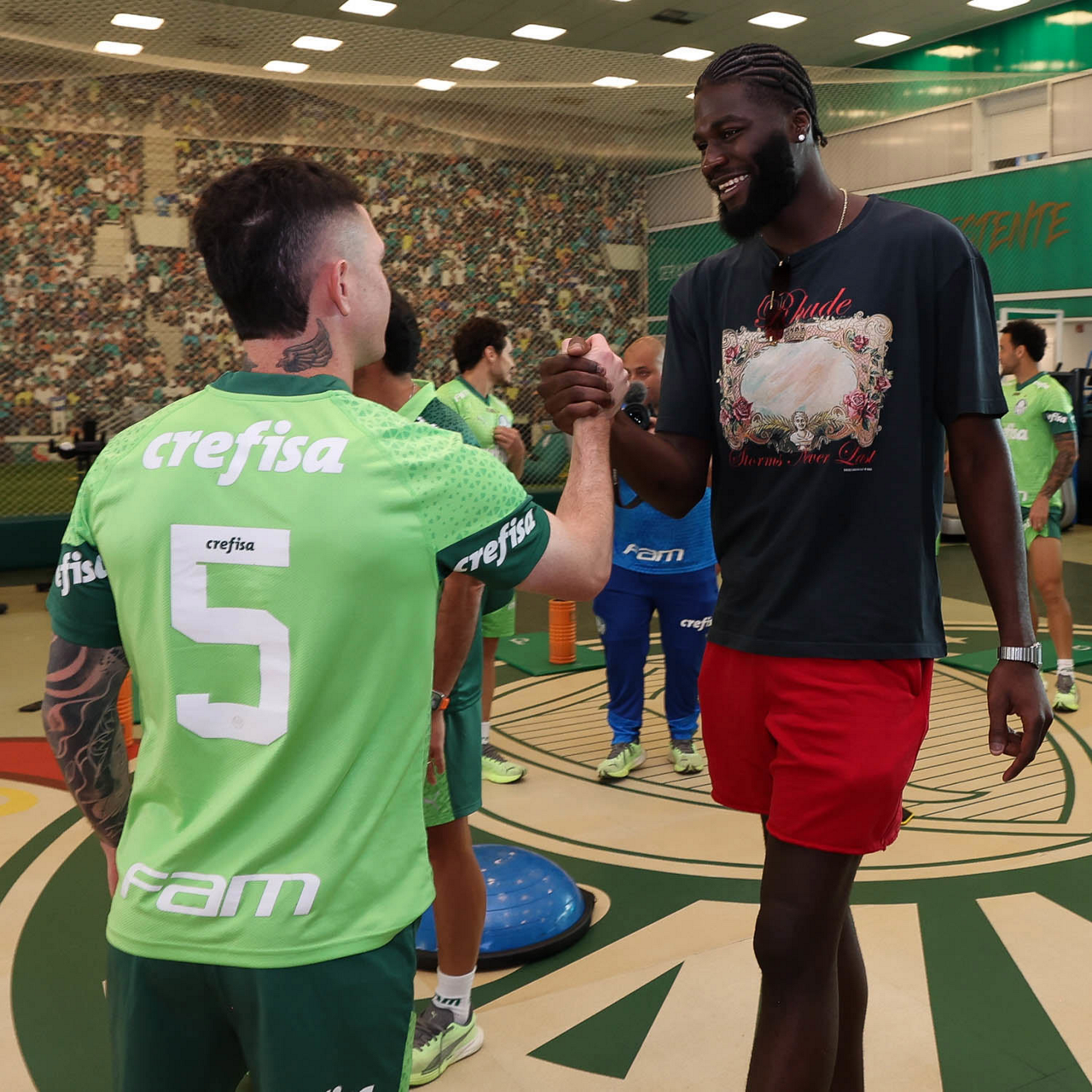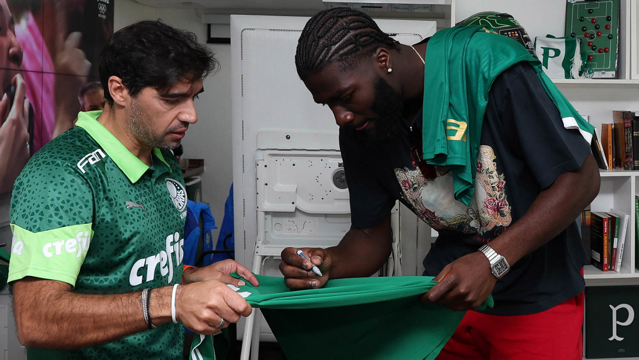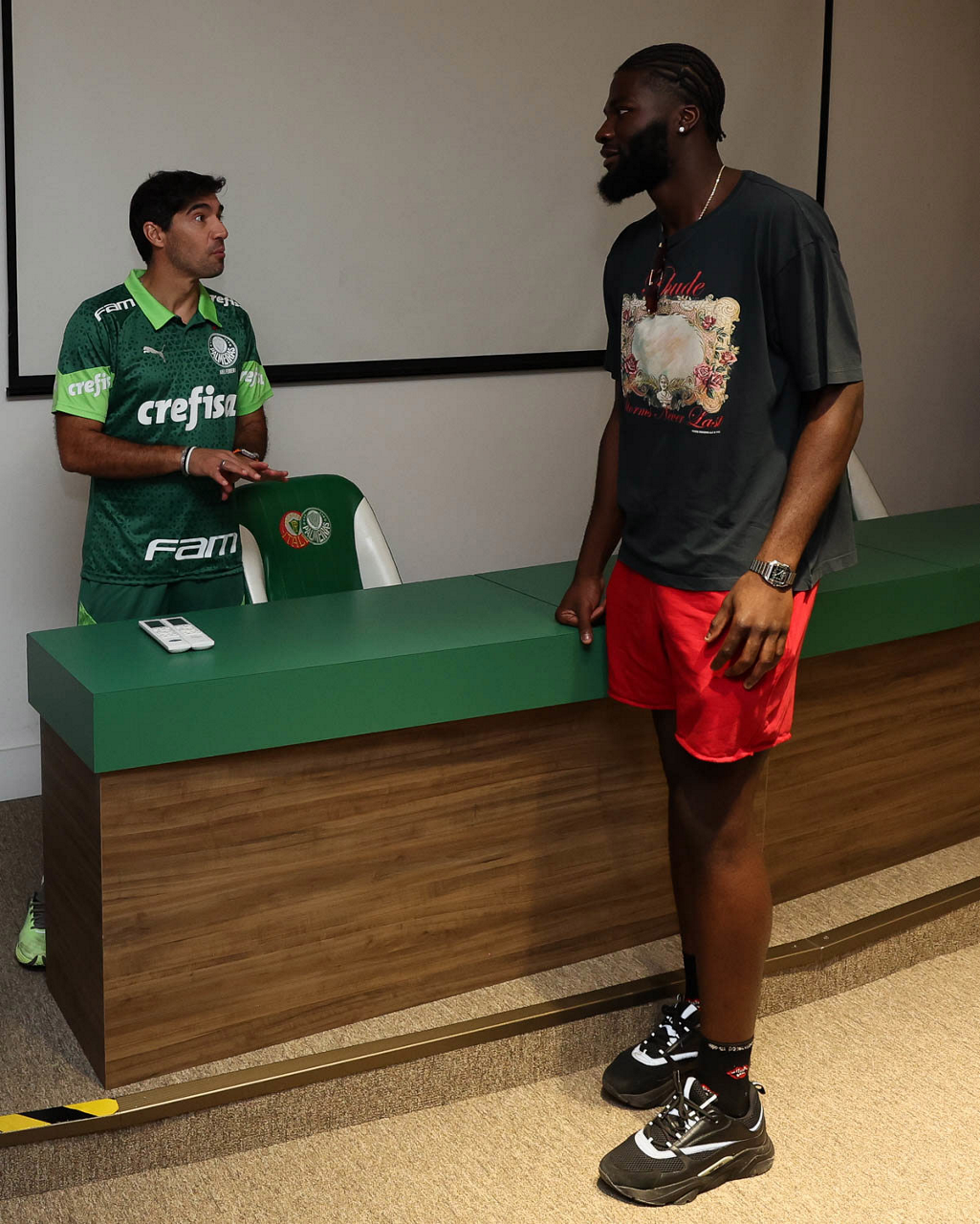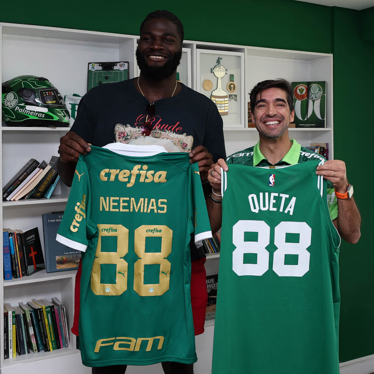 O técnico Abel Ferreira, da SE Palmeiras, recebe o jogador de basquete portugues campeão da NBA pelo Boston Celtics Neemias Queta, na Academia de Futebol. (Foto: Cesar Greco/Palmeiras/by Canon)