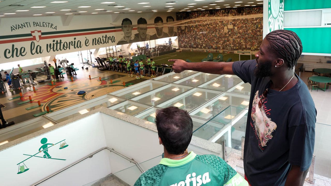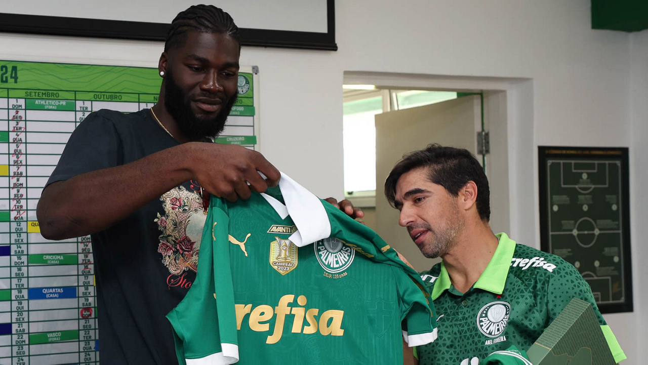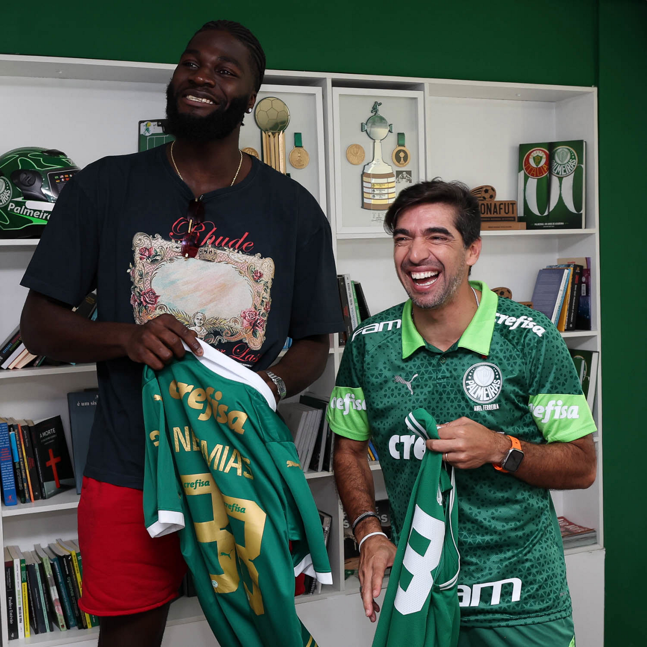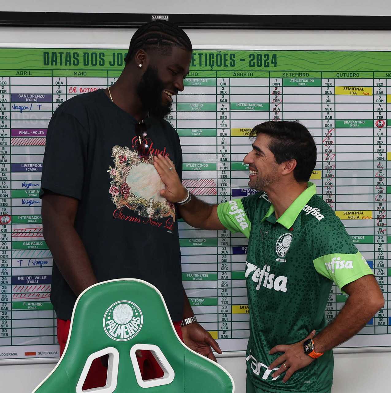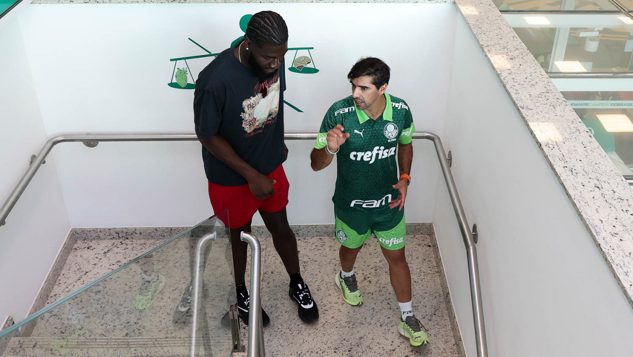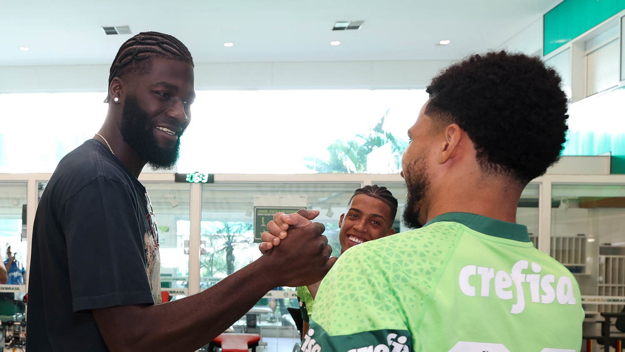 O técnico Abel Ferreira, da SE Palmeiras, recebe o jogador de basquete portugues campeão da NBA pelo Boston Celtics Neemias Queta, na Academia de Futebol. (Foto: Cesar Greco/Palmeiras/by Canon)