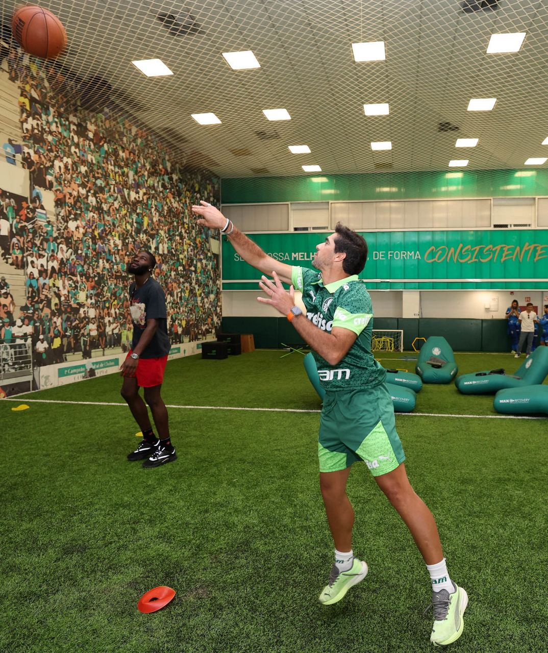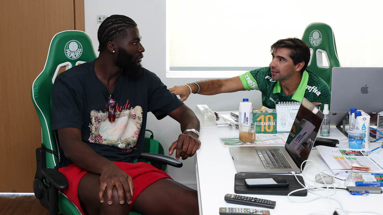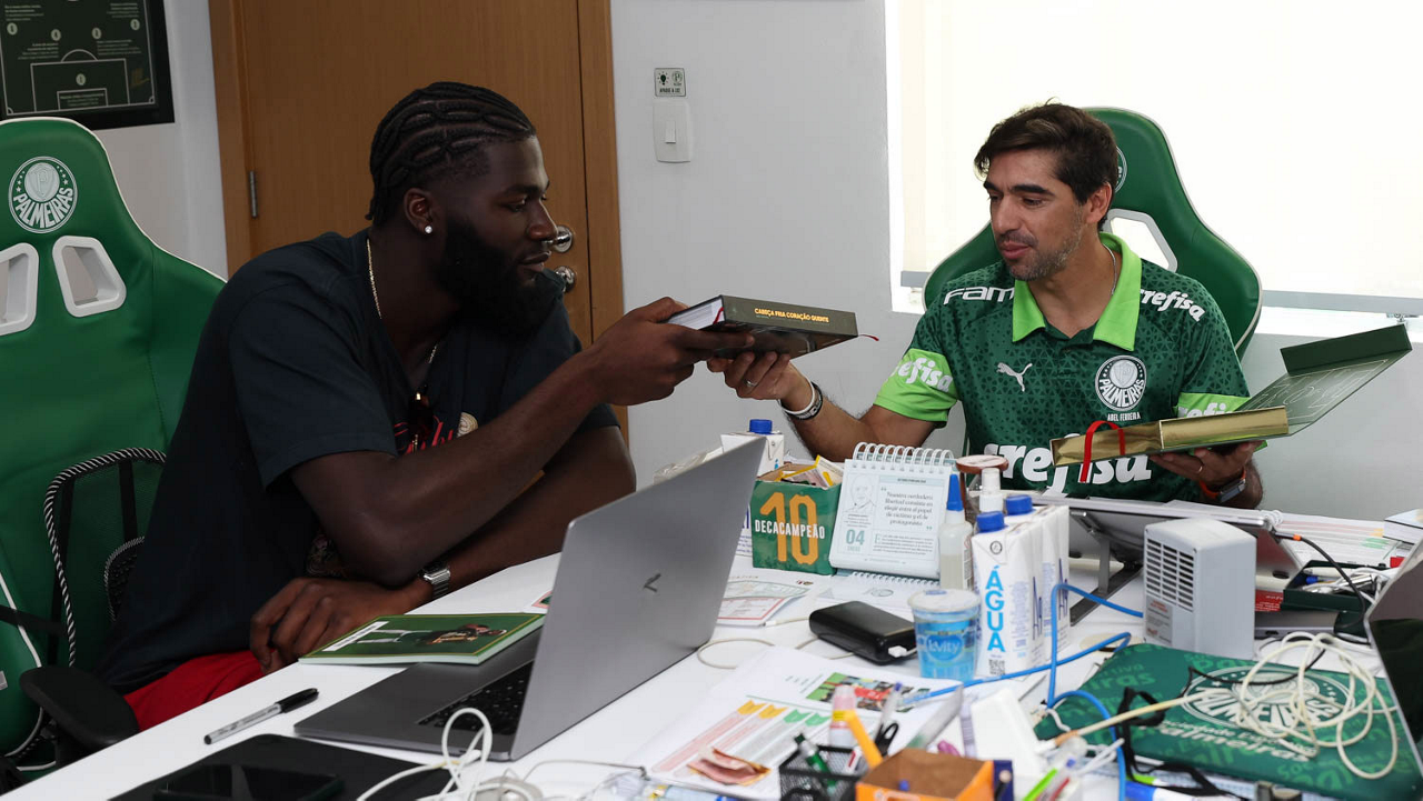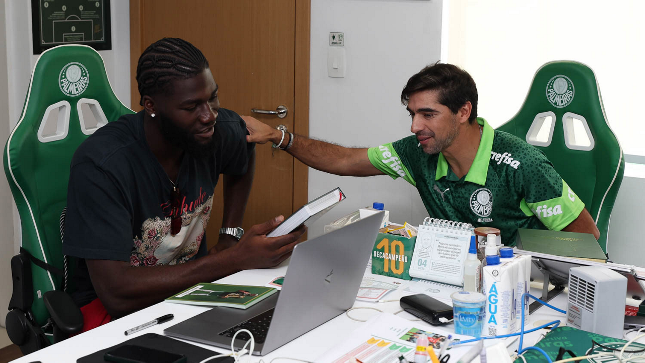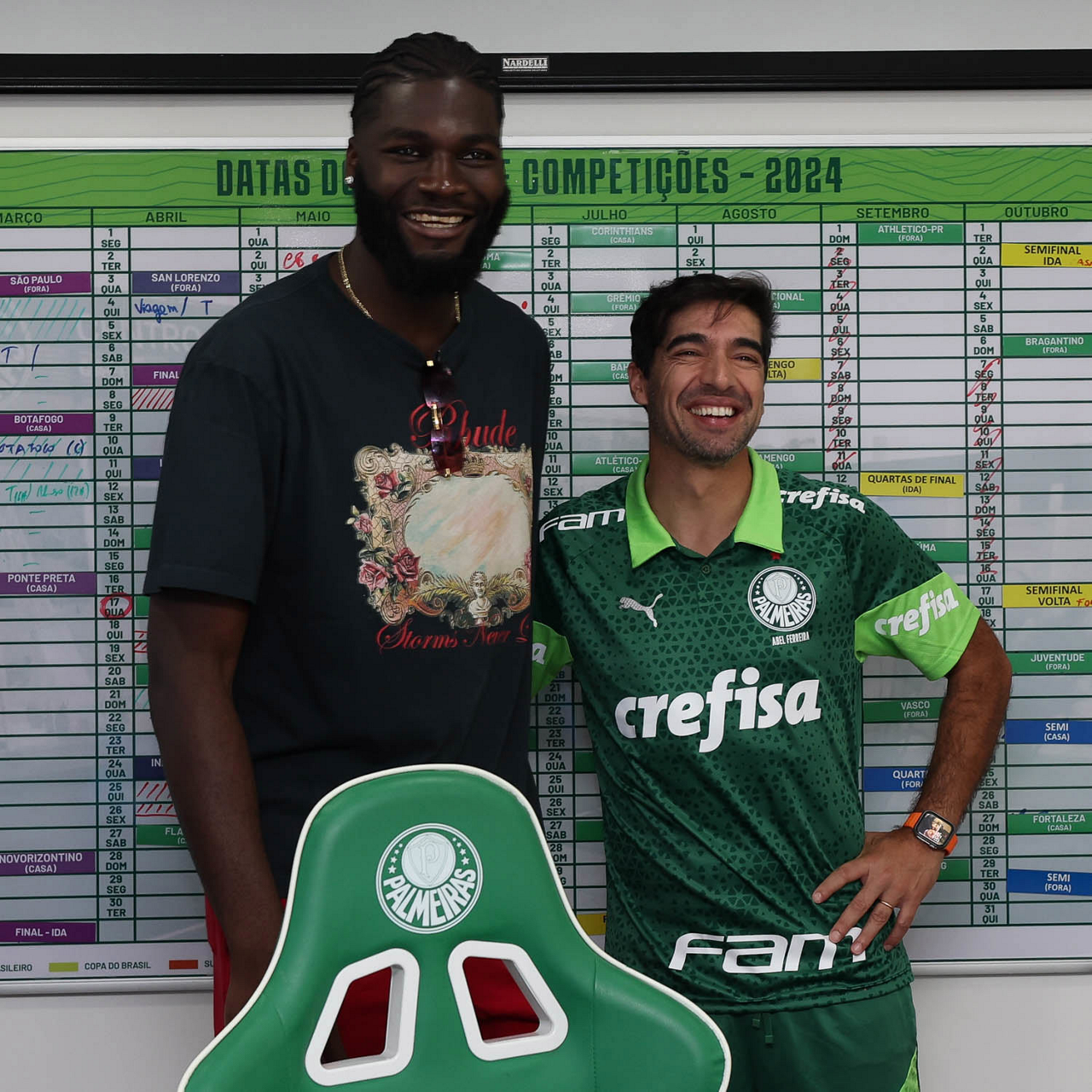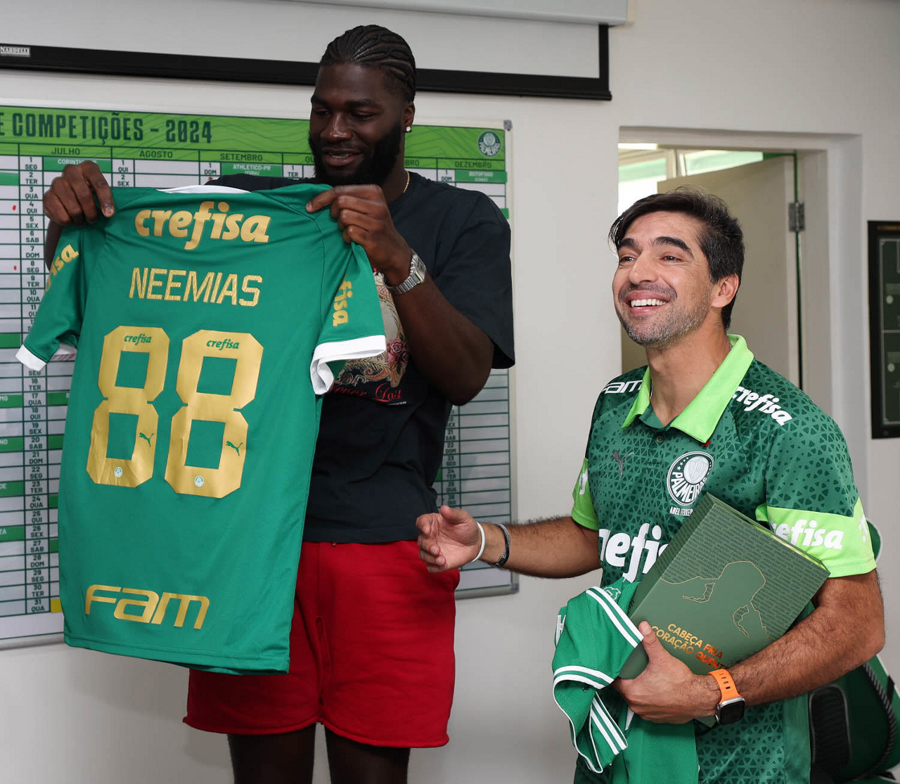 O técnico Abel Ferreira, da SE Palmeiras, recebe o jogador de basquete portugues campeão da NBA pelo Boston Celtics Neemias Queta, na Academia de Futebol. (Foto: Cesar Greco/Palmeiras/by Canon)