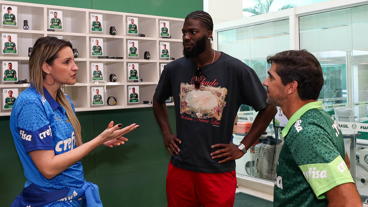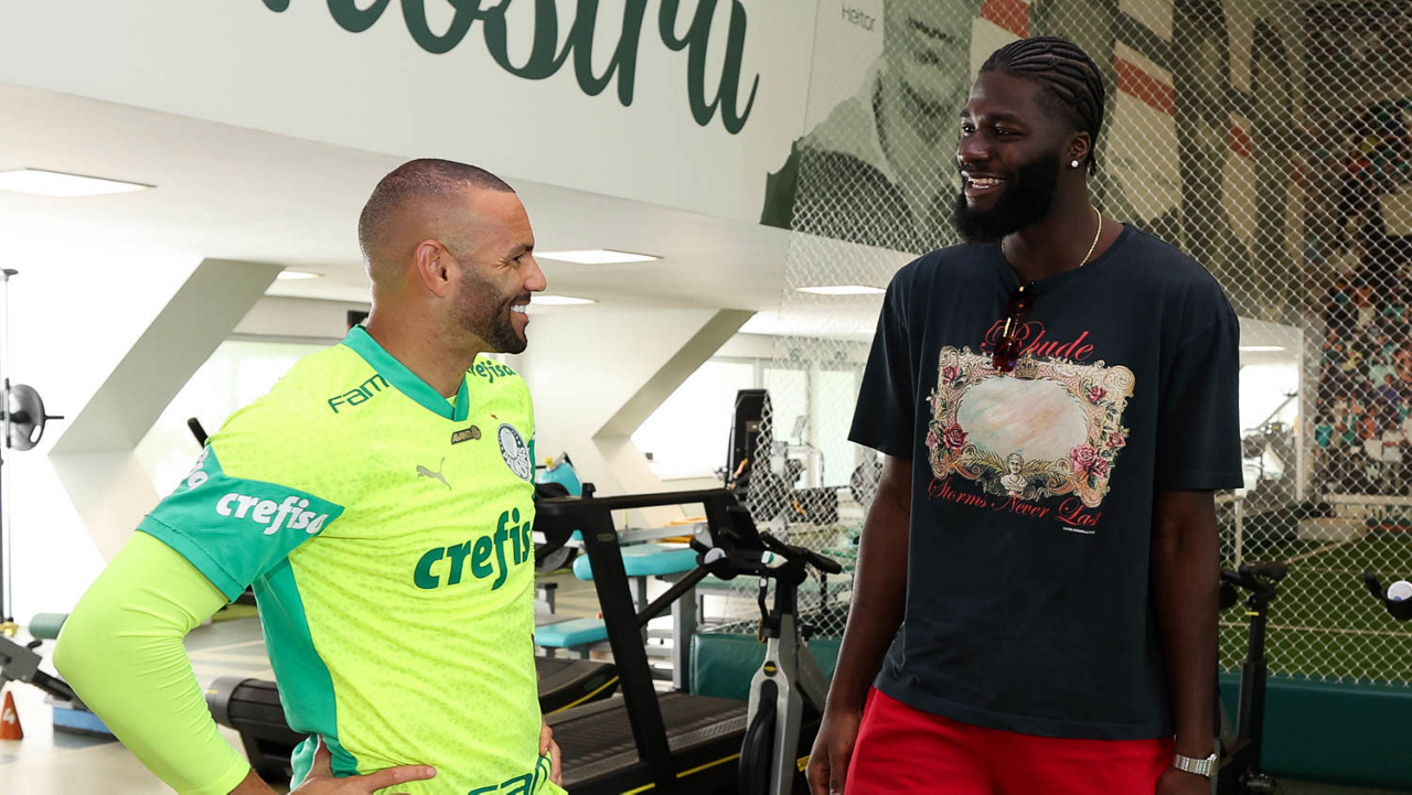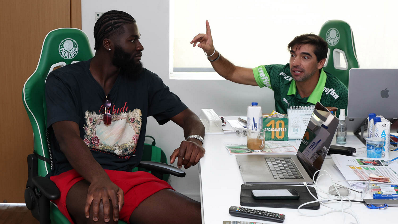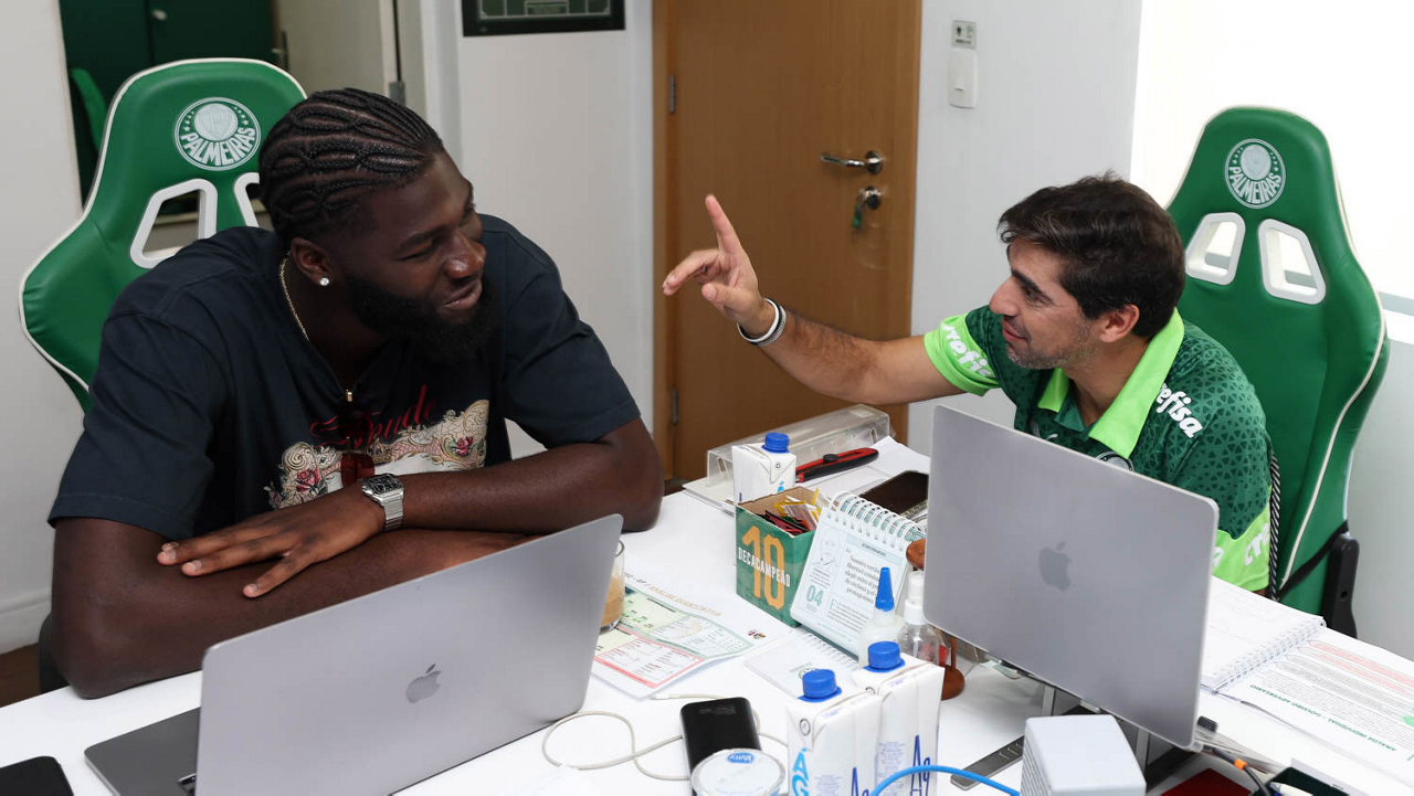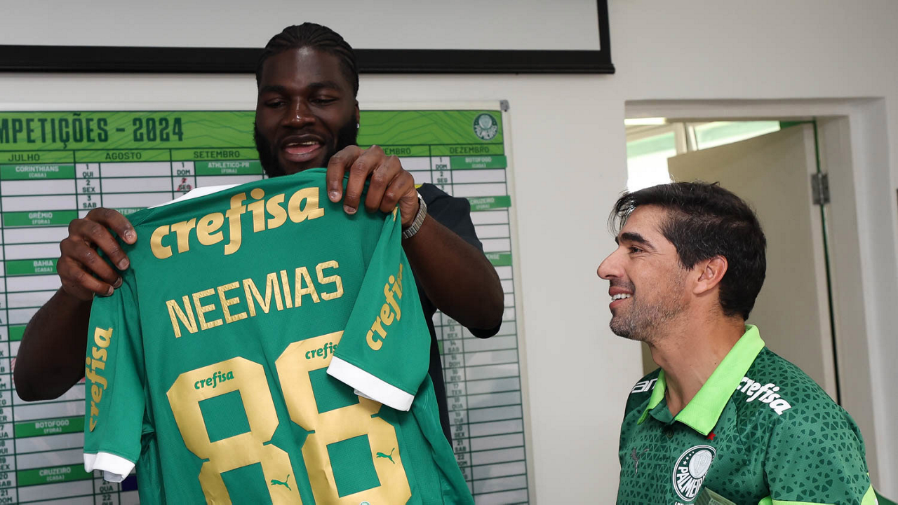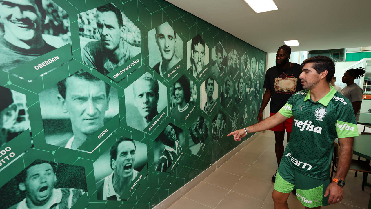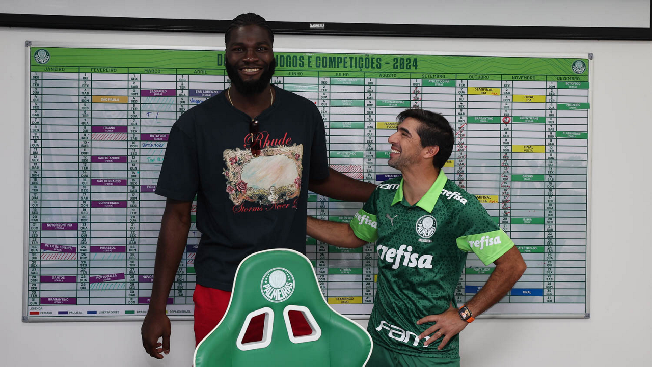 O técnico Abel Ferreira, da SE Palmeiras, recebe o jogador de basquete portugues campeão da NBA pelo Boston Celtics Neemias Queta, na Academia de Futebol. (Foto: Cesar Greco/Palmeiras/by Canon)