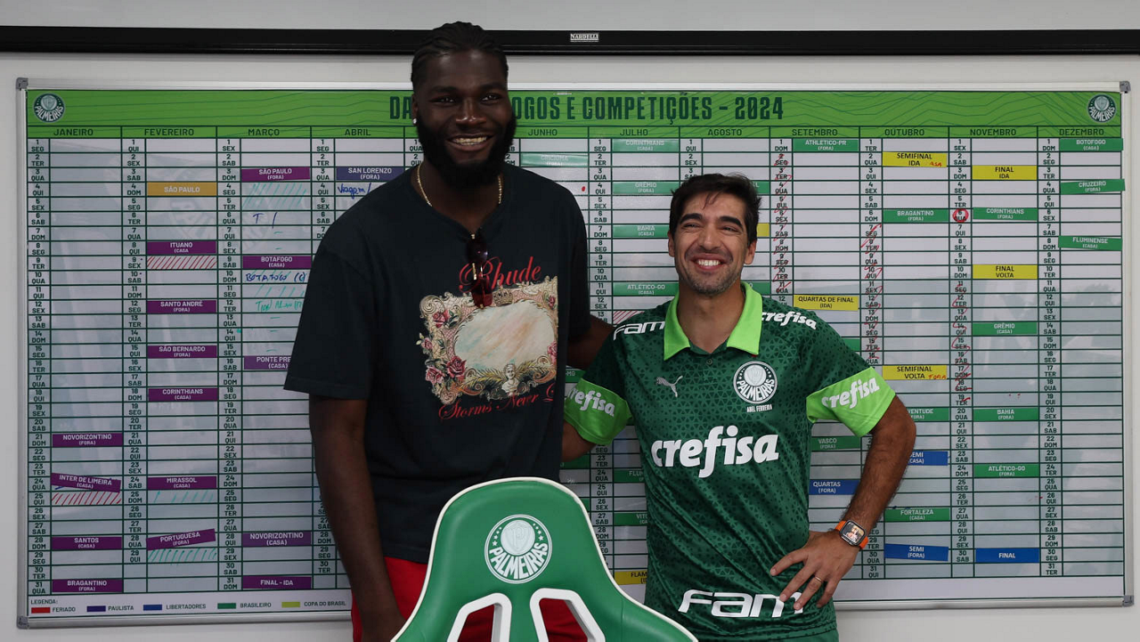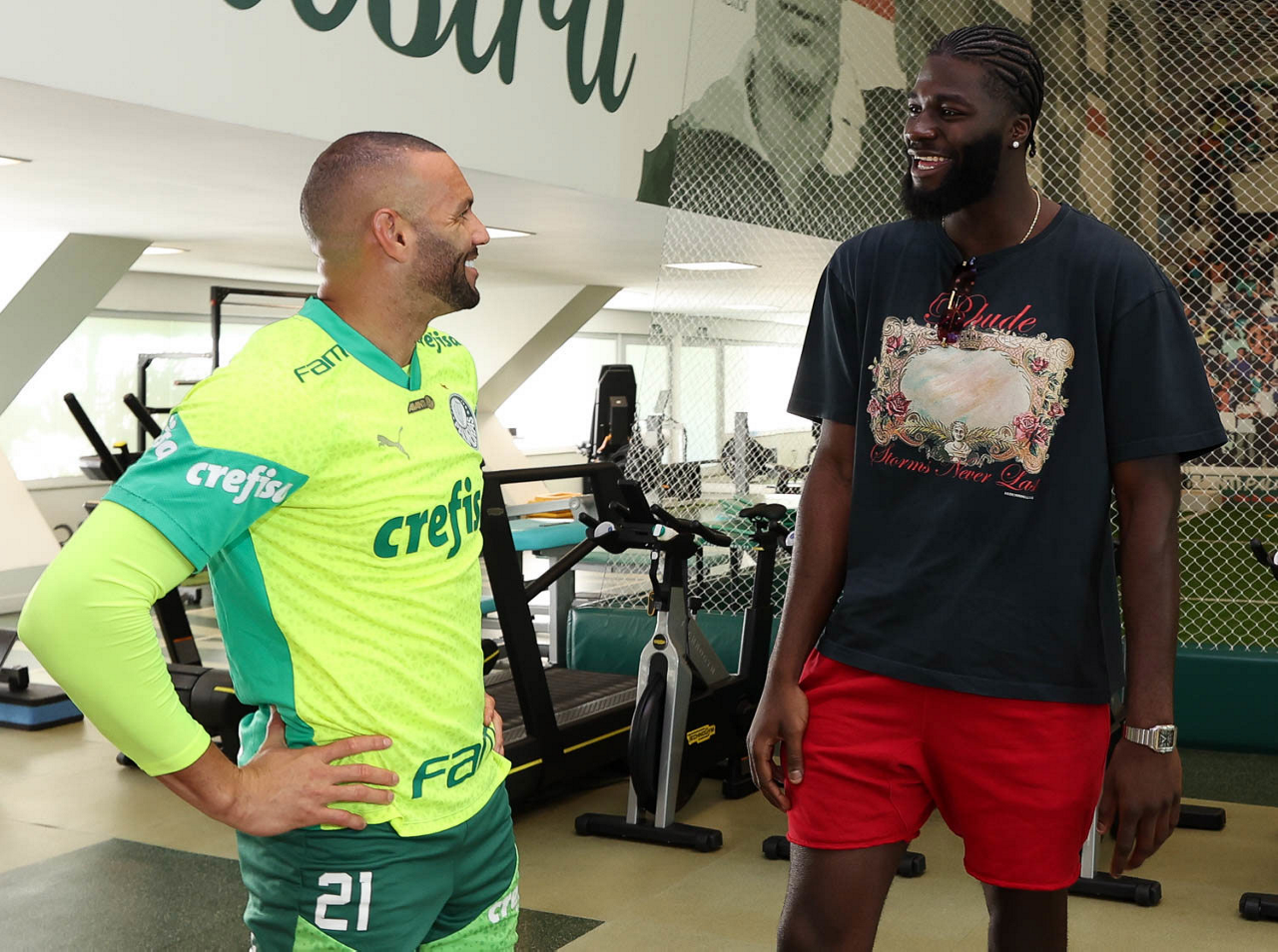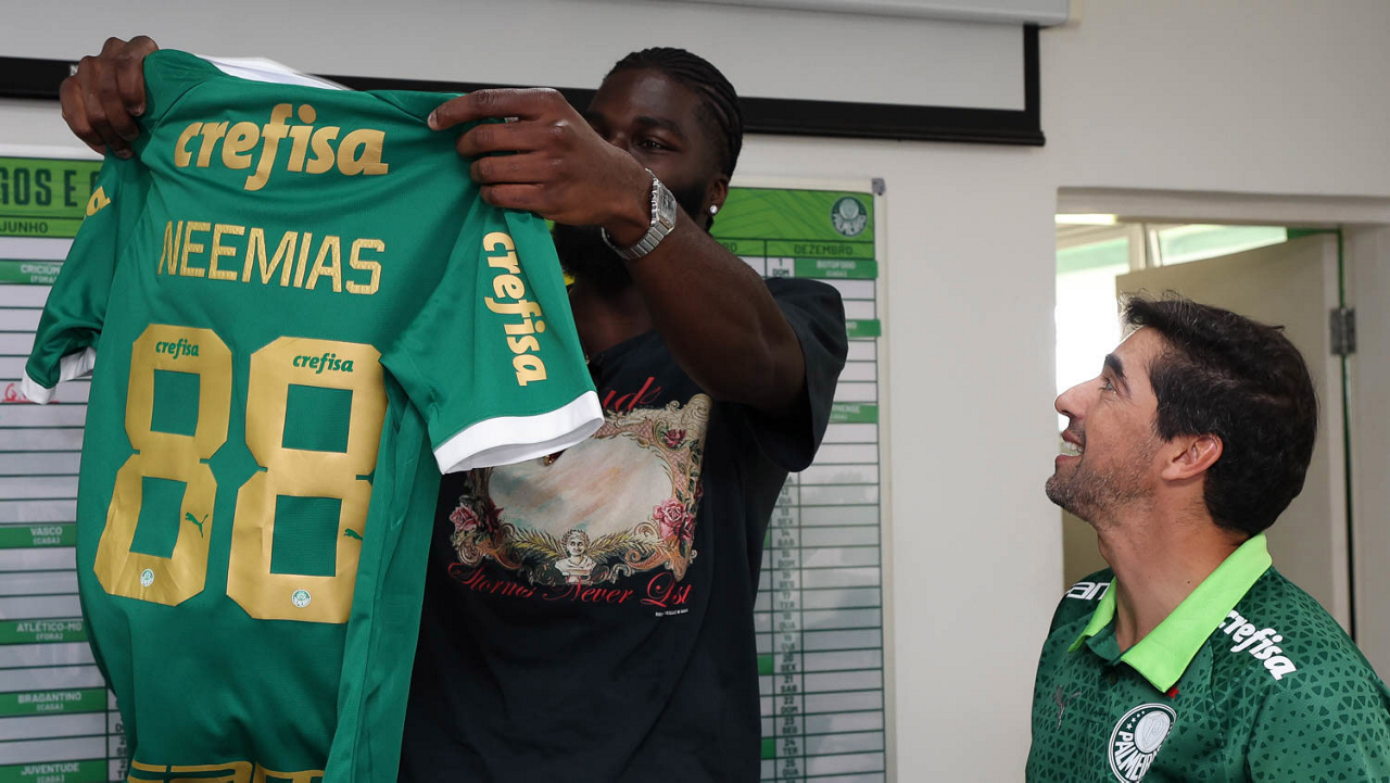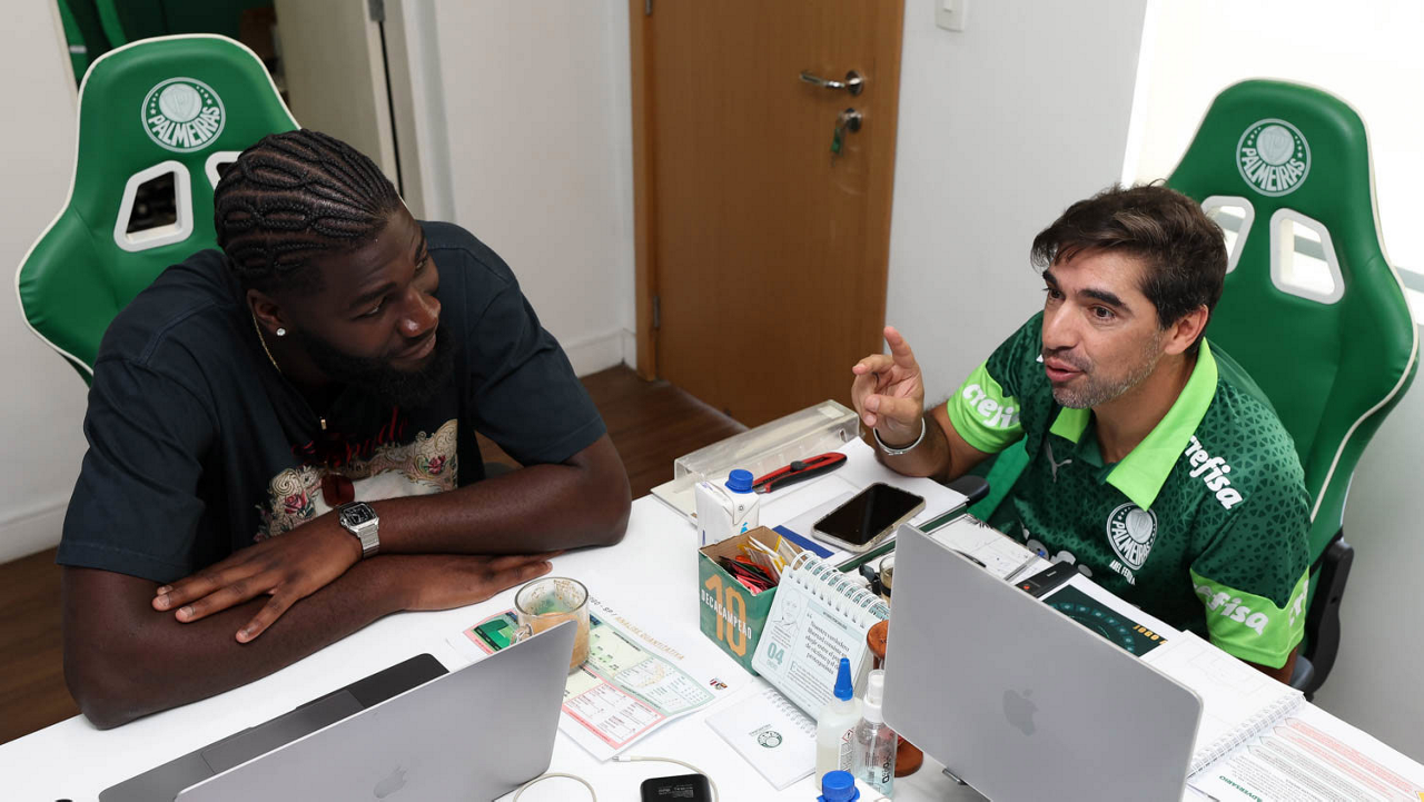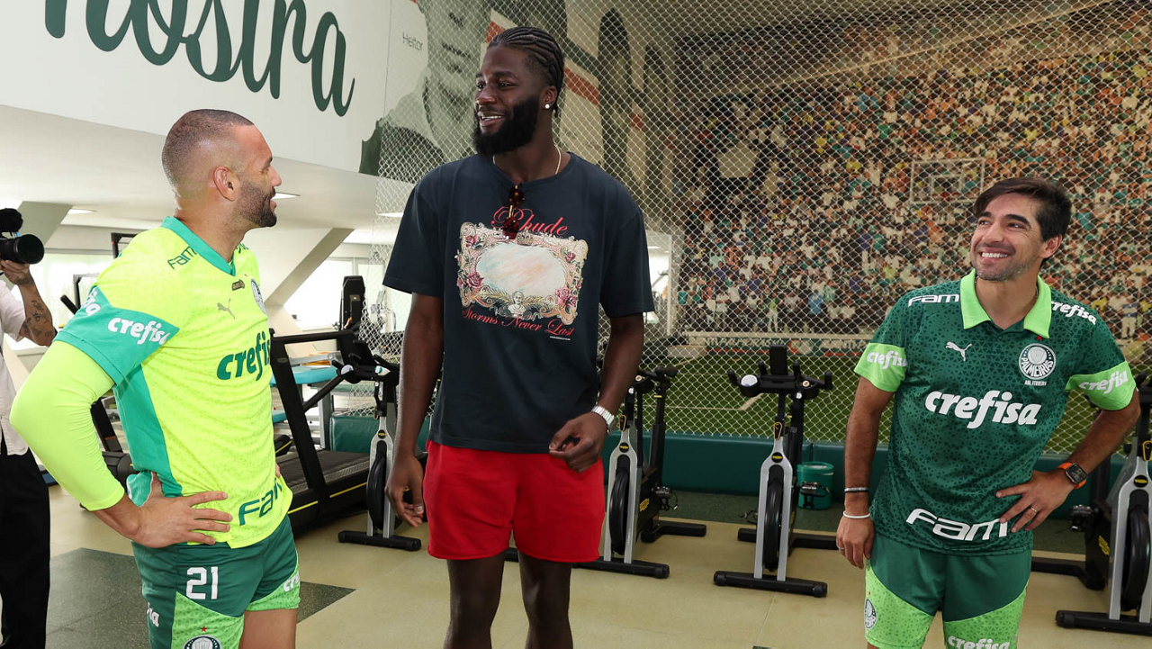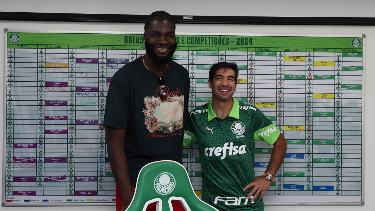 O técnico Abel Ferreira, da SE Palmeiras, recebe o jogador de basquete portugues campeão da NBA pelo Boston Celtics Neemias Queta, na Academia de Futebol. (Foto: Cesar Greco/Palmeiras/by Canon)