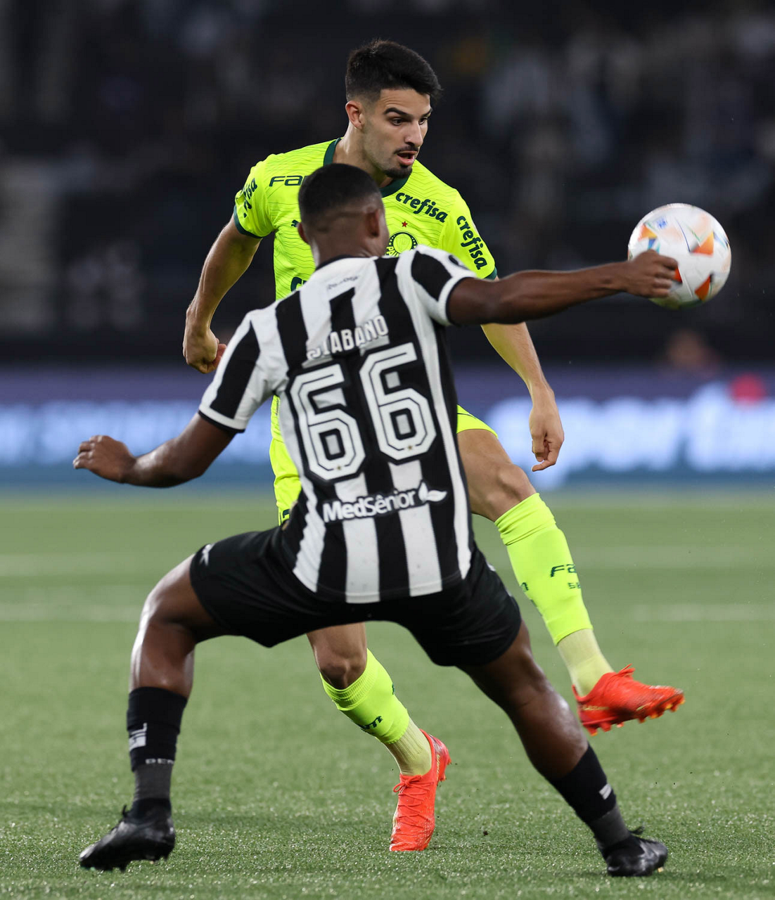 O jogador Estêvão, da SE Palmeiras, disputa bola com o jogdor do Botafogo FR, durante partida válida pelas oitavas de final, da Copa Libertadores, no Estádio Nilton Santos. (Foto: Cesar Greco/Palmeiras/by Canon)