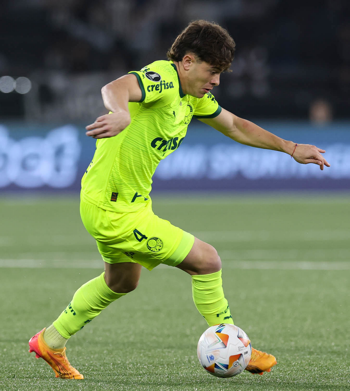 O jogador Estêvão, da SE Palmeiras, em jogo contra a equipe do Botafogo FR, durante partida válida pelas oitavas de final, da Copa Libertadores, no Estádio Nilton Santos. (Foto: Cesar Greco/Palmeiras/by Canon)