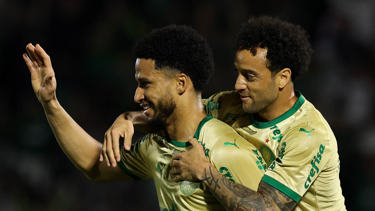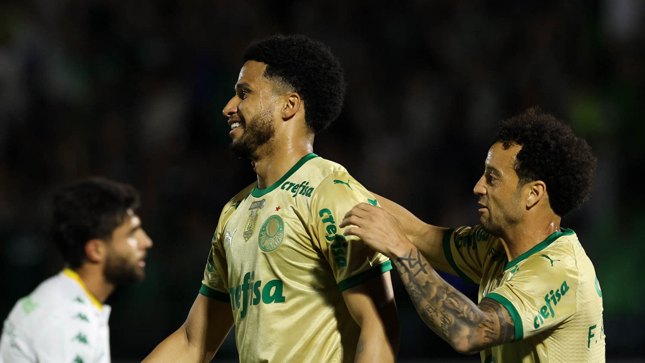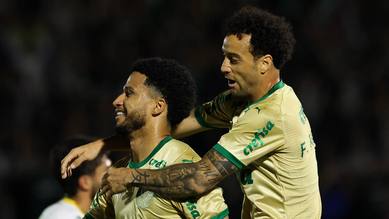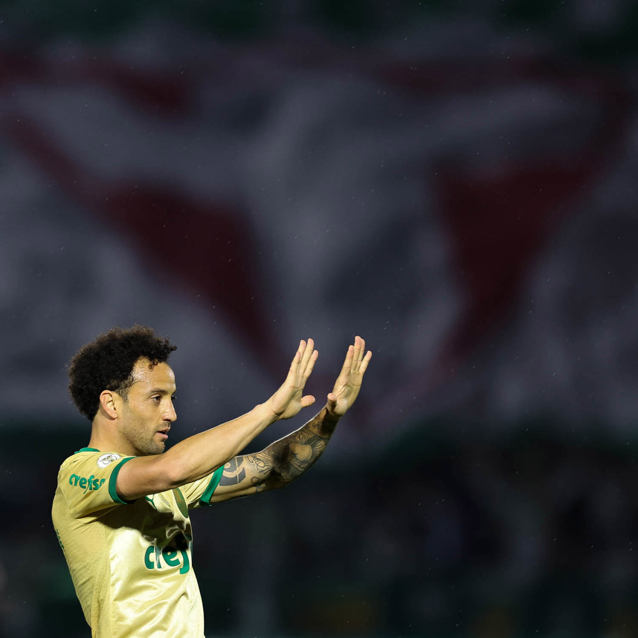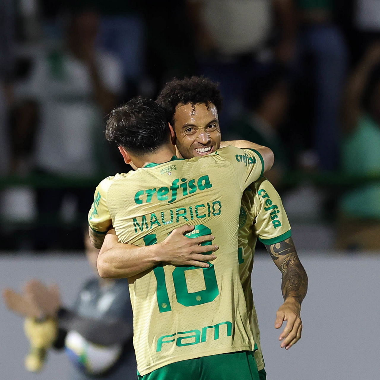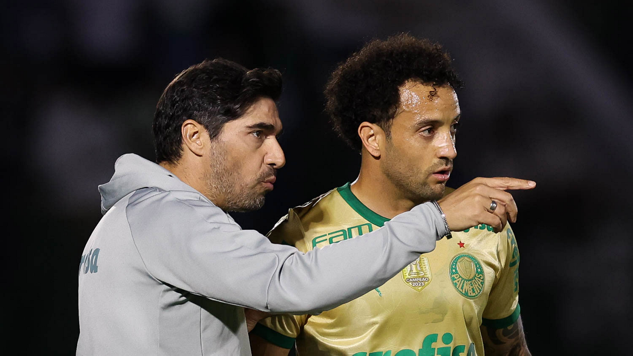O técnico Abel Ferreira e o jogador Felipe Anderson (D), da SE Palmeiras, em jogo contra a equipe do Cuiabá EC, durante partida válida pela vigésima quarta rodada, do Campeonato Brasileiro, Série A, no Estádio Brinco de Ouro. (Foto: Cesar Greco/Palmeiras/by Canon)