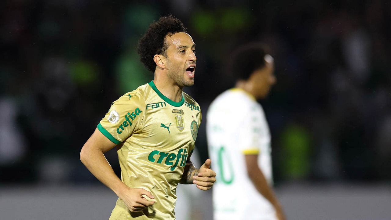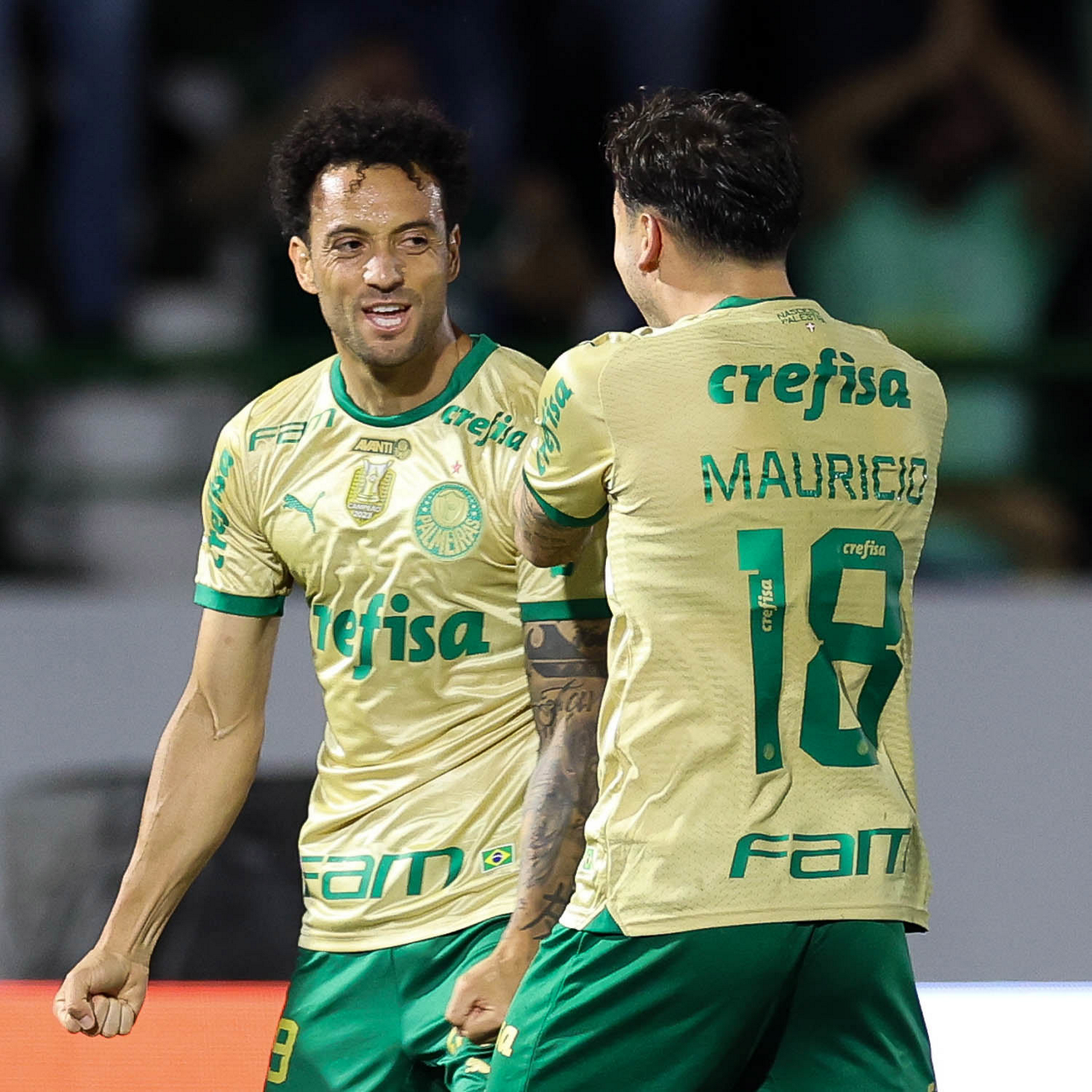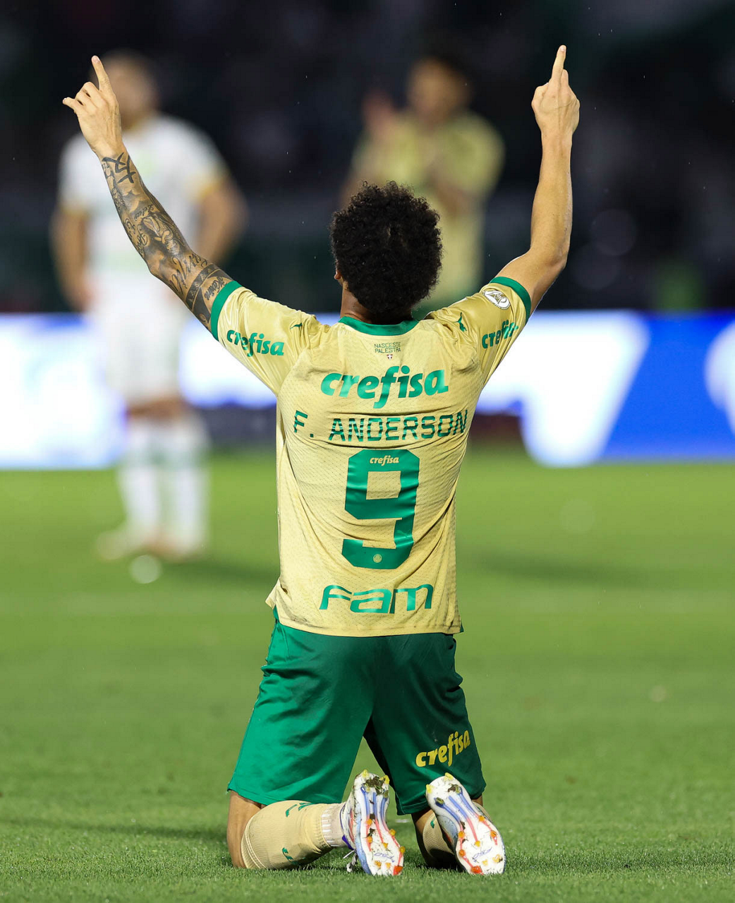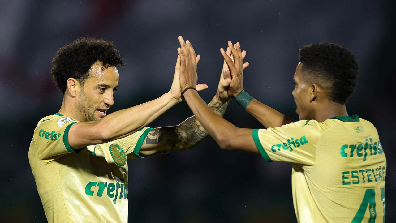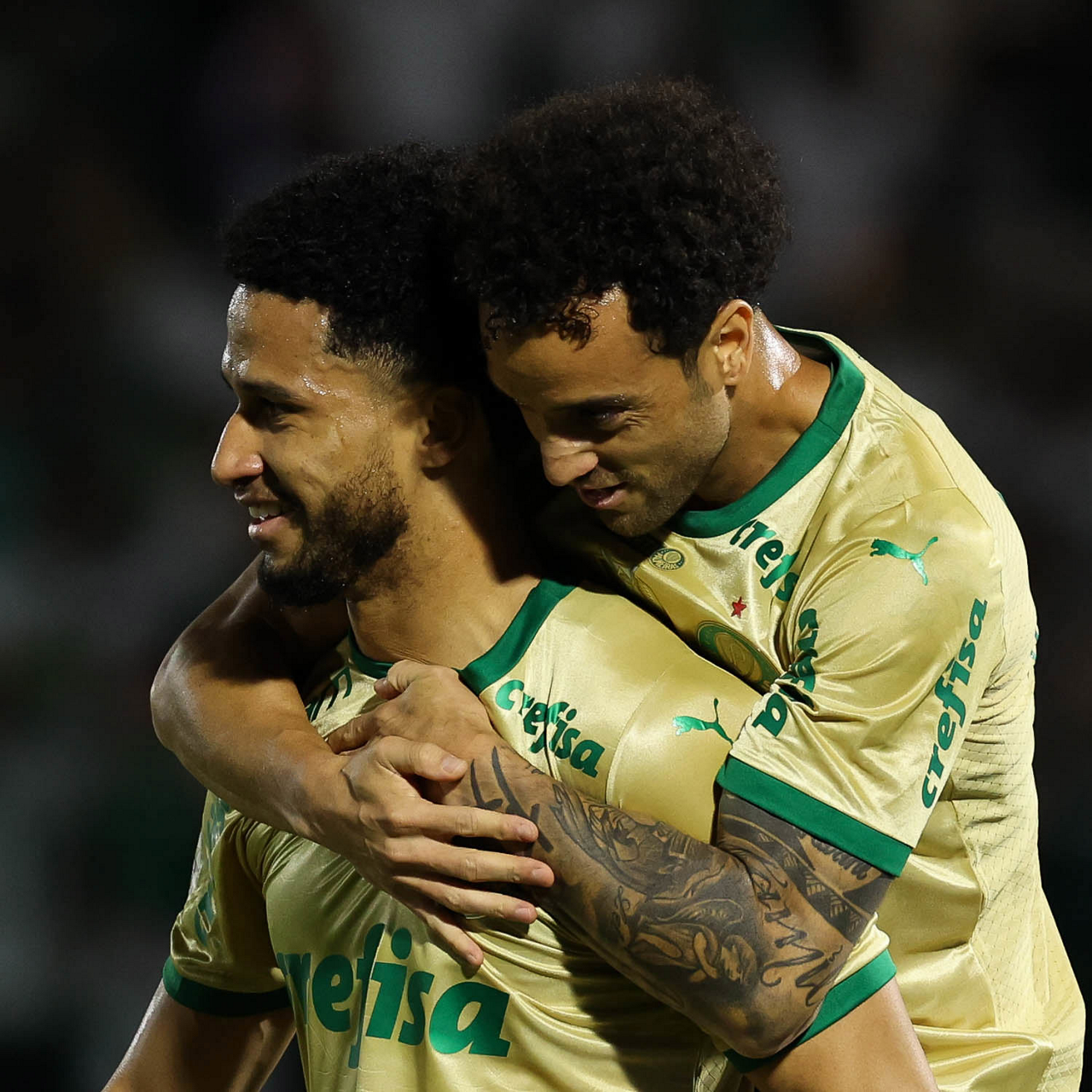 O técnico Abel Ferreira e o jogador Felipe Anderson (D), da SE Palmeiras, em jogo contra a equipe do Cuiabá EC, durante partida válida pela vigésima quarta rodada, do Campeonato Brasileiro, Série A, no Estádio Brinco de Ouro. (Foto: Cesar Greco/Palmeiras/by Canon)