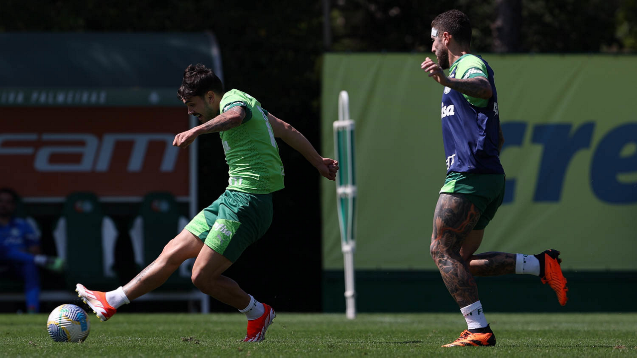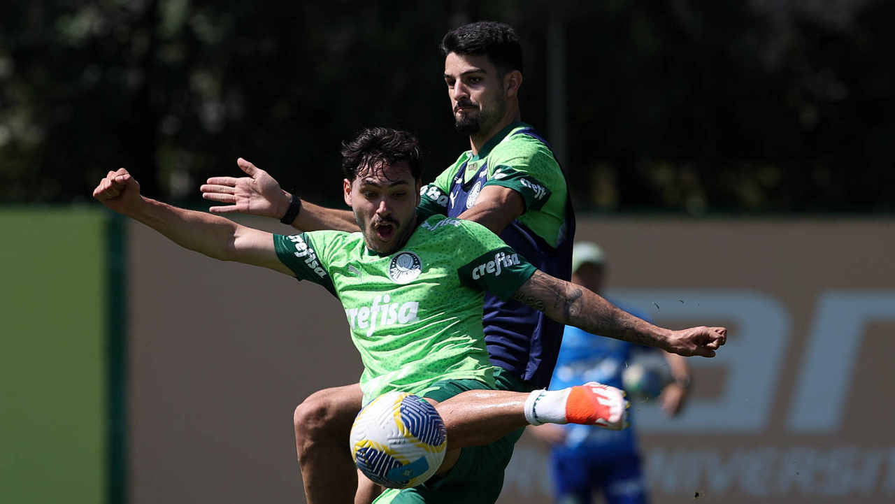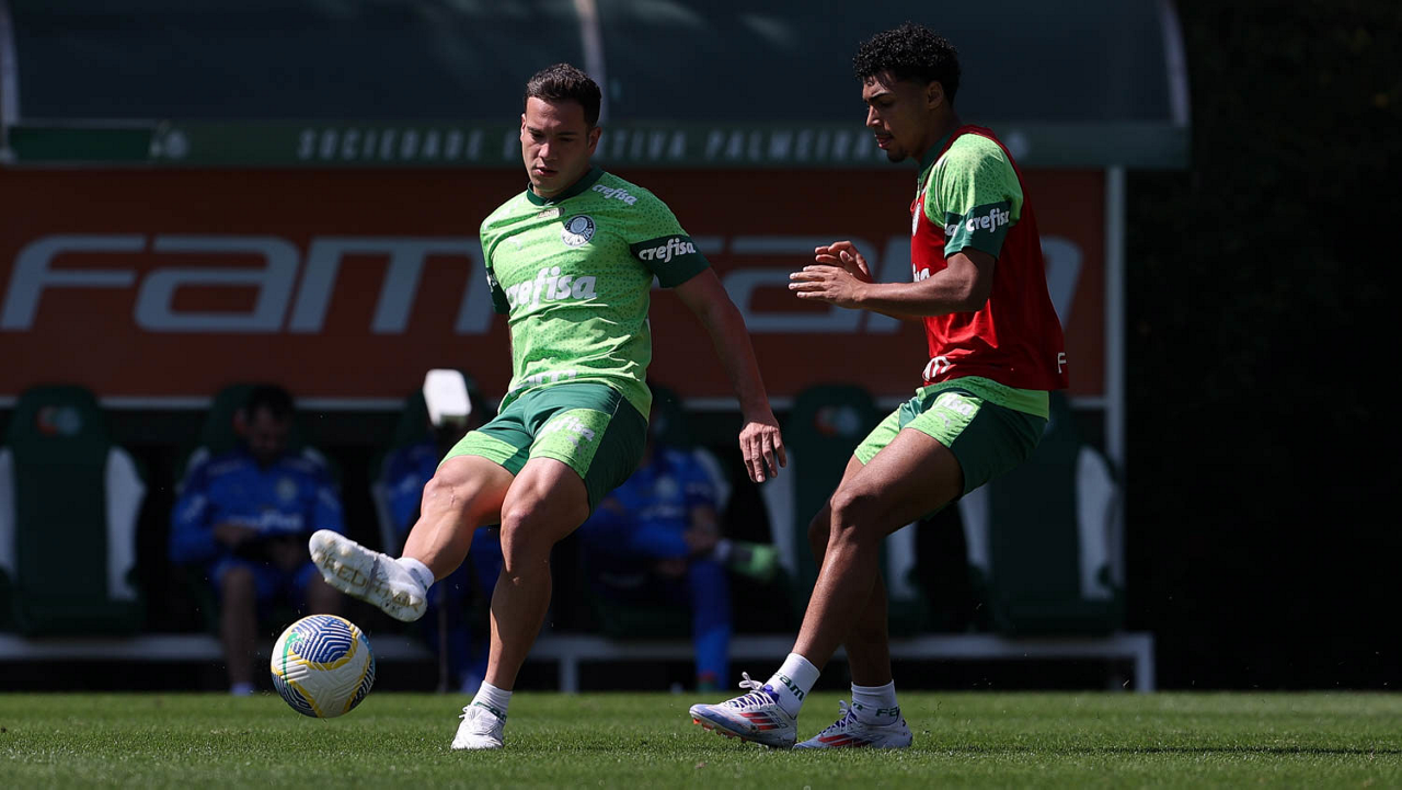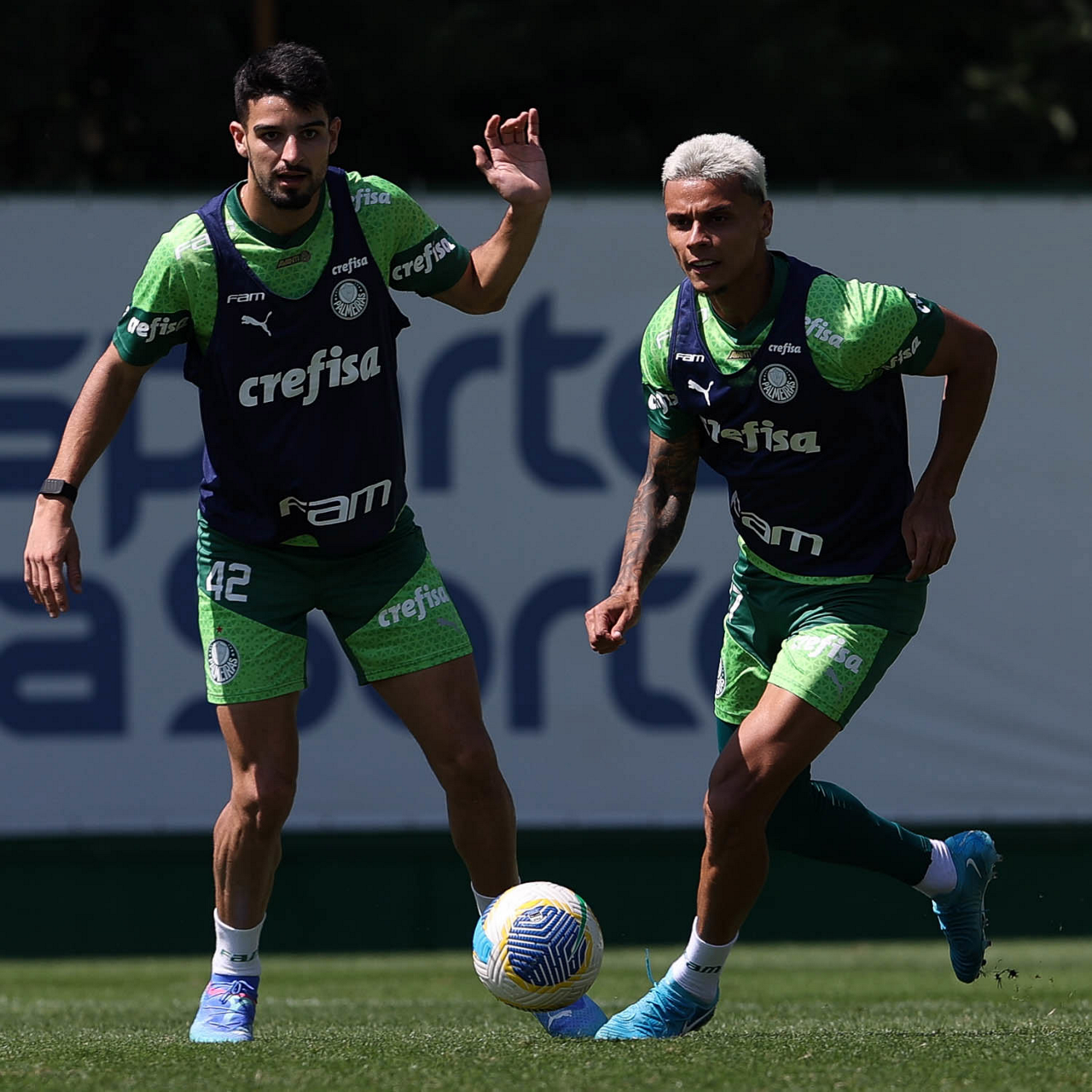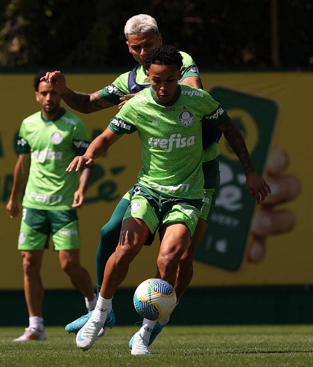 Os jogadores Richard Ríos e Lázaro (D), da SE Palmeiras, durante treinamento, na Academia de Futebol. (Foto: Cesar Greco/Palmeiras/by Canon)