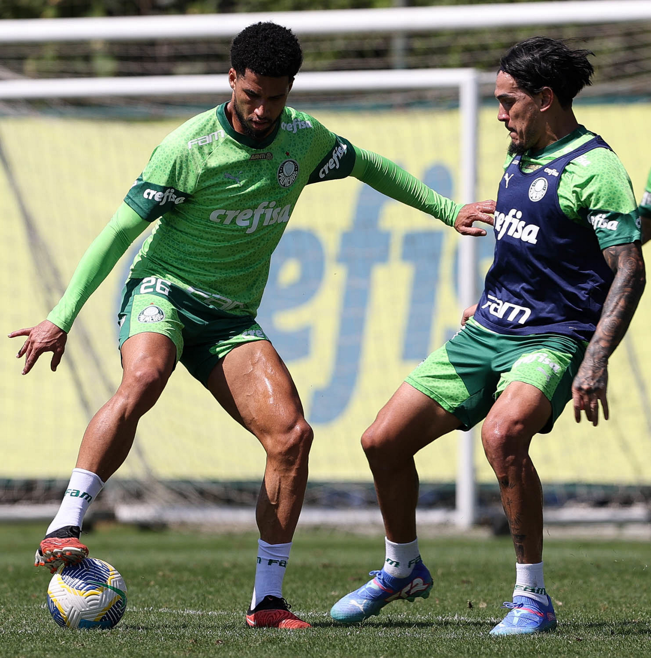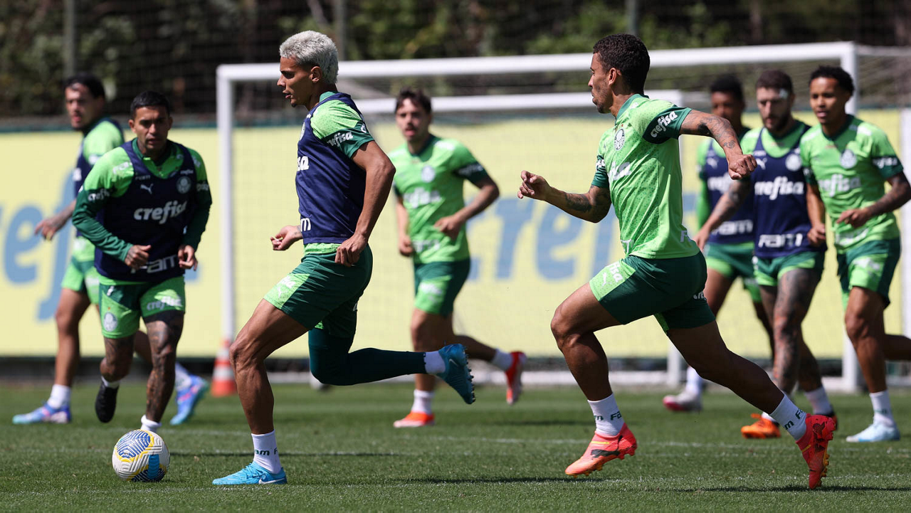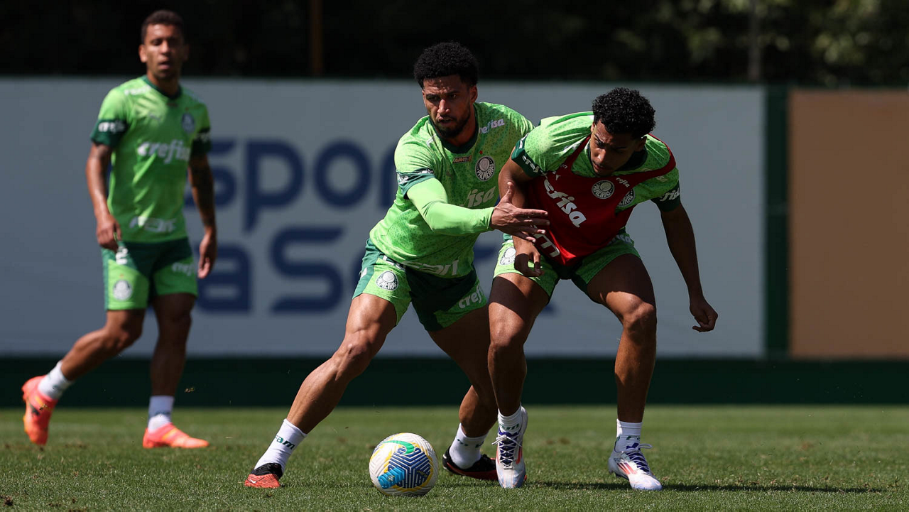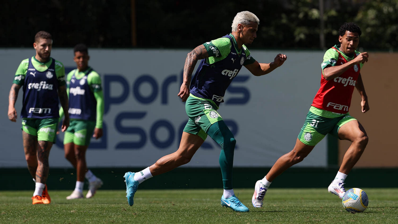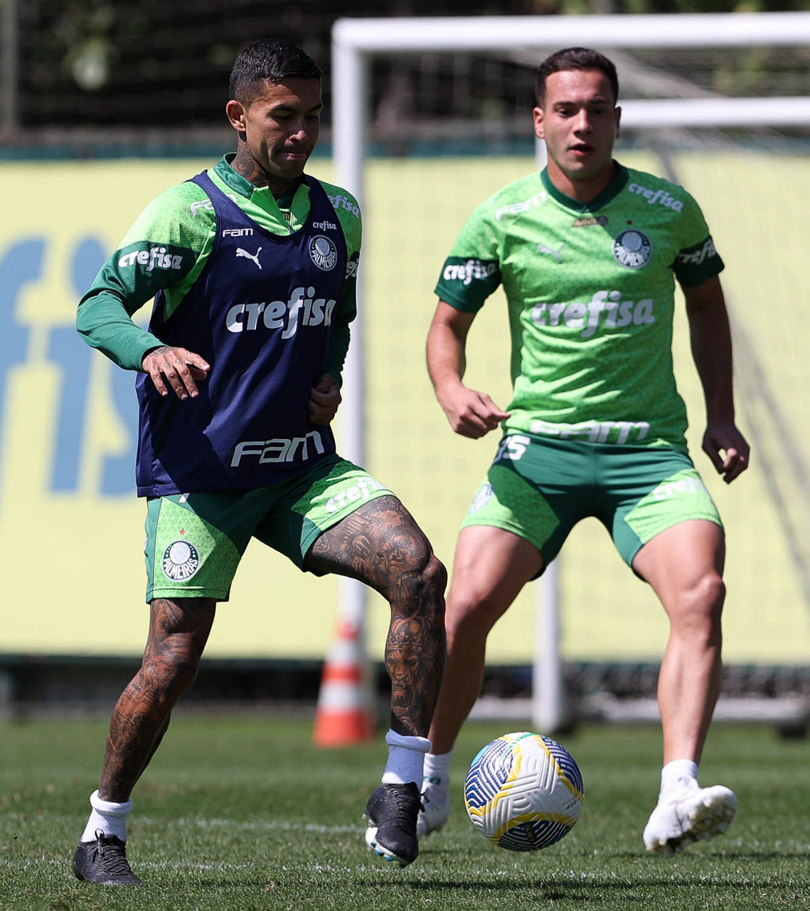 Os jogadores Richard Ríos e Lázaro (D), da SE Palmeiras, durante treinamento, na Academia de Futebol. (Foto: Cesar Greco/Palmeiras/by Canon)