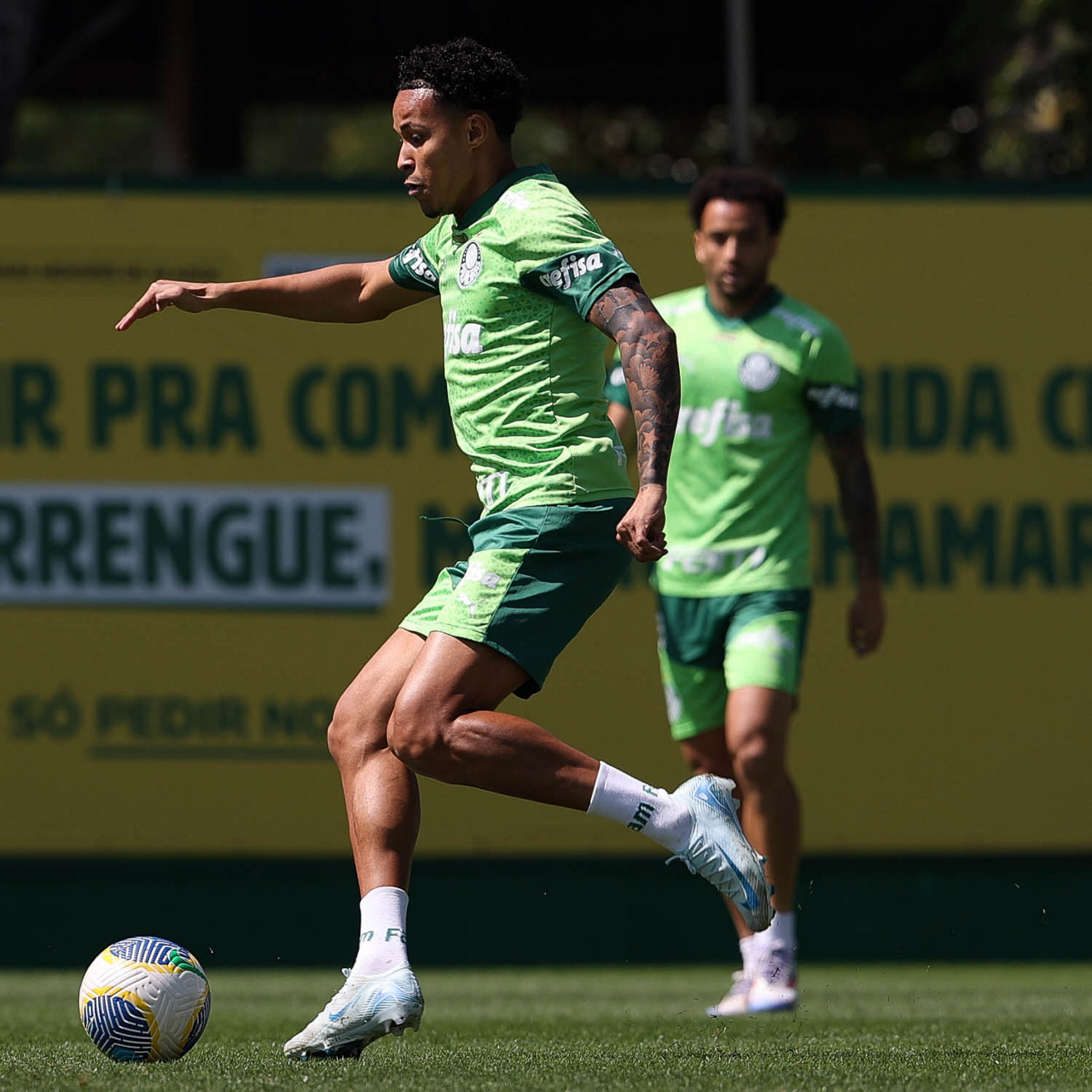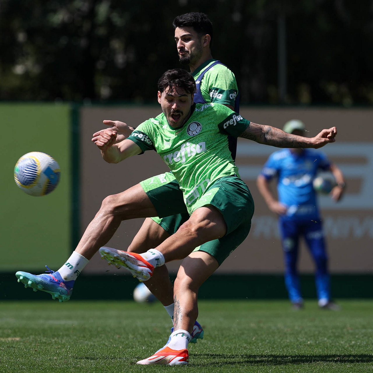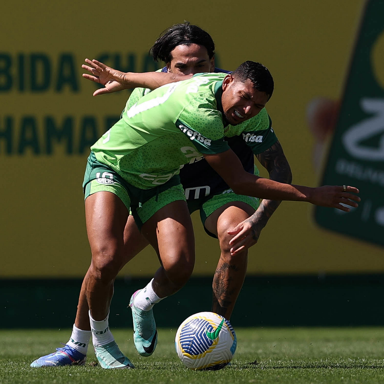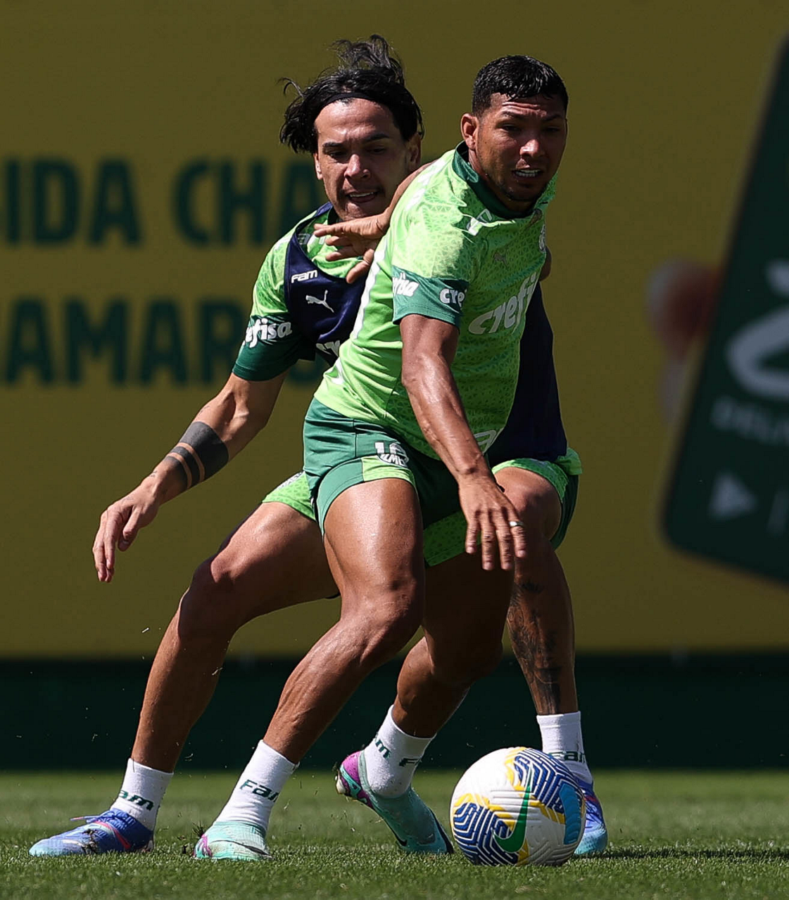 Os jogadores Richard Ríos e Lázaro (D), da SE Palmeiras, durante treinamento, na Academia de Futebol. (Foto: Cesar Greco/Palmeiras/by Canon)